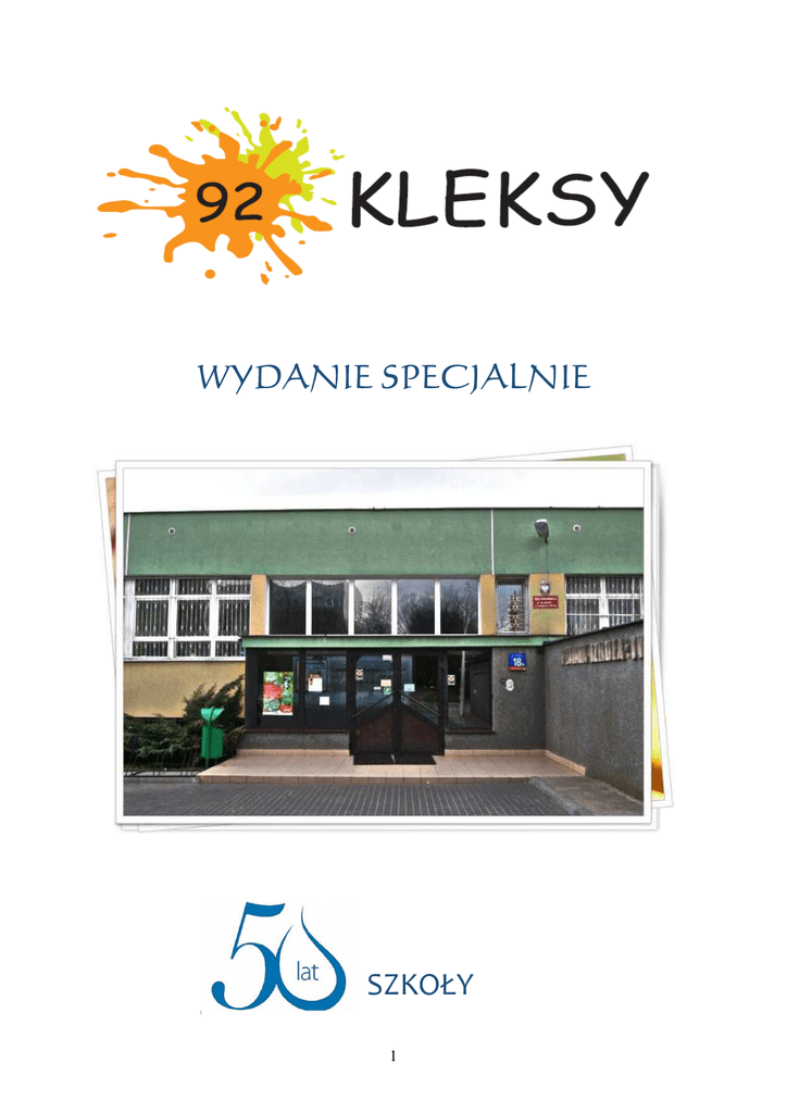 WYDANIE SPECJALNIE SZKOŁY 1 Magiczne pół wieku minęło… zostawiło wspomnienia, splatając ze sobą losy wielu wspaniałych nauczycieli, uczniów, rodziców. 50-lecie Szkoły to święto nas wszystkich, których te mury połączyły i wciąż łączą. Każde pokolenie ma tu nie tylko własną historię, ale i swoje przeżycia, doświadczenia, jakieś tajemnice, które opowiadane po latach nabierają rumieńców czułości i tej przysłowiowej łezki w oku. Nie sposób wszystkiego spamiętać, opowiedzieć też się nie da, choć już tyle słów padło przy okazji tak ważnego Święta. Jednak zawsze warto pamiętać, że to nasza Szkoła, która była i jest częścią życia małego człowieka. I to, co zapiszą w nim czas i ludzie, których spotkał, stanie się jego bogactwem, z jakim wyruszy w świat. W tym numerze gazetki chcemy otworzyć przed Wami drzwi naszej szkoły, zwiedzajcie ją, czytając tych kilka stron... 2 Z KART HISTORII 19.12.1964r. Kurator Oświaty i Wychowania podjął decyzję o utworzeniu nowej szkoły na osiedlu Zatrasie, przy ul. Przasnyskiej 18a i nadał jej numer 92. Pierwszy rok nauki w nowej „Tysiąclatce” rozpoczął się 1.09.1965r. w tym roku uczyło się tu około siedmiuset uczniów. 9.11.1967 roku nadano szkole imię Ernesto Guevary. Ambasada Kuby objęła patronat. Młodzież szkoły w ramach wymiany wyjeżdżała na Kubę, a szkoła gościła młodzież kubańską. Ostatni wyjazd miał miejsce w 1988 r. na zaproszenie Ministerstwa Kultury i Edukacji na Kubie, 40 osobowy chór wyjechał na 2 tygodniowe tournee koncertowe, były to dla dzieci niezapomniane wrażenia. Rok 1999 to rok, kiedy zaczęliśmy wdrażać reformę oświaty, z tradycyjnej „ośmiolatki” staliśmy się „sześciolatką”, zmienił się wiek naszych uczniów. Był to dobry moment na zmianę Patrona szkoły. Wybór całej społeczności szkolnej padł na Jana Brzechwę – poetę radości. Jego wiersze znamy wszyscy od dzieci po ludzi dorosłych. Nadanie imienia odbyło się w maju 2004r. 3 JAN BRZECHWA Nasz Patron Jan Brzechwa, a właściwie J. Leśmian, urodził się15 VIII 1900 w Żmerynce na Ukrainie, a zmarł 2 VII 1966 w Warszawie. Poeta, satyryk, tłumacz, publicysta. Pierwszy tom wierszy dla dzieci wydał 1937r. W 1955 otrzymał nagrodę miasta Warszawy za całokształt twórczości, a w 1956r - nagrodę Prezesa Rady Ministrów za twórczość dla dzieci i młodzieży, w 1965 - nagrodę Ministra Kultury i Sztuki I stopnia za całokształt twórczości. Poeta jest twórcą znakomitych wierszy dla dzieci, przede wszystkim utrzymanych w stylu satyryczno - żartobliwym, ale także poetyckich opowieści baśniowych. Odświeżył i przekształcił tradycyjne formy utworów dla dzieci bajkę zwierzęcą i powiastkę, wprowadzając do nich elementy satyry i groteski, urozmaicając je grą słów, opartą na zaskakującym skojarzeniu, paradoksie i nonsensie. Niemal wszystkie utwory wydane pojedynczo powtarzają się w wydaniach zbiorowych np.: „Brzechwa dzieciom”, „Bajki i baśnie”, „Sto bajek”. Znane są również motywy baśniowe przekształcone w sposób humorystyczny i przystępną formę wierszową np. „Na wyspach Bergamutach”, „Od baśni do baśni”, „Akademia pana Kleksa”. Bohaterowie ci zwiedzają wraz z panem Kleksem różne baśniowe królestwa, podróżują lądem, powietrzem, zwiedzają głębiny morza. Baśń przerobiona została na widowisko teatralne – „Bajki Samograjki” - zbiór powszechnie znanych, tradycyjnych baśni napisanych wierszem przez Brzechwę i wzbogaconych muzyką przez M. Janicza („Czerwony Kapturek”, „Kot w butach”, „Kopciuszek”) i S. Kisielewskiego („Jaś i Małgosia”). Śpiewane baśnie mogą być nie tylko lekturą dla młodszych dzieci, ale i umuzykalniającą zabawą. Jan Brzechwa pisał również wiersze o tematyce patriotycznej. Poniżej jeden z nich, zawarty w Biuletynie Powstańczym. 4 Z KRONIK SZKOLNYCH Najstarsza kronika opowiada o latach 1972/1976 i prawdopodobnie jest to kronika klasowa, kolejna dotyczy lat 1973/1975 i ostatnia, która jest kroniką całej szkoły opisuje lata 1976/1983. Z jednej wynika, że Szkoła Podstawowa Nr 92 w roku 1972 miała jedynie 18 sal lekcyjnych, 5 pracowni, salę gimnastyczną oraz 6 pomieszczeń mieszkalnych. Każdego roku, we wrześniu, odbywało się uroczyste ślubowanie klas pierwszych. 5 Na kolejnych stronach kronik uczniowie zamieszczali informacje dotyczące wydarzeń, które odbywały się w Szkole regularnie. Wśród nich były między innymi Spotkania z bajką, które prowadziła Pani Gołębiewska. Tematyka spotkań była bardzo zróżnicowana. Od żołnierskiej przez kulinarną, aż po przyrodniczą. Innym wydarzeniem był Miesiąc Dobroci dla Zwierząt, który co roku obchodzono w listopadzie. Z tej okazji zbierano pieniądze, które przykładowo w 1976 roku przekazano Towarzystwu Opieki nad Zwierzętami. Wykazując się ogromną empatią, każdego roku w grudniu uczniowie ogłaszali akcję O uśmiech dziecka, polegała ona na zbieraniu zabawek, które przekazywane były następnie do wybranego wcześniej Domu Dziecka. Oprócz akcji charytatywnych, uczniowie SP 92 podejmowali także szereg innych działań. Przykładowo: uczestniczyli w zawodach sportowych, prowadzili koło teatralne, brali udział w konkursach, chodzili na interesujące ich filmy do kina, sadzili drzewa wokół szkoły, prowadzili gazetkę szkolną. 6 DYREKTORZY SZKOŁY W ciągu 50 lat historii placówki funkcję tę pełniły kolejno trzy wspaniałe kobiety. Pierwszą z nich – w porządku chronologicznym – w latach 1965 – 1984 była mgr Anna Zdzieszyńska. Dyrektor Anna Zdzieszyńska w ostatnim dniu Swojej pracy z pożegnalnym bukietem z goździków. Dała się poznać jako dyrektor zaangażowany duszą i ciałem w budowę i rozwój szkoły. Osobiście doglądała wznoszących mury szkolne robotników. Wysoce kulturalna, ciepła i uśmiechnięta. Dbała o ucz