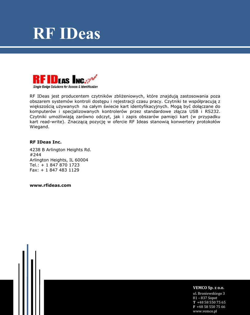 RF IDeas RF IDeas jest producentem czytników zbliŜeniowych, które znajdują zastosowania poza obszarem systemów kontroli dostępu i rejestracji czasu pracy. Czytniki te współpracują z większością uŜywanych na całym świecie kart identyfikacyjnych. Mogą być dołączane do komputerów i specjalizowanych kontrolerów przez standardowe złącza USB i RS232. Czytniki umoŜliwiają zarówno odczyt, jak i zapis obszarów pamięci kart (w przypadku kart read-write). Znaczącą pozycję w ofercie RF Ideas stanowią konwertery protokołów Wiegand. RF IDeas Inc. 4238 B Arlington Heights Rd. #244 Arlington Heights, IL 60004 Tel.: + 1 847 870 1723 Fax: + 1 847 483 1129 www.rfideas.com VEMCO Sp. z o.o. ul. Broniewskiego 3 81 – 837 Sopot T +48 58 550 75 65 F +48 58 550 75 66 www.vemco.pl