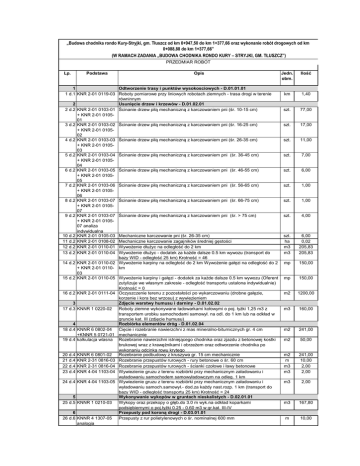 „Budowa chodnika rondo Kury-Stryjki, gm. Tłuszcz od km 0+947,50 do km 1+377,66 oraz wykonanie robót drogowych od km 0+088,88 do km 1+377,66” (W RAMACH ZADANIA „BUDOWA CHODNIKA RONDO KURY – STRYJKI, GM. TŁUSZCZ”) PRZEDMIAR ROBÓT Lp. Podstawa Opis Odtworzenie trasy i punktów wysokosciowych - D.01.01.01 1 1 d.1 KNR 2-01 0119-03 Roboty pomiarowe przy liniowych robotach ziemnych - trasa drogi w terenie równinnym Usunięcie drzew i krzewów - D.01.02.01 2 2 d.2 KNR 2-01 0103-01 Ścinanie drzew piłą mechaniczną z karczowaniem pni (śr. 10-15 cm) + KNR 2-01 010501 3 d.2 KNR 2-01 0103-02 Ścinanie drzew piłą mechaniczną z karczowaniem pni (śr. 16-25 cm) + KNR 2-01 010502 4 d.2 KNR 2-01 0103-03 Ścinanie drzew piłą mechaniczną z karczowaniem pni (śr. 26-35 cm) + KNR 2-01 010503 5 d.2 KNR 2-01 0103-04 Ścinanie drzew piłą mechaniczną z karczowaniem pni (śr. 36-45 cm) + KNR 2-01 010504 6 d.2 KNR 2-01 0103-05 Ścinanie drzew piłą mechaniczną z karczowaniem pni (śr. 46-55 cm) + KNR 2-01 010505 7 d.2 KNR 2-01 0103-06 Ścinanie drzew piłą mechaniczną z karczowaniem pni (śr. 56-65 cm) + KNR 2-01 010506 8 d.2 KNR 2-01 0103-07 Ścinanie drzew piłą mechaniczną z karczowaniem pni (śr. 66-75 cm) + KNR 2-01 010507 9 d.2 KNR 2-01 0103-07 Ścinanie drzew piłą mechaniczną z karczowaniem pni (śr. > 75 cm) + KNR 2-01 010507 analiza indywidualna 10 d.2 KNR 2-01 0105-03 Mechaniczne karczowanie pni (śr. 26-35 cm) 11 d.2 KNR 2-01 0108-02 Mechaniczne karczowanie zagajników średniej gęstości 12 d.2 KNR 2-01 0110-01 Wywożenie dłużyc na odległość do 2 km 13 d.2 KNR 2-01 0110-04 Wywożenie dłużyc - dodatek za każde dalsze 0.5 km wywozu (transport do bazy WID - odległość 25 km) Krotność = 46 14 d.2 KNR 2-01 0110-02 Wywożenie karpiny na odległość do 2 km Wywożenie gałęzi na odległość do 2 + KNR 2-01 0110- km 03 15 d.2 KNR 2-01 0110-05 Wywożenie karpiny i gałęzi - dodatek za każde dalsze 0.5 km wywozu (Oferent zutylizuje we własnym zakresie - odległość transportu ustalona indywidualnie) Krotność = 0 16 d.2 KNR 2-01 0111-04 Oczyszczenie terenu z pozostałości po wykarczowaniu (drobne gałęzie, korzenie i kora bez wrzosu) z wywiezieniem 3 Zdjęcie warstwy humusu i darniny - D.01.02.02 17 d.3 KNNR 1 0220-02 Roboty ziemne wykonywane ładowarkami kołowymi o poj. łyżki 1,25 m3 z transportem urobku samochodami samowył. na odl. do 1 km lub na odkład w gruncie kat. III (zdjęcie humusu) 4 Rozbiórka elementów dróg - D.01.02.04 18 d.4 KNNR 6 0802-04 Cięcie i rozebranie nawierzchni z mas mineralno-bitumicznych gr. 4 cm +KNNR 5 0721-01 mechanicznie 19 d.4 kalkulacja wlasna Rozebranie nawierzchni istniejącego chodnika oraz zjazdu z betonowej kostki brukowej wraz z krawężnikami i obrzeżem oraz odtworzenie chodnika po wykonaniu odcinka rowu krytego 20 d.4 KNNR 6 0801-02 Rozebranie podbudowy z kruszywa gr. 15 cm mechanicznie 21 d.4 KNR 2-31 0816-03 Rozebranie przepustów rurowych - rury betonowe o śr. 60 cm 22 d.4 KNR 2-31 0816-04 Rozebranie przepustów rurowych - ścianki czołowe i ławy betonowe 23 d.4 KNR 4-04 1103-04 Wywiezienie gruzu z terenu rozbiórki przy mechanicznym załadowaniu i wyładowaniu samochodem samowyładowczym na odleg. 1 km 24 d.4 KNR 4-04 1103-05 Wywiezienie gruzu z terenu rozbiórki przy mechanicznym załadowaniu i wyładowaniu samoch.samowył.- dod.za każdy nast.rozp. 1 km (transport do bazy WID - odległość transportu 25 km) Krotność = 24 Wykonywanie wykopów w gruntach nieskalistych - D.02.01.01 5 25 d.5 KNNR 1 0210-03 Wykopy oraz przekopy o głęb.do 3.0 m wyk.na odkład koparkami podsiębiernymi o poj.łyżki 0.25 - 0.60 m3 w gr.kat. III-IV Przepusty pod koroną drogi - D.03.01.01 6 Przepusty z rur polietylenowych o śr. nominalnej 600 mm 26 d.6 KNNR 4 1307-05 analogia Jedn. obm. Ilość km 1,40 szt. 77,00 szt. 17,00 szt. 11,00 szt. 7,00 szt. 6,00 szt. 1,00 szt. 1,00 szt. 4,00 szt. ha m3 m3 6,00 0,02 205,83 205,83 mp 150,00 mp 150,00 m2 1200,00 m3 160,00 m2 241,00 m2 50,00 m2 m m3 m3 241,00 10,00 2,00 2,00 m3 2,00 m3 167,80 m 10,00 27 d.6 KNNR 6 0605-05 28 d.6 KNNR 4 1307-03 analogia 29 d.6 KNNR 6 0605-03 30 d.6 KNNR 6 0605-01 31 d.6 KSNR 11 0501-05 7 32 d.7 KNNR 4 1308-03 33 d.7 KNNR 4 1424-02 36 d.7 KNNR 11 0501-05 37 d.7 KNNR 1 0214-04 Przepusty rurowe pod zjazdami - ścianki czołowe dla rur o średnicy 60 cm Przepusty z rur polietylenowych o śr. nominalnej 400 mm szt m 2,00 60,00 szt Przepusty rurowe pod zjazdami - ścianki czołowe dla rur o średnicy 40 cm Przepusty rurowe pod zjazdami - ławy fundamentowe żwirowe m3 m3 Podłoża i obsypki z kruszyw naturalnych dowiezionych Odwodnienie - D.03.02.01 Kanały z rur PVC łączonych na wcisk o śr. zewn. 200 mm m Studzienki ściekowe uliczne betonowe o śr.500 mm z osadnikiem bez syfonu szt. Podłoża i obsypki z kruszyw naturalnych dowiezionych m3 m3 Zasypanie wykopów .fund.podłużnych,punktowych,rowów,wykopów obiektowych spycharkami z zagęszcz.mechanicznym ubijakami (gr.warstwy w stanie luźnym 35 cm) - kat.gr. I-II 8 Koryto wraz z profilowaniem i zagęszczaniem podłoża - D.04.01.01 38 d.8 KNNR 6 0101-01 Koryta wykonywane mechanicznie gł. 10 cm w gruncie kat. II-VI na całej m2 szerokości jezdni i chodników (pod chodnikami) 39 d.8 KNNR 6 0101-02 Koryta wykonywane mechanicznie gł. 20 cm w gruncie kat. II-VI na całej m2 szerokości jezdni i chodników (pod zjazdami) Podbudowa z kruszywa łamanego stabilizowanego mechanicznie - D.04.04.02 9 40 d.9 KNNR 6 0103-03 Profilowanie i zagęszczanie podłoża wykonywane mechanicznie w gruncie kat. m2 II-IV pod warstwy konstrukcyjne nawierzchni m2 41 d.9 KNNR 6 0113-01 Warstwa dolna podbudowy z kruszyw łamanych gr. 15 cm (10 cm) Krotność = 0.67 42 d.9 KNNR 6 0113-06 Warstwa górna podbudowy z kruszyw łamanych gr. 15 cm m2 43 d.9 KNNR 6 0113-06 Warstwa górna podbudowy z kruszyw łamanych gr. 15 cm (30 cm) Krotność = m2 2 Podbudowa z betonu asfaltowego - D.04.07.01 10 44 d.10 KNNR 6 0110-03 Podbudow