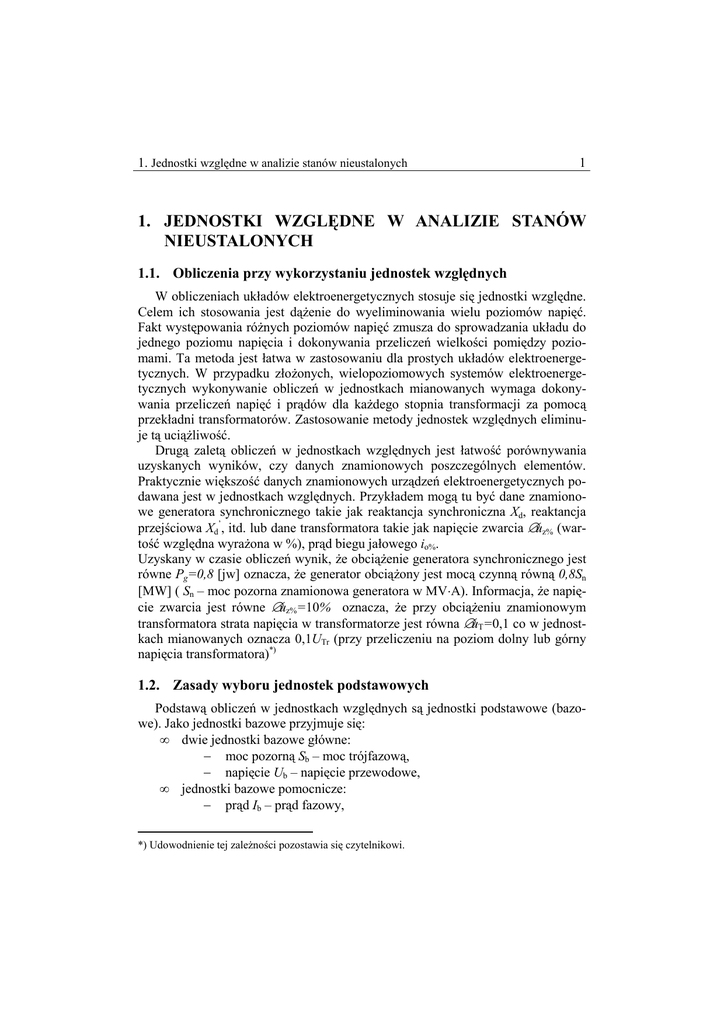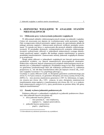 1. Jednostki względne w analizie stanów nieustalonych 1 1. JEDNOSTKI WZGLĘDNE W ANALIZIE STANÓW NIEUSTALONYCH 1.1. Obliczenia przy wykorzystaniu jednostek względnych W obliczeniach układów elektroenergetycznych stosuje się jednostki względne. Celem ich stosowania jest dąŜenie do wyeliminowania wielu poziomów napięć. Fakt występowania róŜnych poziomów napięć zmusza do sprowadzania układu do jednego poziomu napięcia i dokonywania przeliczeń wielkości pomiędzy poziomami. Ta metoda jest łatwa w zastosowaniu dla prostych układów elektroenergetycznych. W przypadku złoŜonych, wielopoziomowych systemów elektroenergetycznych wykonywanie obliczeń w jednostkach mianowanych wymaga dokonywania przeliczeń napięć i prądów dla kaŜdego stopnia transformacji za pomocą przekładni transformatorów. Zastosowanie metody jednostek względnych eliminuje tą uciąŜliwość. Drugą zaletą obliczeń w jednostkach względnych jest łatwość porównywania uzyskanych wyników, czy danych znamionowych poszczególnych elementów. Praktycznie większość danych znamionowych urządzeń elektroenergetycznych podawana jest w jednostkach względnych. Przykładem mogą tu być dane znamionowe generatora synchronicznego takie jak reaktancja synchroniczna Xd, reaktancja przejściowa Xd’, itd. lub dane transformatora takie jak napięcie zwarcia ∆uz% (wartość względna wyraŜona w %), prąd biegu jałowego io%. Uzyskany w czasie obliczeń wynik, Ŝe obciąŜenie generatora synchronicznego jest równe Pg=0,8 [jw] oznacza, Ŝe generator obciąŜony jest mocą czynną równą 0,8Sn [MW] ( Sn – moc pozorna znamionowa generatora w MV⋅A). Informacja, Ŝe napięcie zwarcia jest równe ∆uz%=10% oznacza, Ŝe przy obciąŜeniu znamionowym transformatora strata napięcia w transformatorze jest równa ∆uT=0,1 co w jednostkach mianowanych oznacza 0,1UTr (przy przeliczeniu na poziom dolny lub górny napięcia transformatora)*) 1.2. Zasady wyboru jednostek podstawowych Podstawą obliczeń w jednostkach względnych są jednostki podstawowe (bazowe). Jako jednostki bazowe przyjmuje się: • dwie jednostki bazowe główne: − moc pozorną Sb – moc trójfazową, − napięcie Ub – napięcie przewodowe, • jednostki bazowe pomocnicze: − prąd Ib – prąd fazowy, *) Udowodnienie tej zaleŜności pozostawia się czytelnikowi. 2 − impedancja Zb, − admitancja Yb. Związki pomiędzy jednostkami bazowymi pomocniczymi a głównymi określa poniŜsza zaleŜność: Sb U2 S 1 Ib = ; Z b = b ; Yb = = b2 Sb Zb Ub 3U b Komplet czterech jednostek podstawowych jest wystarczający do opisu w jednostkach względnych większości elementów systemu elektroenergetycznego. Jednak dla niektórych z nich trzeba wprowadzić rozszerzony układ jednostek bazowych. Do takich elementów naleŜą maszyny elektryczne w tym generatory synchroniczne. Dla generatorów synchronicznych przyjmuje się jako jednostki podstawowe (bazowe): • dla obwodów twornika − znamionową moc pozorną generatora Sb = Sgr , − amplitudę znamionowego napięcia fazowego stojana Ub = Ugrm, − amplitudę znamionowego prądu stojana Ib= Igrm , Sb=3/2 Ugrm Igrm − znamionowy moment Mb = Sb /ωb ; • dla obwodów wirnika − znamionowe napięcie wzbudzenia biegu jałowego U'fo (wartość nienasycona), − znamionowy prąd wzbudzenia biegu jałowego I'fo (wartość nienasycona). W układach wielonapięciowych, dla kaŜdego poziomu napięcia przyjmuje się komplet jednostek bazowych zakładając dla wszystkich układów wspólną moc bazową Sb. 1.3. Przejście z układu jednostek mianowanych do układu jednostek względnych Mając przyjęty dla danego układu komplet jednostek podstawowych wszystkie parametry oraz zmienne sprowadza się do układu jednostek względnych, dzieląc wielkości mianowane przez odpowiednie jednostki podstawowe. Sposób sprowadzenia wybranych wielkości elektrycznych opisano zaleŜnością: S jw = Q S P ; Pjw = ; Q jw = Sb Sb Sb U jw = U I ; I jw = Ub Ib Z jw = Z R X ; R jw = ; X jw = Zb Zb Zb 1. Jednostki względne w analizie stanów nieustalonych 3 Jednostki podstawowe są skalarami, co jest bardzo istotne przy zastosowaniu metody jednostek względnych w obliczeniach symbolicznych. Wielkości zespolone podlegają dzieleniu przez skalar w wyniku czego sprowadzeniu podlegają części rzeczywiste i urojone oraz moduły. Argumenty wielkości zespolonych nie podlegają sprowadzeniu. S jw = S P Q S = + j = e jϕ s = S jw e jϕs Sb Sb Sb Sb Z jw = Z R X Z jϕ z = +j = e = Z jw e jϕ z Zb Zb Zb Zb Sprowadzenie odwrotne, czyli przejście z wielkości względnych do wielkości mianowanych odbywa się poprzez mnoŜenie wielkości względnych przez odpowiednie jednostki bazowe z zachowaniem reguł opisanych powyŜej. 1.4. Sprowadzanie układów do jednego poziomu napięcia W przy obliczaniu układów wielonapięciowych stosuje się metodę sprowadzania układów do jednego dowolnie wybranego poziomu napięcia. Sprowadzanie odbywa się poprzez przekładnie transformatorów sprzęgających poszczególne poziomy napięć. Przyjmuje się, Ŝe przy sprowadzaniu wielkości z jednego poziomu napięcia do drugiego zachowuje się warunek stałości mocy pozornej, czyli stosuje się przekształcenie unitarne (zachowujące stałość iloczynu skalarnego). Ilustrację metody sprowadzania układu dwunapięciowego do wspólnego poziomu 1 przedstawiono na rys.5.1. a) 1 T1 U1( a ,b , c ) = Z1( a ,b , c ) I1( a , b , c ) 2 U 2( a ,b, c ) = Z 2( a ,b,c ) I 2( a ,b,c ) ϑ 12 b) I 1 2 U1( a ,b ,c ) = Z1( a ,b ,c ) I1( a ,b ,c ) U 2 ( a ,b , c ) = Z 2 ( a ,b ,c ) I 2 ( a , b , c ) I I I Rys.1.1. Ilustracja zasady sprowadzania dwupoziomowego układu napięciowego na wspólny poziom odniesienia. a) układ przed sprowadzeniem. b) układ po sprowadzeniu układu 2 na poziom 1 4 Przy stosowaniu metody symbolicznej prądy i napięcia w obu układach: niesprowadzonym a) i sprowadzonym b) wyraŜone są liczbami zespolonymi. U 2 ( a,b,c ) 