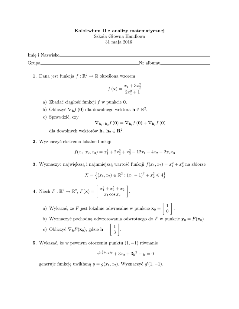 Kolokwium II z analizy matematycznej Szkoła Główna - E-SGH