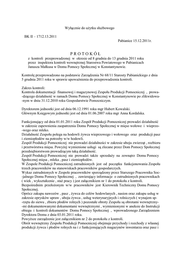 Wyłącznie do użytku służbowego BK II – 1712.13.2011 Pabianice 15.12.2011r. PROTOKÓŁ z kontroli przeprowadzonej w okresie od 8 grudnia do 13 grudnia 2011 roku przez inspektora kontroli wewnętrznej Starostwa Powiatowego w Pabianicach Janusza Małkusa w Domu Pomocy Społecznej w Konstantynowie. Kontrolę przeprowadzono na podstawie Zarządzenia Nr 68/11 Starosty Pabianickiego z dnia 5 grudnia 2011 roku w sprawie upoważnienia do przeprowadzenia kontroli. Zakres kontroli: Kontrola dokumentacji finansowej i magazynowej Zespołu Produkcji Pomocniczej , prowa-dzącego działalność w ramach Domu Pomocy Społecznej w Konstantynowie po zlikwidowa-nym w dniu 31.12.2010 roku Gospodarstwie Pomocniczym. Dyrektorem jednostki jest od dnia 06.12.1991 roku mgr Hubert Kowalski. Głównym Księgowym jednostki jest od dnia 01.06.2007 roku mgr Anna Kordalska. Funkcjonujący od dnia 01.01.2011 roku Zespół Produkcji Pomocniczej prowadzi działalność w zakresie zapewnienia zaopatrzenia Domu Pomocy Społecznej w mięso wołowe i wieprzo-wego oraz mleko. Działalność Zespołu polega na hodowli żywca wieprzowego i wołowego oraz produkcji pasz i ziemiopłodów na potrzeby w/w hodowli. Zespół Produkcji Pomocniczej nie prowadzi działalności w zakresie uboju zwierząt , rozbioru i przetwórstwa mięsa. Powyżej wymienione usługi są zlecane przez Dom Pomocy Społecznej przedsiębiorstwom prowadzącym taką działalność. Zespół Produkcji Pomocniczej nie prowadzi także sprzedaży na zewnątrz Domu Pomocy Społecznej mięsa , mleka , pasz i ziemiopłodów. W Zespole Produkcji Pomocniczej zatrudnionych jest od początku funkcjonowania Zespołu trzech pracowników na stanowiskach pracowników gospodarczych. Wykaz zatrudnionych w Zespole pracowników sporządzony przez Starszego Pracownika Soc-jalnego Domu Pomocy Społecznej , zawierający informacje o zatrudnionych pracownikach ( wiek , wykształcenie , staż pracy ) jest załącznikiem nr 1 do protokołu z kontroli. Bezpośrednim przełożonym w/w pracowników jest Kierownik Techniczny Domu Pomocy Społecznej. Oprócz zakupu nawozów , pasz , żywca do celów hodowlanych , nasion oraz zakupu usług w zakresie oprysków upraw , uboju żywca , usług weterynaryjnych i rolniczych ( wynajem sp-rzętu do siewu , zbioru płodów rolnych ) pozostałe obroty Zespołu są obrotami wewnętrzny-mi dokumentowanymi dokumentami wewnętrznymi , wymienionymi w aneksie do Instrukcji obiegu i kontroli dokumentów Domu Pomocy Społecznej , wprowadzonego Zarządzeniem Dyrektora Domu z dnia 03.01.2011 roku. Powyższe zarządzenie jest załącznikiem nr 2 do protokołu z kontroli. Obrót wewnętrzny Zespołu Produkcji Pomocniczej obejmuje przychody i rozchody z własnej produkcji żywca i płodów rolnych na i z funkcjonujących magazynów inwentarza oraz pasz i - 2 ziemiopłodów , przychody na magazyn spożywczy żywca z uboju i mleka z udoju oraz roz-chody wymienionego żywca i mleka z magazynu spożywczego do kuchni Domu Pomocy Społecznej. Podstawą przyjęcia na magazyn inwentarza żywca w przypadku narodzin inwentarza są pro-tokoły urodzenia o symbolice PW/INW. Podstawą przyjęcia płodów rolnych , wytworzonych z tych płodów pasz ( kiszonki , sianoki-szonki , słoma ) są protokoły zbioru o symbolice PW/PAS. Przykładami takich protokołów są protokoły PW/INW i PW/PAS wystawione w II połowie 2011 roku , stanowiące załącznik nr 3 do protokołu z kontroli. Podstawą wydania z magazynu inwentarza żywego do uboju są dowody RW/INW , płodów rolnych , pasz z własnego przerobu na oborę i chlewnie są dowody RW/PAS. Dowody RW/INW/5/2011 , RW/INW/6/2011 , RW/INW/10/2011 oraz RW/PAS/24/2011, RW/PAS/16/2011 są załącznikiem nr 4 do protokołu z kontroli. Potwierdzeniem uboju i rozbioru żywca są wystawiane przez przedsiębiorstwa prowadzące ubój Handlowe Dokumenty Identyfikacyjne. Dokumenty takie z 09.12.2011 roku nr 19535/A ( ubój trzody chlewnej ) , nr 714/2011 ( ubój bydła ) są załącznikiem nr 5 do protokołu z kon-troli. Na podstawie w/w dokumentów Kierownik Techniczny Domu Pomocy Społecznej sporządza protokoły uboju , stanowiące podstawę do sporządzenia protokołu przerobu żywca , tj. dowo-du przyjęcia mięsa na magazyn spożywczy , w których określana jest waga brutto i netto żywca podlegająca ubojowi , wagi poszczególnych asortymentów mięsa uzyskanych z rozbjo-ru żywca po uboju. Protokoły uboju trzody chlewnej i bydła z 22.09.2011 roku nr 14 , 15 są załącznikiem nr 6 do protokołu z kontroli. Dokumentami przyjęcia na magazyn spożywczy mięsa są protokoły przerobu żywca o symbo-lice PPŻ/SPO , mleka dokumenty przychodu wewnętrznego PW/SPO. Dowody przyjęcia na magazyn spożywczy PPŻ/SPO/17/2011 z 07.12.2011 roku oraz PW/ /SPO/348/2011 z 12.12.2011 roku są załącznikami nr 7 do protokołu z kontroli. Mięso oraz mleko wydawane są do kuchni Domu Pomocy Społecznej na podstawie dokumen-tów wewnętrznych , tzw. relewy spożywczej o symbolice REL/SPO wystawianej przez diete-tyka Domu , stanowiącej dzienne zapotrzebowanie na produkty spożywcze dla mieszkańców Domu. Dowód wydania z magazynu artykułów spożywczych , w tym mięsa i mleka nr REL/SPO/ /334/2011 z dnia 30.11.2011 roku jest załącznikiem nr 8 do protokołu z kontroli. Zgodnie z aneksem z dnia 18.07.2011 roku do umowy z dnia 13.07.2011 roku zawartej z dos-tawcą mięsa ( mięso drobiowe, mięso wieprzowe i wołowe zapotrzebowanie na które nie jest pokryte z hodowli własnej ) , produktów mięsnych ( wędliny , garmaż ) , wybranym w trybie przetargu nieograniczonego , dostawca jest zobowiązany do codziennego , nieodpłatnego od-bioru odpadów pokonsumpcyjnych i poprodukcyjnych pochodzenia zwierzęcego. Powyższa umowa wraz z aneksem są załącznikiem nr 9 do protokołu z kontroli. Na dzień 08.12.2011 roku na stanie magazynu inwentarza żywego były 44 sztuki zwierząt , w tym 15 sztuk bydła oraz 29 sztuki trzody chlewnej , na stanie m