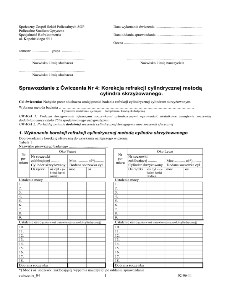 Ćwiczenie 4 Korekcja cylindryczna cyl. skrzyżowanym