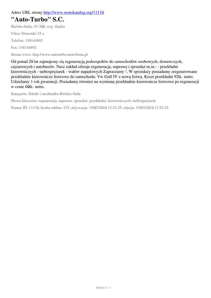 Adres URL strony http://www.motokatalog.org/11110 "Auto-Turbo" S.C. Bielsko-biała, 43-300, woj. śląskie Ulica: Straconki 15 a Telefon: 338144892 Fax: 338144892 Strona www: http://www.autoturbo.motofirma.pl Od ponad 20 lat zajmujemy się regeneracją podzespołów do samochodów osobowych, dostawczych, ciężarowych i autobusów. Nasz zakład oferuje regenerację, naprawę i sprzedaż m.in.: - przekładni kierowniczych - turbosprężarek - wałów napędowych Zapraszamy !. W sprzedaży posiadamy zregenerowane przekładnie kierownicze listwowe do samochodu: Vw Golf IV z nową listwą. Koszt przekładni 920,- netto. Udzielamy 1 rok gwarancji. Posiadamy również na wymianę przekładnie kierownicze listwowe po regeneracji w cenie 600,- netto. Kategorie: Silniki i mechanika Bielsko-biała Słowa kluczowe: regeneracja, naprawa, sprzedaż, przekładni, kierowniczych, turbosprężarek Numer ID: 11110, liczba odsłon: 215, aktywacja: 19/03/2010 13:52:25, edycja: 19/03/2010 13:52:25 Strona 1 / 1