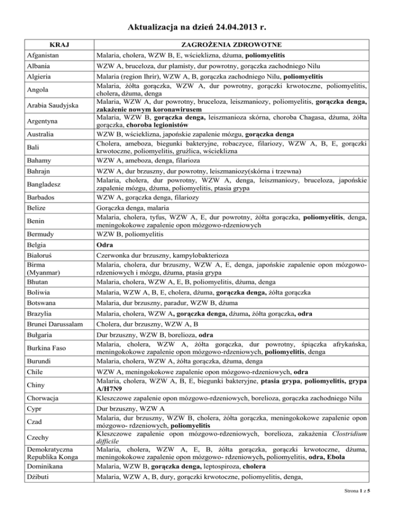 Aktualizacja na dzień 24.04.2013 r. ZAGROŻENIA ZDROWOTNE KRAJ Afganistan Malaria, cholera, WZW B, E, wścieklizna, dżuma, poliomyelitis Albania WZW A, bruceloza, dur plamisty, dur powrotny, gorączka zachodniego Nilu Algieria Malaria (region Ihrir), WZW A, B, gorączka zachodniego Nilu, poliomyelitis Malaria, żółta gorączka, WZW A, dur powrotny, gorączki krwotoczne, poliomyelitis, cholera, dżuma, denga Malaria, WZW A, dur powrotny, bruceloza, leiszmaniozy, poliomyelitis, gorączka denga, zakażenie nowym koronawirusem Malaria, WZW B, gorączka denga, leiszmanioza skórna, choroba Chagasa, dżuma, żółta gorączka, choroba legionistów WZW B, wścieklizna, japońskie zapalenie mózgu, gorączka denga Cholera, ameboza, biegunki bakteryjne, robaczyce, filariozy, WZW A, B, E, gorączki krwotoczne, poliomyelitis, gruźlica, wścieklizna WZW A, ameboza, denga, filarioza Angola Arabia Saudyjska Argentyna Australia Bali Bahamy Bahrajn Bangladesz Barbados WZW A, dur brzuszny, dur powrotny, leiszmaniozy(skórna i trzewna) Malaria, cholera, dur powrotny, WZW A, denga, leiszmaniozy, bruceloza, japońskie zapalenie mózgu, dżuma, poliomyelitis, ptasia grypa WZW A, gorączka denga, filariozy Bermudy Gorączka denga, malaria Malaria, cholera, tyfus, WZW A, E, dur powrotny, żółta gorączka, poliomyelitis, denga, meningokokowe zapalenie opon mózgowo-rdzeniowych WZW B, poliomyelitis Belgia Odra Białoruś Birma (Myanmar) Bhutan Czerwonka dur brzuszny, kampylobakterioza Malaria, cholera, dur brzuszny, WZW A, E, denga, japońskie zapalenie opon mózgowordzeniowych i mózgu, dżuma, ptasia grypa Malaria, cholera, WZW A, E, B, poliomyelitis, dżuma, denga Boliwia Malaria, WZW A, B, E, cholera, dżuma, gorączka denga, żółta gorączka Botswana Malaria, dur brzuszny, paradur, WZW B, dżuma Brazylia Malaria, cholera, WZW A, gorączka denga, dżuma, żółta gorączka, odra Brunei Darussalam Cholera, dur brzuszny, WZW A, B Bułgaria Dur brzuszny, WZW B, borelioza, odra Malaria, cholera, WZW A, żółta gorączka, dur powrotny, śpiączka afrykańska, meningokokowe zapalenie opon mózgowo-rdzeniowych, poliomyelitis, denga Malaria, cholera, WZW A, żółta gorączka, dżuma, denga Belize Benin Burkina Faso Burundi Chile Chiny Chorwacja Cypr WZW A, meningokokowe zapalenie opon mózgowo-rdzeniowych, odra Malaria, cholera, WZW A, B, E, biegunki bakteryjne, ptasia grypa, poliomyelitis, grypa A/H7N9 Kleszczowe zapalenie opon mózgowo-rdzeniowych, borelioza, gorączka zachodniego Nilu Demokratyczna Republika Konga Dominikana Dur brzuszny, WZW A Malaria, dur brzuszny, WZW B, cholera, żółta gorączka, meningokokowe zapalenie opon mózgowo- rdzeniowych, poliomyelitis Kleszczowe zapalenie opon mózgowo-rdzeniowych, borelioza, zakażenia Clostridium difficile Malaria, cholera, WZW A, E, B, żółta gorączka, gorączki krwotoczne, dżuma, meningokokowe zapalenie opon mózgowo- rdzeniowych, poliomyelitis, odra, Ebola Malaria, WZW B, gorączka denga, leptospiroza, cholera Dżibuti Malaria, WZW A, B, dury, gorączki krwotoczne, poliomyelitis, denga, Czad Czechy Strona 1 z 5 Egipt Malaria, dur brzuszny, cholera, dur powrotny, poliomyelitis, ptasia grypa Ekwador Malaria, cholera, WZW A, żółta gorączka, dżuma, gorączka denga, odra Erytrea Malaria, cholera, WZW A, E, żółta gorączka, denga Estonia WZW A, kleszczowe zapalenie opon mózgowo-rdzeniowych, borelioza Malaria, WZW A, E, dury, gorączki krwotoczne, poliomyelitis, żółta gorączka, denga, cholera, odra WZW A, E, denga, dur brzuszny Malaria, cholera, WZW A, E, gorączki krwotoczne, gorączka denga, japońskie zapalenie mózgu, meningokokowe zapalenie opon mózgowo- rdzeniowych, Borelioza, kleszczowe zapalenie opon mózgowo-rdzeniowych, odra Etiopia Fidżi Filipiny Finlandia Francja Gabon Gambia Ghana Grecja Gujana Gujana Francuska Gwadelupa Odra Malaria, WZW A, E, B, gorączki krwotoczne, denga, dur powrotny, poliomyelitis, śpiączka afrykańska, cholera, żółta gorączka Malaria, cholera, WZW A, E, gorączki krwotoczne, denga, dur powrotny, poliomyelitis, żółta gorączka, meningokokowe zapalenie opon mózgowo-rdzeniowych Malaria, cholera, WZW A, E, B gorączki krwotoczne, denga, żółta gorączka, meningokokowe zapalenie opon mózgowo-rdzeniowych, poliomyelitis Kleszczowe zapalenie opon mózgowo-rdzeniowych, gorączka zachodniego Nilu, malaria Malaria, cholera, WZW A, E, B, gorączki krwotoczne, denga. Malaria, cholera, gorączki krwotoczne, WZW A, B, wścieklizna, gorączka denga, żółta gorączka WZW A, B, tężec, błonica, dur brzuszny, gorączka denga Haiti Malaria, cholera, WZW A, B, E, gorączki krwotoczne, poliomyelitis, gorączka denga Malaria, WZW A, B, E, żółta gorączka, gorączka denga, gorączki krwotoczne, poliomyelitis, cholera Malaria, WZW A, B, E, gorączki krwotoczne, gorączka denga, tularemia, cholera Hiszpania Odra Holandia Odra Honduras Malaria, WZW A, B, E, gorączki krwotoczne, gorączka denga, wścieklizna Hongkong Irlandia Malaria, cholera, WZW A, E Malaria, cholera, WZW A, E, gorączki krwotoczne, gorączka denga, japońskie zapalenie mózgu, meningokokowe zapalenie opon mózgowo-rdzeniowych, chikungunya, dżuma, poliomyelitis Malaria, cholera, WZW A, E, B, gorączki krwotoczne, gorączka denga, poliomyelitis, gruźlica, dżuma, meningokokowe zapalenie opon mózgowo- rdzeniowych, wścieklizna, ptasia grypa, chikungunya Malaria, gorączki krwotoczne, denga, poliomyelitis, WZW B, Malaria, cholera, WZW A, B, C, dur powrotny, gorączki krwotoczne, poliomyelitis, gorączka krymsko-kongijska, dżuma Kleszczowe zapalenie opon mózgowo-rdzeniowych, borelioza, odra Islandia Kleszczowe zapalenie opon mózgowo-rdzeniowych, borelioza Izrael Gorączka zachodniego Nilu, Jamajka WZW A, E, B, gorączki krwotoczne, gorączka denga, malaria Japonia Gorączki krwotoczne, cholera, japońskie zapalenie mózgu, denga Malaria, cholera, WZW A, B, E, bruceloza, gorączki krwotoczne, dury kleszczowe, poliomyelitis, gorączka den