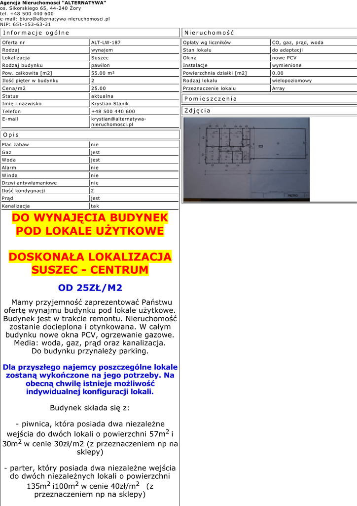 Agencja Nieruchomosci "ALTERNATYWA" os. Sikorskiego 65, 44-240 Żory tel. +48 500 440 600 e-mail: [email protected] NIP: 651-153-63-31 Informacje ogólne Nieruchomość Oferta nr ALT-LW-187 Opłaty wg liczników CO, gaz, prąd, woda Rodzaj wynajem Stan lokalu do adaptacji Lokalizacja Suszec Okna nowe PCV Rodzaj budynku pawilon Instalacje wymienione Pow. całkowita [m2] 55.00 m² Powierzchnia działki [m2] 0.00 Ilość pięter w budynku 2 Rodzaj lokalu wielopoziomowy Cena/m2 25.00 Przeznaczenie lokalu Array Status aktualna Imię i nazwisko Krystian Stanik Telefon +48 500 440 600 E-mail [email protected] Opis Plac zabaw nie Gaz jest Woda jest Alarm nie Winda nie Drzwi antywłamaniowe nie Ilość kondygnacji 2 Prąd jest Kanalizacja tak DO WYNAJĘCIA BUDYNEK POD LOKALE UŻYTKOWE DOSKONAŁA LOKALIZACJA SUSZEC - CENTRUM OD 25ZŁ/M2 Mamy przyjemność zaprezentować Państwu ofertę wynajmu budynku pod lokale użytkowe. Budynek jest w trakcie remontu. Nieruchomość zostanie docieplona i otynkowana. W całym budynku nowe okna PCV, ogrzewanie gazowe. Media: woda, gaz, prąd oraz kanalizacja. Do budynku przynależy parking. Dla przyszłego najemcy poszczególne lokale zostaną wykończone na jego potrzeby. Na obecną chwilę istnieje możliwość indywidualnej konfiguracji lokali. Budynek składa się z: - piwnica, która posiada dwa niezależne wejścia do dwóch lokali o powierzchni 57m2 i 30m2 w cenie 30zł/m2 (z przeznaczeniem np na sklepy) - parter, który posiada dwa niezależne wejścia do dwóch niezależnych lokali o powierzchni 135m2 i100m2 w cenie 40zł/m2 (z przeznaczeniem np na sklepy) Pomieszczenia Zdjęcia -piętro dwa lokale o powierzchni 55m2 i 60m2 w cenie 25zł/m2 (z przeznaczeniem np na gabinety, biura) Serdecznie zapraszamy na prezentację Kontakt: Krystian Stanik tel. 500 440 600 [email protected] ( licencja zawodowa nr 21811 ) Nieruchomości "Alternatywa" Os. Sikorskiego 65 ( za sklepem meble Bodzio ) 44-240 Żory www.alternatywa-nieruchomosci.pl Agencja Nieruchomosci "ALTERNATYWA" os. Sikorskiego 65, 44-240 Żory tel. +48 500 440 600 e-mail: [email protected] NIP: 651-153-63-31