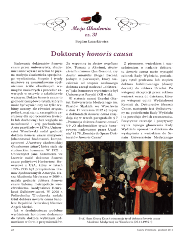 Moja Akademia cz. 31 Bogdan Łazarkiewicz Doktoraty honoris causa Nadawanie doktoratów honoris causa przez uniwersytety, akademie i inne wyższe uczelnie to piękna tradycja akademicka specjalnego wyróżnienia. Stopnie i tytuły naukowe są uwarunkowane spełnieniem ściśle określonych wymogów naukowych i procedur zawartych w ustawie o szkolnictwie wyższym. Doktor honoris causa to godność (urzędowo tytuł), którym może być wyróżniony nie tylko wybitny uczony, ale również artysta, polityk, mąż stanu, szczególnie zasłużony dla społeczeństwa (świecki lub duchowny) bez względu na narodowość i kraj pochodzenia. A oto przykłady: w 1879 r. Uniwersytet Wrocławski nadał godność doktora honoris causa muzykowi Johannesowi Brahmsowi, kompozytorowi „Uwertury akademickiej Gaudeamus igitur”, która stała się studenckim hymnem. W 1921 r. Uniwersytet Jana Kazimierza we Lwowie nadał doktorat honoris causa politykowi Herbertowi Hooverowi z USA, który w latach 1929–1933 był prezydentem Stanów Zjednoczonych Ameryki. Nasza Akademia Medyczna w 2009 r. nadała godność doktora honoris causa byłemu metropolicie wrocławskiemu, kardynałowi Henrykowi Gulbinowiczowi. W 2008 r. Politechnika Wrocławska nadała tytuł doktora honoris causa kanclerz Republiki Federalnej Niemiec Angeli Merkel. Już w średniowieczu podobne wyróżnienia honorowe dodawano do tytułu doktora wybitnym jednostkom w formie przymiotników. 22 Że wspomnę tu doctor angelicus (św. Tomasz z Akwinu), doctor christianissimus (Jan Gerson), czy doctor mirabilis (Roger Bacon). Jednym z pierwszych, który niezależnie od stopnia naukowego doktora zaczął nadawać „doktoraty” jako honorowe wyróżnienie był Uniwersytet Paryski (XII wiek). W statucie naszej Uczelni (Statut Uniwersytetu Medycznego im. Piastów Śląskich we Wrocławiu z dnia 17 września 2012 r.) zapisy o doktoratach honoris causa znajdują się w trzech paragrafach: § 7 „Promocja doktora honoris causa”, § 9 „O akademickim tytule honorowym nadawanym przez Uczelnię” i § 78 „Komisja do Spraw Doktoratów Honoris Causa”. Z pisemnym wnioskiem i uzasadnieniem o nadanie doktoratu honoris causa może wystąpić członek Rady Wydziału, posiadający tytuł profesora lub stopień doktora habilitowanego (dawny docent) do rektora Uczelni. Po wstępnej akceptacji przez rektora wniosek wraca do dziekana, który po wstępnej opinii Wydziałowej Komisji ds. Doktoratów Honoris Causa, następnie jest dyskutowany na posiedzeniu Rady Wydziału i ta powołuje dwóch recenzentów. Pozytywne recenzje i pozytywny wynik tajnego głosowania Rady Wydziału upoważnia dziekana do wystąpienia z wnioskiem do Senatu Uniwersytetu Medycznego Prof. Hans Georg Knoch otrzymuje tytuł doktora honoris causa Akademii Medycznej we Wrocławiu (25.11.1985 r.) Gazeta Uczelniana grudzień 2014 o nadanie tytułu doktora honoris causa. W okresie PRL-u każdorazowa decyzja Uczelni o nadanie doktoratu honoris causa musiała być zatwierdzona przez ministra. Promotorem doktoratu honoris causa przeważnie jest wnioskodawca. Poczet doktorów honoris causa Akademii Medycznej we Wrocławiu rozpoczyna prof. Stanisław Kulczyński, filozof, zoolog i botanik, były profesor Uniwersytetu Jana Kazimierza we Lwowie, a po II wojnie światowej organizator i pierwszy rektor Uniwersytetu i Politechniki Wrocławskiej, w strukturach którego przez pięć lat działał nasz Wydział Lekarski. Uroczystość promocyjna odbyła się 3 marca 1961 r. już w ramach naszej Akademii Medycznej, a promotorem był prof. Antoni Falkiewicz. Wśród 87 doktoratów honoris causa, jakie nadała nasza Uczelnia do 2014 r., ja miałem zaszczyt czterokrotnie pełnić funkcję promotora. Byli to promowani: prof. Hans Georg Knoch – chirurg, rektor Akademii Medycznej w Dreźnie, dyrektor Kliniki Chirurgicznej, prof. Waldemar Kozuschek – chirurg, dyrektor Kliniki Chirurgicznej w Bochum, prof. Stanisław Konturek – fizjolog, dziekan Wydziału Lekarskiego Uniwersytetu Jagiellońskiego w Krakowie i prof. Ryszard Badura – chirurg weterynaryjny, rektor Akademii Rolniczej we Wrocławiu. Wymienieni wyżej współpracowali naukowo z odpowiednimi katedrami, klinikami lub zakładami naszej Uczelni, a w Dreźnie i Bochum odbywali staże specjalistyczne asystenci i studenci na zasadach wymiany bezdewizowej. Piękne ceremonie nadawania doktoratów honoris causa prawie zawsze odbywały się w barokowej Auli Leopoldyńskiej Uniwersytetu Wrocławskiego w czasie inauguracji roku akademickiego lub jako wydzielona uroczystość. Dwa doktoraty honoris causa wyraźnie różGazeta Uczelniana grudzień 2014 Prof. Waldemar Kozuschek otrzymuje tytuł doktora honoris causa Akademii Medycznej we Wrocławiu (4.10.1995 r.) Prof. Stanisław Konturek (pierwszy z prawej) otrzymuje tytuł doktora honoris causa Akademii Medycznej we Wrocławiu (6.10.1998 r.) (fot. Paweł Golusik) Prof. Ryszard Badura otrzymuje tytuł doktora honoris causa Akademii Medycznej we Wrocławiu (3.3.2000 r.) (fot. Marek Kosendiak) 23 niły się od tradycyjnej ceremonii ich nadawania. Prof. Adam Gruca – ortopeda, były pracownik Uniwersytetu Jana Kazimierza we Lwowie, a po II wojnie światowej kierownik kliniki Akademii Medycznej w Warszawie, z powodu ciężkiej choroby i zaawansowanego wieku nie mógł przybyć do Wrocławia i dokument nadania doktoratu honoris causa naszej Uczelni (25.02.1982 r.) został mu wręczony przez rektora prof. Mariana Wilimowskiego i promotora prof. Stefana Koźmińskiego w jego domu w Warszawie. Prof. Józef Mądalski (w latach 1962–1964 Dziekan Wydziału Farmaceutycznego Akademii Medycznej we Wrocławiu) uzyskał doktorat honoris causa naszej Uczelni zatwierdzony przez Senat, jednak na uroczystość wręczenia, która miała miejsce kilka tygodni później, 13 stycznia 1996 r. nie przybył, ponieważ wcześniej zmarł (fotel dla doktoranta był pusty, przewieszony czarną wstęgą). Doktorat honoris causa ojca odebrał