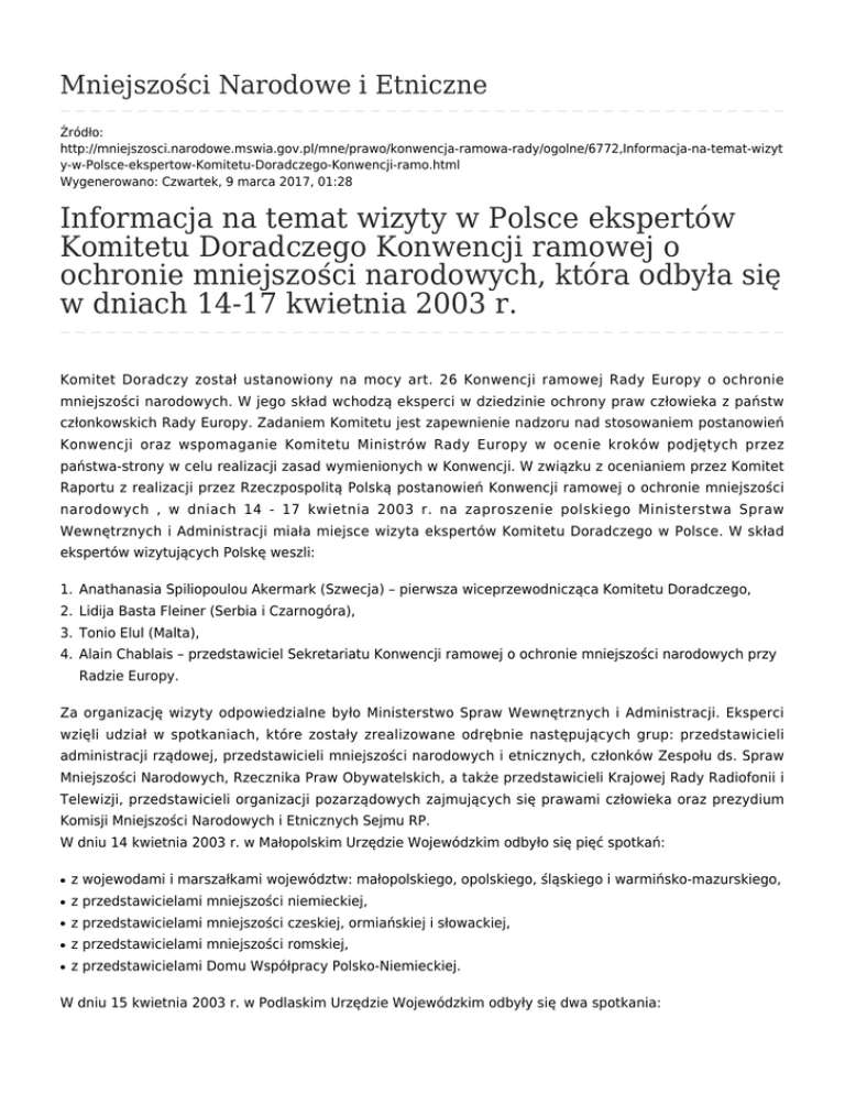 Mniejszości Narodowe i Etniczne Źródło: http://mniejszosci.narodowe.mswia.gov.pl/mne/prawo/konwencja-ramowa-rady/ogolne/6772,Informacja-na-temat-wizyt y-w-Polsce-ekspertow-Komitetu-Doradczego-Konwencji-ramo.html Wygenerowano: Czwartek, 9 marca 2017, 01:28 Informacja na temat wizyty w Polsce ekspertów Komitetu Doradczego Konwencji ramowej o ochronie mniejszości narodowych, która odbyła się w dniach 14-17 kwietnia 2003 r. Komitet Doradczy został ustanowiony na mocy art. 26 Konwencji ramowej Rady Europy o ochronie mniejszości narodowych. W jego skład wchodzą eksperci w dziedzinie ochrony praw człowieka z państw członkowskich Rady Europy. Zadaniem Komitetu jest zapewnienie nadzoru nad stosowaniem postanowień Konwencji oraz wspomaganie Komitetu Ministrów Rady Europy w ocenie kroków podjętych przez państwa-strony w celu realizacji zasad wymienionych w Konwencji. W związku z ocenianiem przez Komitet Raportu z realizacji przez Rzeczpospolitą Polską postanowień Konwencji ramowej o ochronie mniejszości narodowych , w dniach 14 - 17 kwietnia 2003 r. na zaproszenie polskiego Ministerstwa Spraw Wewnętrznych i Administracji miała miejsce wizyta ekspertów Komitetu Doradczego w Polsce. W skład ekspertów wizytujących Polskę weszli: 1. Anathanasia Spiliopoulou Akermark (Szwecja) – pierwsza wiceprzewodnicząca Komitetu Doradczego, 2. Lidija Basta Fleiner (Serbia i Czarnogóra), 3. Tonio Elul (Malta), 4. Alain Chablais – przedstawiciel Sekretariatu Konwencji ramowej o ochronie mniejszości narodowych przy Radzie Europy. Za organizację wizyty odpowiedzialne było Ministerstwo Spraw Wewnętrznych i Administracji. Eksperci wzięli udział w spotkaniach, które zostały zrealizowane odrębnie następujących grup: przedstawicieli administracji rządowej, przedstawicieli mniejszości narodowych i etnicznych, członków Zespołu ds. Spraw Mniejszości Narodowych, Rzecznika Praw Obywatelskich, a także przedstawicieli Krajowej Rady Radiofonii i Telewizji, przedstawicieli organizacji pozarządowych zajmujących się prawami człowieka oraz prezydium Komisji Mniejszości Narodowych i Etnicznych Sejmu RP. W dniu 14 kwietnia 2003 r. w Małopolskim Urzędzie Wojewódzkim odbyło się pięć spotkań: ● z wojewodami i marszałkami województw: małopolskiego, opolskiego, śląskiego i warmińsko-mazurskiego, ● z przedstawicielami mniejszości niemieckiej, ● z przedstawicielami mniejszości czeskiej, ormiańskiej i słowackiej, ● z przedstawicielami mniejszości romskiej, ● z przedstawicielami Domu Współpracy Polsko-Niemieckiej. W dniu 15 kwietnia 2003 r. w Podlaskim Urzędzie Wojewódzkim odbyły się dwa spotkania: ● z wojewodą podlaskim i marszałkiem województwa podlaskiego, ● przedstawicielami mniejszości białoruskiej, litewskiej, rosyjskiej i tatarskiej. Tego samego dnia, członkowie delegacji spotkali się z przedstawicielami mniejszości ukraińskiej i łemkowskiej w Ministerstwie Spraw Wewnętrznych i Administracji. W dniu 16 kwietnia 2003 r. miało miejsce 5 spotkań: ● z Rzecznikiem Praw Obywatelskich, ● z prezydium Komisji Mniejszości Narodowych Sejmu RP (dotyczyło przede wszystkim uchwalenia ustawy o mniejszościach narodowych i etnicznych w RP), ● z przedstawicielami społeczności kaszubskiej, ● z przedstawicielami mniejszości żydowskiej i karaimskiej, ● z przedstawicielami organizacji pozarządowych (zorganizowane przez Biuro Informacji Rady Europy). W dniu 17 kwietnia 2003 r. członkowie Komitetu Doradczego uczestniczyli w trzech spotkaniach: ● z przedstawicielami Krajowej Rady Radiofonii i Telewizji, ● z członkami i ekspertami Zespołu do Spraw Mniejszości Narodowych, ● z przedstawicielami administracji rządowej. Wstecz Drukuj Generuj PDF Powiadom znajomego