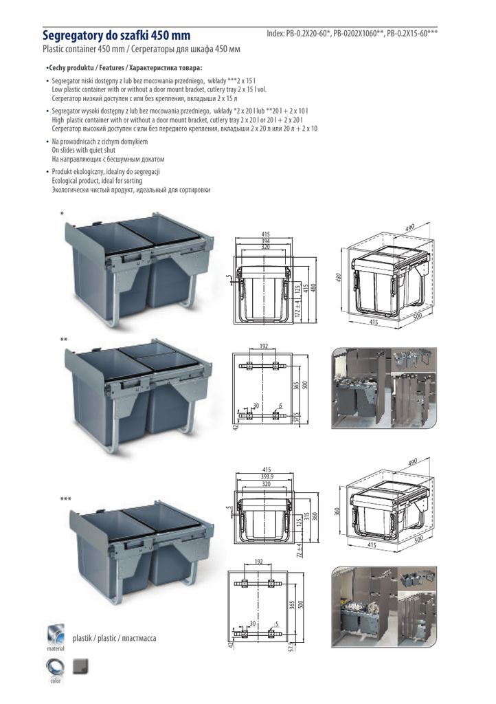 Segregatory do szafki 450 mm Index: PB-0.2X20-60*, PB-0202X1060**, PB-0.2X15-60*** Plastic container 450 mm / Сегрегаторы для шкафа 450 мм Cechy produktu / Features / Характеристика товара: Segregator niski dostępny z lub bez mocowania przedniego, wkłady ***2 x 15 l Low plastic container with or without a door mount bracket, cutlery tray 2 x 15 l vol. Сегрегатор низкий доступен с или без крепления, вкладыши 2 x 15 л Segregator wysoki dostępny z lub bez mocowania przedniego, wkłady *2 x 20 l lub **20 l + 2 x 10 l High plastic container with or without a door mount bracket, cutlery tray 2 x 20 l or 20 l + 2 x 20 l Сегрегатор высокий доступен с или без переднего крепления, вкладыши 2 x 20 л или 20 л + 2 x 10 Na prowadnicach z cichym domykiem On slides with quiet shut На направляющих с бесшумным докатом Produkt ekologiczny, idealny do segregacji Ecological product, ideal for sorting Экологически чистый продукт, идеальный для сортировки * 490 172 ± 4 125 415 480 5 480 415 394 320 415 ** 500 365 500 192 30 42 57.5 5 490 72 ± 4 125 315 360 5 *** 365 500 192 color 5 57.5 material 42 30 plastik / plastic / пластмасса 360 415 393.9 320 415 500