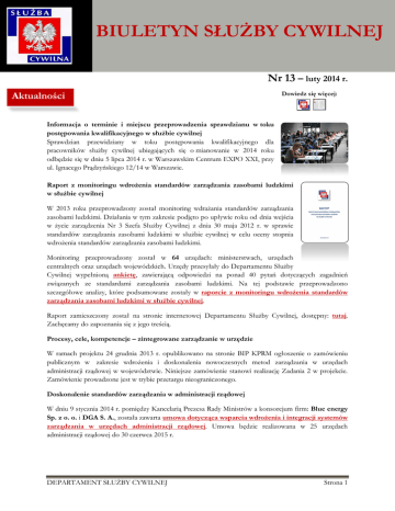 BIULETYN SŁUŻBY CYWILNEJ Nr 13 – luty 2014 r. Aktualności Dowiedz się więcej: Informacja o terminie i miejscu przeprowadzenia sprawdzianu w toku postępowania kwalifikacyjnego w służbie cywilnej Sprawdzian przewidziany w toku postępowania kwalifikacyjnego dla pracowników służby cywilnej ubiegających się o mianowanie w 2014 roku odbędzie się w dniu 5 lipca 2014 r. w Warszawskim Centrum EXPO XXI, przy ul. Ignacego Prądzyńskiego 12/14 w Warszawie. Raport z monitoringu wdrożenia standardów zarządzania zasobami ludzkimi w służbie cywilnej W 2013 roku przeprowadzony został monitoring wdrażania standardów zarządzania zasobami ludzkimi. Działania w tym zakresie podjęto po upływie roku od dnia wejścia w życie zarządzenia Nr 3 Szefa Służby Cywilnej z dnia 30 maja 2012 r. w sprawie standardów zarządzania zasobami ludzkimi w służbie cywilnej w celu oceny stopnia wdrożenia standardów zarządzania zasobami ludzkimi. Monitoring przeprowadzony został w 64 urzędach: ministerstwach, urzędach centralnych oraz urzędach wojewódzkich. Urzędy przesyłały do Departamentu Służby Cywilnej wypełnioną ankietę, zawierającą odpowiedzi na ponad 40 pytań dotyczących zagadnień związanych ze standardami zarządzania zasobami ludzkimi. Na tej podstawie przeprowadzono szczegółowe analizy, które podsumowane zostały w raporcie z monitoringu wdrożenia standardów zarządzania zasobami ludzkimi w służbie cywilnej. Raport zamieszczony został na stronie internetowej Departamentu Służby Cywilnej, dostępny: tutaj. Zachęcamy do zapoznania się z jego treścią. Procesy, cele, kompetencje – zintegrowane zarządzanie w urzędzie W ramach projektu 24 grudnia 2013 r. opublikowano na stronie BIP KPRM ogłoszenie o zamówieniu publicznym w zakresie wdrożenia i doskonalenia nowoczesnych metod zarządzania w urzędach administracji rządowej w województwie. Niniejsze zamówienie stanowi realizację Zadania 2 w projekcie. Zamówienie prowadzone jest w trybie przetargu nieograniczonego. Doskonalenie standardów zarządzania w administracji rządowej W dniu 9 stycznia 2014 r. pomiędzy Kancelarią Prezesa Rady Ministrów a konsorcjum firm: Blue energy Sp. z o. o. i DGA S. A., została zawarta umowa dotycząca wsparcia wdrożenia i integracji systemów zarządzania w urzędach administracji rządowej. Umowa będzie realizowana w 25 urzędach administracji rządowej do 30 czerwca 2015 r. DEPARTAMENT SŁUŻBY CYWILNEJ Strona 1 BIULETYN SŁUŻBY CYWILNEJ Nr 13 – luty 2014 r. Seminarium nt. relacji polityków i urzędników w państwach OECD 24 stycznia br. w siedzibie Ministerstwa Infrastruktury i Rozwoju (MIR) odbyło się seminarium na temat współpracy polityków i wyższych rangą urzędników służby cywilnej w administracjach państw członkowskich OECD. Spotkanie to zostało zorganizowane przez Departament Służby Cywilnej KPRM we współpracy z Departamentem Europejskiego Funduszu Społecznego MIR oraz Dyrektoriatem OECD ds. Zarzadzania Publicznego i Rozwoju Terytorialnego (OECD GOV). Uczestniczyli w nim parlamentarzyści, osoby zajmujące wysokie stanowiska państwowe, członkowie gabinetów politycznych, dyrektorzy generalni, dyrektorzy komórek organizacyjnych, akademicy oraz eksperci - w sumie ponad sto osób. Seminarium miało na celu przedyskutowanie kwestii współpracy polityków z wysokimi rangą urzędnikami służby cywilnej. W dyskusji udział wzięli między innymi Sekretarz Stanu, Pełnomocnik Rządu ds. Równego Traktowania Agnieszka Kozłowska-Rajewicz, Sekretarz Stanu w Kancelarii Prezesa Rady Ministrów Tomasz Jędrzejczak, Przewodnicząca sejmowej Komisji Administracji i Cyfryzacji Julia Pitera, Poseł na Sejm Krzysztof Szczerski oraz prof. Grzegorz Rydlewski z Instytutu Nauk Politycznych Uniwersytetu Warszawskiego. Zaproszenie do udziału w badaniu z zakresu e-administracji Eksperci Uniwersytetu Ekonomicznego w Katowicach zapraszają kierowników urzędów administracji rządowej do udziału w badaniu dotyczącym wpływu instytucji administracji publicznej na rozwój społeczeństwa informacyjnego. Główny cel badania to rozpoznanie czynników warunkujących wykorzystanie ICT w jednostkach administracji publicznej, a także ocena aktualnej sytuacji w zakresie wykorzystania przez nie ICT. Na podstawie wyników badania sformułowane zostaną rekomendacje adresowane do władzy publicznej i pracowników instytucji administracji publicznej w zakresie poprawy efektywności, innowacyjności i sprawności kraju dzięki wykorzystaniu ICT. Wypełnienie ankiety pozwoli również każdemu z urzędów dokonać diagnozy swojej instytucji z punktu widzenia wykorzystania ICT. Ankieta jest dostępna pod adresem http://www.surveymonkey.com/s/AUE4. Należy ją wypełnić do 14 marca br. Inspirujące rozwiązania oraz dobre praktyki rekomendowane przez Szefa Służby Cywilnej w zakresie przyznawania dodatków zadaniowych członkom korpusu służby cywilnej Departament Służby Cywilnej opracował Analizę wybranych zasad przyznawania dodatków zadaniowych członkom korpusu służby cywilnej oraz dobrych praktyk rekomendowanych przez Szefa Służby Cywilnej. Ponadto przygotowana została prezentacja dotycząca praktyki przyznawania dodatków zadaniowych w wybranych urzędach w latach 2011-2012. Ww. dokumenty zostały zamieszone na stronie internetowej, dostępne: tutaj. Opracowana Analiza wybranych zasad przyznawania dodatków zadaniowych jest kolejnym etapem podejmowanych przez Departament Służby Cywilnej działań wspierających urzędy w zakresie formalnoprawnych podstaw stosowania zmiennych składników wynagradzania w służbie cywilnej oraz promowania dobrych praktyk w tym zakresie. Na stronie internetowej www.dsc.kprm.gov.pl dostępna jest również DEPARTAMENT SŁUŻBY CYWILNEJ Strona 2 BIULETYN SŁUŻBY CYWILNEJ Nr 13 – luty 2014 r. opracowana wcześniej Analiza wybranych zasad przyznawania nagród członkom korpusu służby cywilnej oraz dobre p