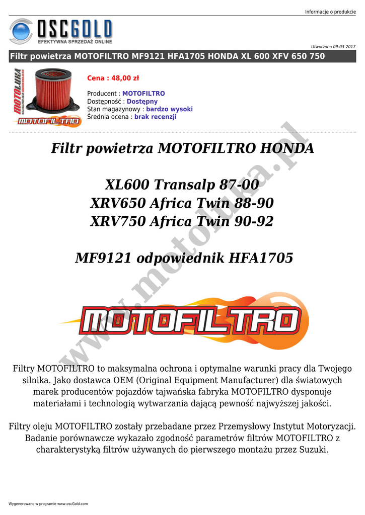 Informacje o produkcie Utworzono 09-03-2017 Filtr powietrza MOTOFILTRO MF9121 HFA1705 HONDA XL 600 XFV 650 750 Cena : 48,00 zł a. pl Producent : MOTOFILTRO Dostępność : Dostępny Stan magazynowy : bardzo wysoki Średnia ocena : brak recenzji Filtr powietrza MOTOFILTRO HONDA ol uk XL600 Transalp 87-00 XRV650 Africa Twin 88-90 XRV750 Africa Twin 90-92 w w w .m ot MF9121 odpowiednik HFA1705 Filtry MOTOFILTRO to maksymalna ochrona i optymalne warunki pracy dla Twojego silnika. Jako dostawca OEM (Original Equipment Manufacturer) dla światowych marek producentów pojazdów tajwańska fabryka MOTOFILTRO dysponuje materiałami i technologią wytwarzania dającą pewność najwyższej jakości. Filtry oleju MOTOFILTRO zostały przebadane przez Przemysłowy Instytut Motoryzacji. Badanie porównawcze wykazało zgodność parametrów filtrów MOTOFILTRO z charakterystyką filtrów używanych do pierwszego montażu przez Suzuki. Wygenerowano w programie www.oscGold.com a. pl uk Filtr pasuje idealnie do: ot ol Honda Motorcycle w w w .m XL600 V-H,J,K,L,M,N,P,R,S,T,V,W,X,Y Transalp PD06 87-00 XRV650 Africa Twin RD03 88-90 XRV750 Africa Twin RD04 90-92