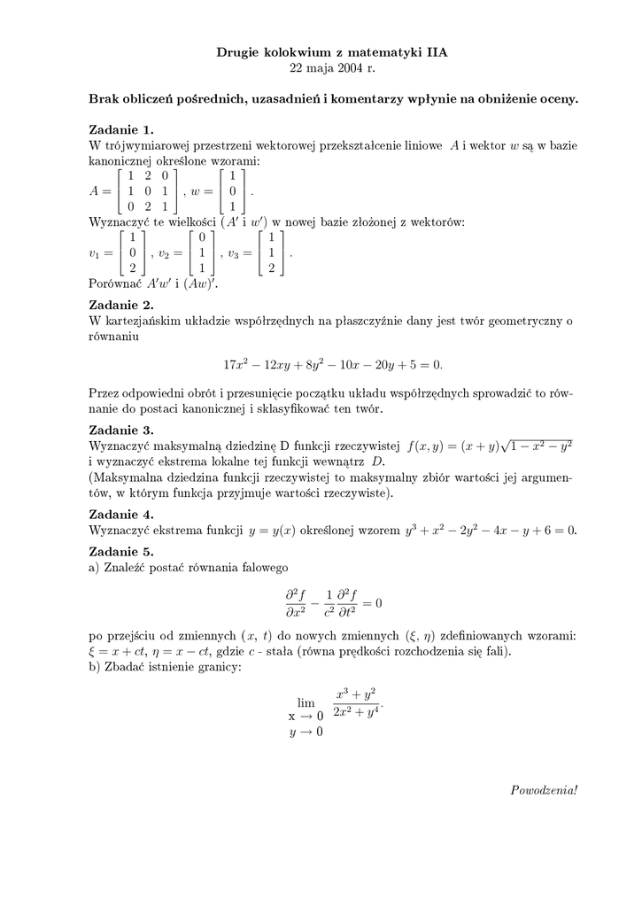 Drugie kolokwium z matematyki IIA 22 maja 2004 r. Brak oblicze« po±rednich, uzasadnie« i komentarzy wpªynie na obni»enie oceny. Zadanie 1. W trójwymiarowej przestrzeni wektorowej przeksztaªcenie liniowe A i wektor w s¡ w bazie kanonicznej okre±lone wzorami: 1 2 0 1 A = 1 0 1 , w = 0 . 0 2 1 1 Wyznaczy¢ te wielko±ci ( A0 i w0 ) wnowej bazie zªo»onej z wektorów: 1 0 1 v1 = 0 , v 2 = 1 , v 3 = 1 . 2 1 2 Porówna¢ A0 w0 i (Aw)0 . Zadanie 2. W kartezja«skim ukªadzie wspóªrz¦dnych na pªaszczy¹nie dany jest twór geometryczny o równaniu 17x2 − 12xy + 8y 2 − 10x − 20y + 5 = 0. Przez odpowiedni obrót i przesuni¦cie pocz¡tku ukªadu wspóªrz¦dnych sprowadzi¢ to równanie do postaci kanonicznej i sklasykowa¢ ten twór. Zadanie 3. √ Wyznaczy¢ maksymaln¡ dziedzin¦ D funkcji rzeczywistej f (x, y) = (x + y) 1 − x2 − y 2 i wyznaczy¢ ekstrema lokalne tej funkcji wewn¡trz D. (Maksymalna dziedzina funkcji rzeczywistej to maksymalny zbiór warto±ci jej argumentów, w którym funkcja przyjmuje warto±ci rzeczywiste). Zadanie 4. Wyznaczy¢ ekstrema funkcji y = y(x) okre±lonej wzorem y 3 + x2 − 2y 2 − 4x − y + 6 = 0. Zadanie 5. a) Znale¹¢ posta¢ równania falowego ∂2f 1 ∂2f − =0 ∂x2 c2 ∂t2 po przej±ciu od zmiennych ( x, t) do nowych zmiennych (ξ, η) zdeniowanych wzorami: ξ = x + ct, η = x − ct, gdzie c - staªa (równa pr¦dko±ci rozchodzenia si¦ fali). b) Zbada¢ istnienie granicy: x3 + y 2 . lim 2 4 x → 0 2x + y y→0 Powodzenia!
