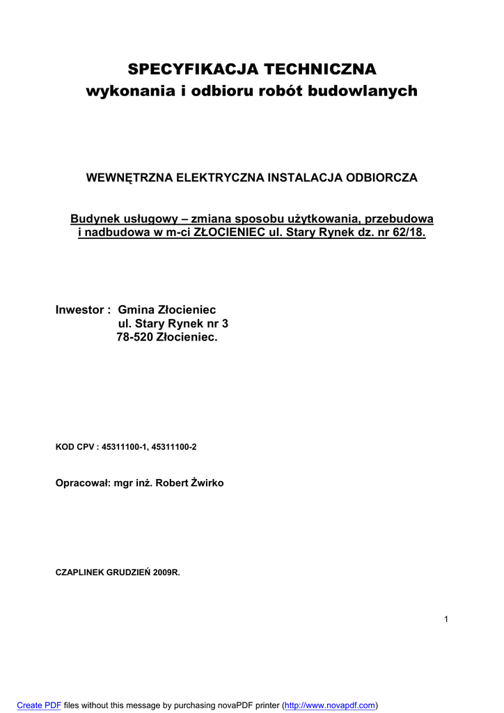 SPECYFIKACJA TECHNICZNA wykonania i odbioru robót budowlanych WEWNĘTRZNA ELEKTRYCZNA INSTALACJA ODBIORCZA Budynek usługowy – zmiana sposobu użytkowania, przebudowa i nadbudowa w m-ci ZŁOCIENIEC ul. Stary Rynek dz. nr 62/18. Inwestor : Gmina Złocieniec ul. Stary Rynek nr 3 78-520 Złocieniec. KOD CPV : 45311100-1, 45311100-2 Opracował: mgr inż. Robert Żwirko CZAPLINEK GRUDZIEŃ 2009R. 1 Create PDF files without this message by purchasing novaPDF printer (http://www.novapdf.com) SPIS TREŚCI 1. WSTĘP 4 1.1. Przedmiot Specyfikacji Technicznej 4 1.2. Zakres stosowania Specyfikacji Technicznej 4 1.3. Zakres Robót objętych ST 4 1.4. Określenia podstawowe. 6 2. MATERIAŁY I URZĄDZENIA 6 3. SPRZĘT 7 4. TRANSPORT 7 3. WYKONANIE ROBÓT 8 3.1. Ogólne wymagania. 8 3.2. Warunki ogólne wykonania Robót przygotowawczych. 3.2.1. Trasowanie 3.2.2. Przebicie otworów do tablic rozdzielczych i szafki pomiarowej 3.2.3. Ustalenie miejsc montażu opraw i osprzętu 3.2.4. Przejścia przez ściany i stropy 8 8 8 8 8 3.3. Warunki ogólne wykonania Robót instalacyjnych. 3.3.1. Montaż rozdzielnic i szafki licznikowej zewnętrznej. 3.3.2. Układanie przewodów elektrycznych i montaż osprzętu w budynku. 3.3.3. Montaż opraw oświetleniowych. 3.3.4. Sieć telefoniczna i komputerowa. 8 8 9 9 10 3.4. Warunki ogólne wykonania Robót montażowych. 5.4.1. Układanie rur ochronnych i osadzanie puszek 5.4.2. Wciąganie przewodów do rur 3.4.5. Układanie i mocowanie przewodów w tynku 3.4.6. Przygotowanie końców żył i łączenie przewodów 3.4.7. Przyłączanie odbiorników 10 10 10 10 11 11 3.5. Ochrona przeciwporażeniowa. 11 4. KONTROLA JAKOŚCI ROBÓT 11 4.1. Ogólne zasady kontroli jakości Robót 11 4.2. Szczegółowe zasady kontroli Robót. 4.2.8. Badania jakości Robót w czasie budowy 4.2.9. Badania i pomiary. 11 12 12 5. OBMIAR ROBÓT 12 5.1. Ogólne zasady obmiaru Robót 12 5.2. Szczegółowe zasady obmiaru Robót. 12 2 Create PDF files without this message by purchasing novaPDF printer (http://www.novapdf.com) 5.3. Jednostki obmiarowe 13 6. PRZEJĘCIE ROBÓT 13 6.1. Warunki ogólne 13 6.2. Warunki szczegółowe. 6.2.10. Odbiór Robót zanikających i ulegających zakryciu. 6.2.11. Odbiór ostateczny Robót - Przejęcie Robót. 13 13 13 7. PODSTAWA PŁATNOŚCI 14 7.1. Ustalenia ogólne 14 7.2. Cena wykonania Robót 14 8. PRZEPISY ZWIĄZANE 14 3 Create PDF files without this message by purchasing novaPDF printer (http://www.novapdf.com) 1. WSTĘP 1.1. Przedmiot Specyfikacji Technicznej Przedmiotem niniejszej Specyfikacji Technicznej są wymagania dotyczące wykonania i odbioru robót elektrycznych: wewnętrzna elektryczna instalacja odbiorcza budynku usługowego w m-ci Złocieniec ul. Stary Rynek dz. nr 62/18 w ramach projektu: „Budynek usługowy – zmiana sposobu użytkowania, przebudowa i nadbudowa w m-ci Złocieniec ul. Stary Rynek dz. nr 62/18”. 1.2. Zakres stosowania Specyfikacji Technicznej Specyfikację Techniczna jako część Dokumentów Przetargowych, należy odczytywać i rozumieć w odniesieniu do zlecenia wykonania Robót opisanych w pkt. 1.1. 1.3. Zakres Robót objętych ST Ustalenia zawarte w niniejszej specyfikacji mają zastosowanie do wykonania: wewnętrznej elektrycznej instalacji odbiorczej budynku usługowego: w miejscowości Złocieniec ul. Stary Rynek dz. nr 62/18. Zakres robót dla powyższych robót obejmuje: (1) Roboty przygotowawcze: 1. Usunięcie lub czasowe zdemontowanie przedmiotów utrudniających prace, 2. Demontaż starej instalacji elektrycznej i osprzętu. (2) Roboty zasadnicze: INSTALACJE ELEKTRYCZNE Demontaż istniejącej instalacji elektrycznej. Demontaż przewodów p/t. Demontaż gniazd wtyczkowych i puszek p/t. Demontaż łączników i puszek p/t. Demontaż opraw oświetleniowych. Szafka pomiarowa (licznikowa) zewnętrzna i linie wlz. Wykucie wnęk dla szafki pomiarowej P3 i złącza kablowego energetyki podłoże ceglane Montaż kpl. szafki licznikowej wtynkowej 3L-3-faz + zabezpieczenia przedlicznikowe + zamykanie kłódka Wykucie bruzd dla rur ochronnych DVR-110, RS-37, RS-28 podłoże ceglane – wprowadzenie w przyszłości kabli energetycznych Montaż rur ochronnych DVR-110, RS-37, RS-28 w gotowych bruzdach Zaprawienie bruzd o szerokości do 110 mm Zaprawienie bruzd. Ręczne przygotowanie zaprawy cementowo-wapiennej 2 Przewody kabelkowe układane w rurkach ochronnych, przewód YDY 4 x 16 mm 750V – wlz do złącza kablowego energetyki Zarobienie na sucho kabla 4-żyłowego o przekroju żył do 16 mm2 2 Przewody kabelkowe układane w rurkach ochronnych, przewód YDY 5 x 6 mm 750V – wlz od licznika do rozdzielnic w budynku Zarobienie na sucho kabla 5-żyłowego o przekroju żył do 6 mm2 Montaż modułowych wyłączników nadprądowych 3-biegunowych – zabezpieczenia przedlicznikowe Tablice rozdzielcze. Wykucie wnęk dla rozdzielnic modułowych wtynkowych, podłoże ceglane Montaż rozdzielnic wtynkowych modułowych 4x12 IP-41 + zamek Montaż rozdzielnic natynkowych modułowych 3x18 IP-55 + zamek Zarobienie na sucho kabla 5-żyłowego o przekroju żył do 6 mm2 4 Create PDF files without this message by purchasing novaPDF printer (http://www.novapdf.com) Montaż modułowych wyłączników nadprądowych 1 i 3-biegunowych Montaż modułowych wyłączników głównych 4-biegunowych Montaż modułowych wyłączników różnicowoprądowych 2 i 4 biegunowych Pomiar rezystancji izolacji instalacji elektrycznej. Obwód 1-fazowy, pomiar pierwszy Pomiar rezystancji izolacji instalacji elektrycznej. Obwód 1-fazowy za każdy następny pomiar Pomiar rezystancji izolacji instalacji elektrycznej. Obwód 3-fazowy, pomiar pierwszy Pomiar rezystancji izolacji instalacji elektrycznej. Obwód 3-fazowy za każdy następny pomiar Badania i pomiary skuteczności ochrony (zerowania), pomiar pierwszy Badania i pomiary skuteczności ochrony (zerowania) za każdy następny pomiar Sprawdzenie samoczynnego wyłączania zasilania. Pierwsza próba działania wył