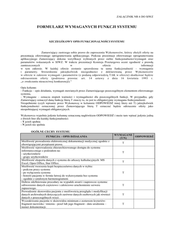 ZAŁĄCZNIK NR 6 DO SIWZ FORMULARZ WYMAGANYCH FUNKCJI SYSTEMU SZCZEGÓŁOWY OPIS FUNKCJONALNOŚCI SYSTEMU Zamawiający zastrzega sobie prawo do zaproszenia Wykonawców, którzy złożyli oferty na prezentację oferowanego oprogramowania aplikacyjnego. Podczas prezentacji oferowanego oprogramowania aplikacyjnego Zamawiający dokona weryfikacji wybranych przez siebie funkcjonalności/wymagań oraz parametrów wskazanych w SIWZ. W trakcie prezentacji Komisja Przetargowa oceni zgodność z prawdą zamieszczonych w ofercie informacji w tym zakresie. W każdej ofercie zostanie sprawdzona ta sama funkcjonalność - wymagania i parametry. Stwierdzenie jakiejkolwiek niezgodności z deklarowaną przez Wykonawców w ofercie w zakresie wymagań i parametrów (z podaną odpowiedzią TAK w ofercie) skutkować będzie odrzuceniem oferty (podstawa prawna: art. 14 ustawy z dnia 16 kwietnia 1993 r. „o zwalczaniu nieuczciwej konkurencji).” Opis kolumn: - Funkcja – opis działania, wymagań stawianych przez Zamawiającego poszczególnym elementom oferowanego systemu, - Wymagane – oznacza stopień ważności i wymagalności dla poszczególnych funkcji. W przypadku, gdy Zamawiający oznaczył daną funkcję literą T znaczy to, że jest to obligatoryjnie wymagana funkcjonalność. Niespełnienie (czyli wpisanie przez Wykonawcę w kolumnie ODPOWIEDŹ innej litery niż T) jakiejkolwiek funkcjonalności oznaczonej przez Zamawiającego literą T oznaczać będzie odrzucenie oferty jako niespełniającej wymagań obligatoryjnych. Wykonawca wypełnia jedynie kolumnę oznaczoną nagłówkiem ODPOWIEDŹ i może tam wpisać jedynie jedną z dwóch liter dla każdej funkcjonalności: - T jeżeli spełnia - N jeżeli nie spełnia OGÓLNE CECHY SYSTEMU FUNKCJA – OPIS DZIAŁANIA Możliwość prowadzenia elektronicznej dokumentacji medycznej zgodnie z obowiązującymi przepisami prawa. Możliwość wprowadzenia zhierarchizowanego dostępu do systemu informatycznego z podziałem na: - użytkowników - grupy użytkowników Możliwość eksportu danych z systemu do arkuszy kalkulacyjnych: MS Excel, Open Office, Star Office. Możliwość tworzenia kopii bezpieczeństwa danych w trybie: - podczas pracy systemu - po wyłączeniu systemu - historii pacjenta w formie łatwej do wykorzystania bez systemu - zgodnie z ustalonym harmonogramem Dobrze zdefiniowane procedury na wypadek awarii i naprawcze systemu: odtworzenie danych częściowo i całościowo uruchomienie serwera zapasowego. Prowadzenie skorowidza pacjenta z możliwością przeglądu i modyfikacji danych archiwalnych dotyczących zarówno danych osobowych jak również danych z poszczególnych wizyt. Wyszukiwanie pacjenta w skorowidzu minimum z zestawem kryteriów: fragment nazwiska / imienia - pesel lub jego fragment - data urodzenia – numer dokumentacji. WYMAGANE ODPOWIEDŹ (T/N) T T T T T T T Informacje o leczeniu pacjenta powinny być dostępne z każdego stanowiska systemu w zakresie właściwym powierzonym zadaniom Każda komórka musi gromadzić dane na potrzeby statystyki medycznej. Na dostęp do pełnej historii choroby pacjenta składają się: - daty i czas leczenia - osoby prowadzące leczenie - wykonane procedury - osoby wykonujące procedury - podane leki - wyniki badań. Możliwość przechowywania wyników badań i dodatkowych informacji o pacjencie w postaci opisowej, plików graficznych i multimedialnych. Tworzenie dziennika czynności wykonanych w systemie. Przegląd dziennika czynności z możliwością wyboru informacji zgodnie z podanymi kryteriami. Automatyczne przekazywania informacji z i do gabinetów i pracowni. Automatyczne przekazywanie informacji do statystyki medycznej. Możliwość śledzenia stanu wykonania zlecenia. Dla wszystkich dokumentów jest dostępny podgląd wydruku. Oprogramowanie powinno umożliwiać pracę z wykorzystaniem protokołów TCP/IP. Aktualizacja oprogramowania klienckiego ZSI odbywa się bezpośrednio z centralnego serwera Dostawca zapewni następujące rodzaje dokumentacji: dokumentację administratora, dokumentację użytkownika, dokumentację szkoleniową, dokumentację struktury baz danych Cała dokumentacja musi być sporządzona w języku polskim, mieć jednolity wygląd, być czytelna i zrozumiała dla czytelników T T T T T T T T T T T T T T BAZA DANYCH FUNKCJA – OPIS DZIAŁANIA Mechanizmy zapewniające wysoką wydajność przetwarzania i skalowalność bazy danych. Scentralizowany sposób zarządzania bazą danych. Narzędzia umożliwiające wygodne zarządzanie bazą, diagnozowanie bazy oraz łatwe ustawianie parametrów eksploatacyjnych. Monitorowanie długotrwałych / czasochłonnych operacji. Możliwość przechowywania danych w formatach tekstowych, graficznych, audio/video, stron www, XML, plików wygenerowanych przez aplikacje takie jak Word, Excel, e-mail. Zaawansowane mechanizmy gwarantujące ochronę danych przed uszkodzeniem. System obsługuje język PL/SQL, umożliwia tworzenie własnych raportów z wykorzystaniem samodzielnie stworzonych procedur i funkcji składowanych. System ma możliwość dalszej rozbudowy o zaawansowane mechanizmy bezpieczeństwa obejmujące silne mechanizmy autentykacji i szyfrowania sieciowego za pomocą zarówno algorytmów szyfrujących jak i zewnętrznych usług autentykacyjnych. System ma możliwość dalszej rozbudowy o narzędzia umożliwiające śledzenie zmian w schematach danych. Środowisko przeznaczone do tworzenia, wdrażania i zarządzania bazodanowymi aplikacjami HTML oraz serwerami stron WWW. Obsługę internetowych portali informacyjnych, transakcji rozproszonych, XML i WebServices, zapewniając przy tym wysoką dostępność danych. Architektura wielowątkowa, wewnętrzna równoległość przetwarzania oraz optymalizacja zapytań zapewniają wysoką wydajność oraz skalowalność. Obsługa transakcji rozproszonych. Wsparcie technologii B2B/B2C, platformy J2EE, WebServices i XML'a. WYMAGANE ODPOWIEDŹ (T/N) T T T T T T T T T T T T Możliwoś