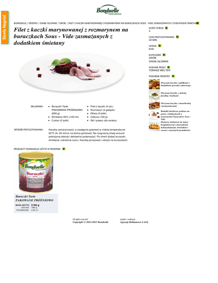 BONDUELLE / PRZEPIS / DANIE GŁÓWNE / DRÓB / FILET Z KACZKI MARYNOWANEJ Z ROZMARYNEM NA BURACZKACH SOUS - VIDE ZASMAŻANYCH Z DODATKIEM ŚMIETANY Filet z kaczki marynowanej z rozmarynem na buraczkach Sous - Vide zasmażanych z dodatkiem śmietany ILOŚĆ PORCJI 4 CZAS PRZYGOTOWANIA 45 MIN OCENA brak KATEGORIE DRÓB DANIE GŁÓWNE DODANE PRZEZ TOMASZ WELTER PODOBNE PRZEPISY Pieczona kaczka z jabłkami z dodatkiem groszku cukrowego Pieczona kaczka z zieloną fasolką i kurkami SKŁADNIKI: SPOSÓB PRZYGOTOWANIA: Buraczki Tarte PAKOWANE PRÓŻNIOWO (600 g) Śmietana 30% (100 ml) Cukier (2 łyżki) Pieczona kaczka z marchewką i pomarańczami Filet z kaczki (4 szt.) Rozmaryn (4 gałązki) Oliwa (4 łyżki) Cebula (100 g) Sól i pieprz (do smaku) Kaczkę zamarynować, a następnie gotować w niskiej temperaturze 62℃ ok. 20 minut, na końcu grillować. Na rozgrzaną oliwę wrzucić pokrojoną cebulę i delikatnie podsmażyć. Po chwili dodać buraczki, śmietanę i odrobinę cukru. Kaczkę porcjować i ułożyć na buraczkach. PRODUKTY BONDUELLE UŻYTE W PRZEPISIE Buraczki Tarte PAKOWANE PRÓŻNIOWO MASA NETTO: 2185 g ODCIEK: 1850 g POJEMNOŚĆ: 3100 ml All rights reserved projekt i realizacja Copyright © 2012-2015 Bonduelle Agencja Reklamowa 4 ALL Roladki drobiowe podane na puree z białej fasoli w towarzystwie buraczków Sous Vide Domowy makaron na mące bezglutenowej z kurczakiem kukurydzianym, brokułem i sosem z suszonych pomidorów