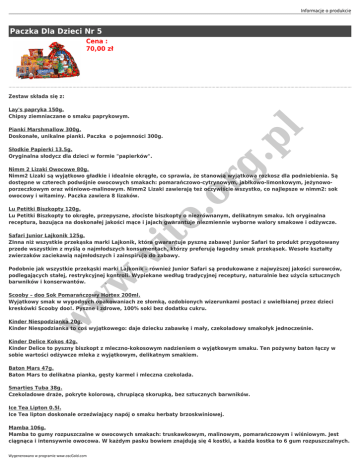 Informacje o produkcie Paczka Dla Dzieci Nr 5 Cena : 70,00 zł Zestaw składa się z: Lay's papryka 150g. Chipsy ziemniaczane o smaku paprykowym. or g. Słodkie Papierki 13.5g. Oryginalna słodycz dla dzieci w formie "papierków". pl Pianki Marshmallow 300g. Doskonałe, unikalne pianki. Paczka o pojemności 300g. Nimm 2 Lizaki Owocowe 80g. Nimm2 Lizaki są wyjątkowo gładkie i idealnie okrągłe, co sprawia, że stanowią wyjątkową rozkosz dla podniebienia. Są dostępne w czterech podwójnie owocowych smakach: pomarańczowo-cytrynowym, jabłkowo-limonkowym, jeżynowoporzeczkowym oraz wiśniowo-malinowym. Nimm2 Lizaki zawierają też oczywiście wszystko, co najlepsze w nimm2: sok owocowy i witaminy. Paczka zawiera 8 lizaków. o. Lu Petitki Biszkopty 120g. Lu Petitki Biszkopty to okrągłe, przepyszne, złociste biszkopty o niezrównanym, delikatnym smaku. Ich oryginalna receptura, bazująca na doskonałej jakości mące i jajach gwarantuje niezmiennie wyborne walory smakowe i odżywcze. w .v it Safari Junior Lajkonik 125g. ZInna niż wszystkie przekąska marki Lajkonik, która gwarantuje pyszną zabawę! Junior Safari to produkt przygotowany przede wszystkim z myślą o najmłodszych konsumentach, którzy preferują łagodny smak przekąsek. Wesołe kształty zwierzaków zaciekawią najmłodszych i zainspirują do zabawy. Podobnie jak wszystkie przekąski marki Lajkonik – również Junior Safari są produkowane z najwyższej jakości surowców, podlegających stałej, restrykcyjnej kontroli. Wypiekane według tradycyjnej receptury, naturalnie bez użycia sztucznych barwników i konserwantów. w w Scooby – doo Sok Pomarańczowy Hortex 200ml. Wyjątkowy smak w wygodnych opakowaniach ze słomką, ozdobionych wizerunkami postaci z uwielbianej przez dzieci kreskówki Scooby doo!. Pyszne i zdrowe, 100% soki bez dodatku cukru. Kinder Niespodzianka 20g. Kinder Niespodzianka to coś wyjątkowego: daje dziecku zabawkę i mały, czekoladowy smakołyk jednocześnie. Kinder Delice Kokos 42g. Kinder Delice to pyszny biszkopt z mleczno-kokosowym nadzieniem o wyjątkowym smaku. Ten pożywny baton łączy w sobie wartości odżywcze mleka z wyjątkowym, delikatnym smakiem. Baton Mars 47g. Baton Mars to delikatna pianka, gęsty karmel i mleczna czekolada. Smarties Tuba 38g. Czekoladowe draże, pokryte kolorową, chrupiącą skorupką, bez sztucznych barwników. Ice Tea Lipton 0.5l. Ice Tea lipton doskonale orzeźwiający napój o smaku herbaty brzoskwiniowej. Mamba 106g. Mamba to gumy rozpuszczalne w owocowych smakach: truskawkowym, malinowym, pomarańczowym i wiśniowym. Jest ciągnąca i intensywnie owocowa. W każdym pasku bowiem znajdują się 4 kostki, a każda kostka to 6 gum rozpuszczalnych. Wygenerowano w programie www.oscGold.com Żelki Zozole Sticks 75g. Owocowe nadzienie żelków Zozole Sticks, określane jako "kabelki", "ołówki", "rurki" od dawna budzi zainteresowanie miłośników owocowych smaków. Zdradzimy Wam sekret - jest to owocowa pasta cukrowa zamknięta w pasiatej żelowej otoczce. Wysoka zawartość soku owocowego czyni ten produkt wyjątkowo smacznym. Plastyczne kolorowe kabelki mogą zostać elementem każdej zabawy, gdzie nie zabraknie fantazji i kreatywności. Delicje Szampańskie Jagodowe 147g. Delicje Szampańskie Jagodowe to przepyszne, miękkie biszkopty z krążkiem soczystej, jagodowej galaretki w polewie z delikatnej, białej czekolady. Każdy kęs tego wyjątkowego ciasteczka dostarczy Ci niezwykłej przyjemności smaku wakacji. Gwarancję najwyższej jakości poświadcza napis „Delicje” na każdym ciastku. Delicje Szampańskie Jagodowej pozwolą Ci delektować się słodkimi chwilami szczęścia zawsze wtedy, gdy tego zapragniesz! w w w .v it o. or g. pl Krakersy Lajkonik Super 180g. Krakersy lajkonik super, to klasyczne słone ciasteczka wyróżniające się delikatnym smakiem i wyjątkową kruchością. Wykonane przy użyciu naturalnych składników, według tradycyjnej receptury, stanowią doskonałą przekąskę dla tych, którzy uwielbiają chrupiącą przyjemność.