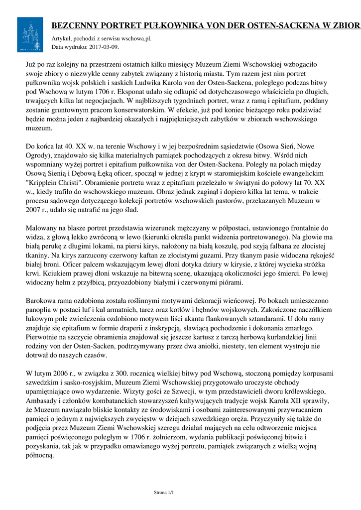 BEZCENNY PORTRET PUŁKOWNIKA VON DER OSTEN-SACKENA W ZBIORA Artykuł‚ pochodzi z serwisu wschowa.pl. Data wydruku: 2017-03-09. Już po raz kolejny na przestrzeni ostatnich kilku miesięcy Muzeum Ziemi Wschowskiej wzbogaciło swoje zbiory o niezwykle cenny zabytek związany z historią miasta. Tym razem jest nim portret pułkownika wojsk polskich i saskich Ludwika Karola von der Osten-Sackena, poległego podczas bitwy pod Wschową w lutym 1706 r. Eksponat udało się odkupić od dotychczasowego właściciela po długich, trwających kilka lat negocjacjach. W najbliższych tygodniach portret, wraz z ramą i epitafium, poddany zostanie gruntownym pracom konserwatorskim. W efekcie, już pod koniec bieżącego roku podziwiać będzie można jeden z najbardziej okazałych i najpiękniejszych zabytków w zbiorach wschowskiego muzeum. Do końca lat 40. XX w. na terenie Wschowy i w jej bezpośrednim sąsiedztwie (Osowa Sień, Nowe Ogrody), znajdowało się kilka materialnych pamiątek pochodzących z okresu bitwy. Wśród nich wspomniany wyżej portret i epitafium pułkownika von der Osten-Sackena. Poległy na polach między Osową Sienią i Dębową Łęką oficer, spoczął w jednej z krypt w staromiejskim kościele ewangelickim "Kripplein Christi". Obramienie portretu wraz z epitafium przeleżało w świątyni do połowy lat 70. XX w., kiedy trafiło do wschowskiego muzeum. Obraz jednak zaginął i dopiero kilka lat temu, w trakcie procesu sądowego dotyczącego kolekcji portretów wschowskich pastorów, przekazanych Muzeum w 2007 r., udało się natrafić na jego ślad. Malowany na blasze portret przedstawia wizerunek mężczyzny w półpostaci, ustawionego frontalnie do widza, z głową lekko zwróconą w lewo (kierunki określa punkt widzenia portretowanego). Na głowie ma białą perukę z długimi lokami, na piersi kirys, nałożony na białą koszulę, pod szyją falbana ze złocistej tkaniny. Na kirys zarzucony czerwony kaftan ze złocistymi guzami. Przy tkanym pasie widoczna rękojeść białej broni. Oficer palcem wskazującym lewej dłoni dotyka dziury w kirysie, z której wycieka stróżka krwi. Kciukiem prawej dłoni wskazuje na bitewną scenę, ukazującą okoliczności jego śmierci. Po lewej widoczny hełm z przyłbicą, przyozdobiony białymi i czerwonymi piórami. Barokowa rama ozdobiona została roślinnymi motywami dekoracji wieńcowej. Po bokach umieszczono panoplia w postaci luf i kul armatnich, tarcz oraz kotłów i bębnów wojskowych. Zakończone naczółkiem łukowym pole zwieńczenia ozdobiono motywem liści akantu flankowanych sztandarami. U dołu ramy znajduje się epitafium w formie draperii z inskrypcją, sławiącą pochodzenie i dokonania zmarłego. Pierwotnie na szczycie obramienia znajdował się jeszcze kartusz z tarczą herbową kurlandzkiej linii rodziny von der Osten-Sacken, podtrzymywany przez dwa aniołki, niestety, ten element wystroju nie dotrwał do naszych czasów. W lutym 2006 r., w związku z 300. rocznicą wielkiej bitwy pod Wschową, stoczoną pomiędzy korpusami szwedzkim i sasko-rosyjskim, Muzeum Ziemi Wschowskiej przygotowało uroczyste obchody upamiętniające owo wydarzenie. Wizyty gości ze Szwecji, w tym przedstawicieli dworu królewskiego, Ambasady i członków kombatanckich stowarzyszeń kultywujących tradycje wojsk Karola XII sprawiły, że Muzeum nawiązało bliskie kontakty ze środowiskami i osobami zainteresowanymi przywracaniem pamięci o jednym z największych zwycięstw w dziejach szwedzkiego oręża. Przyczyniły się także do podjęcia przez Muzeum Ziemi Wschowskiej szeregu działań mających na celu odtworzenie miejsca pamięci poświęconego poległym w 1706 r. żołnierzom, wydania publikacji poświęconej bitwie i pozyskania, tak jak w przypadku omawianego wyżej portretu, pamiątek związanych z wielką wojną północną. Strona 1/1 Powered by TCPDF (www.tcpdf.org)