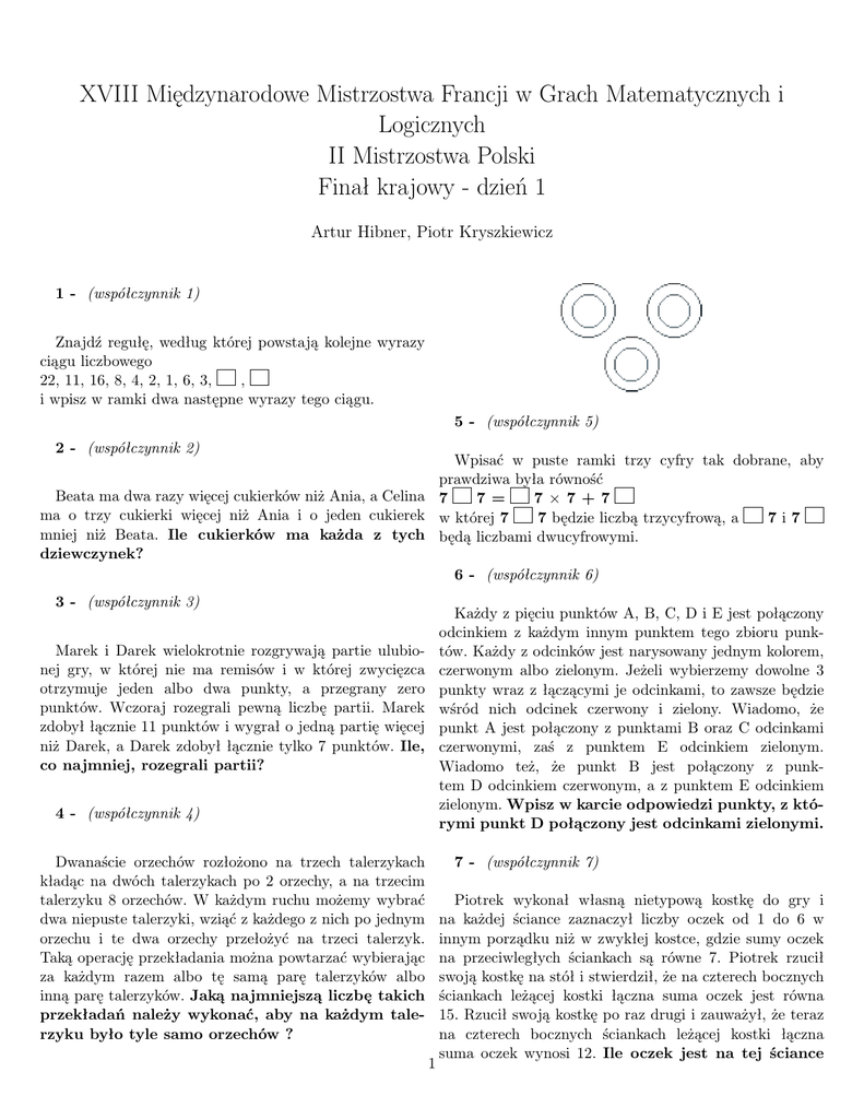 XVIII Międzynarodowe Mistrzostwa Francji w Grach Matematycznych i Logicznych II Mistrzostwa Polski Finał krajowy - dzień 1 Artur Hibner, Piotr Kryszkiewicz 1 - (współczynnik 1) Znajdź regułę, według której powstają kolejne wyrazy ciągu liczbowego 22, 11, 16, 8, 4, 2, 1, 6, 3, , i wpisz w ramki dwa następne wyrazy tego ciągu. 5 - (współczynnik 5) 2 - (współczynnik 2) Wpisać w puste ramki trzy cyfry tak dobrane, aby prawdziwa była równość Beata ma dwa razy więcej cukierków niż Ania, a Celina 7 7= 7×7+7 ma o trzy cukierki więcej niż Ania i o jeden cukierek w której 7 7 będzie liczbą trzycyfrową, a 7i7 mniej niż Beata. Ile cukierków ma każda z tych będą liczbami dwucyfrowymi. dziewczynek? 6 - (współczynnik 6) 3 - (współczynnik 3) Każdy z pięciu punktów A, B, C, D i E jest połączony odcinkiem z każdym innym punktem tego zbioru punktów. Każdy z odcinków jest narysowany jednym kolorem, czerwonym albo zielonym. Jeżeli wybierzemy dowolne 3 punkty wraz z łączącymi je odcinkami, to zawsze będzie wśród nich odcinek czerwony i zielony. Wiadomo, że punkt A jest połączony z punktami B oraz C odcinkami czerwonymi, zaś z punktem E odcinkiem zielonym. Wiadomo też, że punkt B jest połączony z punktem D odcinkiem czerwonym, a z punktem E odcinkiem zielonym. Wpisz w karcie odpowiedzi punkty, z którymi punkt D połączony jest odcinkami zielonymi. Marek i Darek wielokrotnie rozgrywają partie ulubionej gry, w której nie ma remisów i w której zwycięzca otrzymuje jeden albo dwa punkty, a przegrany zero punktów. Wczoraj rozegrali pewną liczbę partii. Marek zdobył łącznie 11 punktów i wygrał o jedną partię więcej niż Darek, a Darek zdobył łącznie tylko 7 punktów. Ile, co najmniej, rozegrali partii? 4 - (współczynnik 4) 7 - (współczynnik 7) Dwanaście orzechów rozłożono na trzech talerzykach kładąc na dwóch talerzykach po 2 orzechy, a na trzecim talerzyku 8 orzechów. W każdym ruchu możemy wybrać dwa niepuste talerzyki, wziąć z każdego z nich po jednym orzechu i te dwa orzechy przełożyć na trzeci talerzyk. Taką operację przekładania można powtarzać wybierając za każdym razem albo tę samą parę talerzyków albo inną parę talerzyków. Jaką najmniejszą liczbę takich przekładań należy wykonać, aby na każdym talerzyku było tyle samo orzechów ? 1 Piotrek wykonał własną nietypową kostkę do gry i na każdej ściance zaznaczył liczby oczek od 1 do 6 w innym porządku niż w zwykłej kostce, gdzie sumy oczek na przeciwległych ściankach są równe 7. Piotrek rzucił swoją kostkę na stół i stwierdził, że na czterech bocznych ściankach leżącej kostki łączna suma oczek jest równa 15. Rzucił swoją kostkę po raz drugi i zauważył, że teraz na czterech bocznych ściankach leżącej kostki łączna suma oczek wynosi 12. Ile oczek jest na tej ściance kostki Piotrka, która jest równoległa do ścianki odważyć na wadze szalkowej każdą masę, której waga jest liczbą całkowitą, od 1 do 11 gramów, kładąc na lewej zawierającej 6 oczek? i prawej szalce wagi po, co najwyżej, jednym odważniku z wybranego zestawu”. Jaki zestaw odważników 8 - (współczynnik 8) wybrał brat Agaty ? W karcie odpowiedzi wypisz, w Liczby naturalne od 1 do 7 można tak rozmieścić w kolejności rosnącej, wagi wybranych odważników. kwadratach i kółkach (rys. poniżej), aby liczba umieszczona w kółku była zawsze sumą liczb umieszczonych w 12 - (współczynnik 12) dwóch kwadratach sąsiadujących z tym kółkiem Mamy 27 jednakowych kostek sześciennych, 15 czarnych i 12 białych. Z tych kostek sklejamy sześcienny klocek w taki sposób, aby czarne i białe kwadraty na każdej z sześciu ścian klocka utworzyły konfiguracje Według tej samej reguły należy rozmieścić dziewięć dające się nałożyć jedna na drugą przez przesuwanie i liczb naturalnych 1, 2, 3, 4, 5, 6, 7, 8 i 9 w kwadratach i ewentualnie przez obracanie. Narysować konfigurację kółkach poniższego diagramu czarnych i białych kwadratów na ścianie klocka dla dwóch różnych sposobów wykonania tego zadania.Dwa sposoby uważamy za różne wtedy, gdy odpowiadające im konfiguracje na ścianie klocka nie dają się nałożyć jedna na drugą przez przesuwanie lub w którym liczba 7 została już umieszczona w ostatnim obracanie. kwadracie. 13 - (współczynnik 13) 9 - (współczynnik 9) Podzielić figurę pokazaną na rysunku poniżej na 4 jednakowe wielokąty o wierzchołkach w punktach kratowych, dające się nałożyć jeden na drugi przez przesuwanie lub obracanie, ale bez odwracania na drugą stronę. Zaznaczyć linie podziału na rysunku w karcie odpowiedzi. W koszu mamy 100 piłeczek ponumerowanych kolejnymi liczbami naturalnymi 1, 2, 3, ... , 100 , a na stole mamy rząd siedmiu, ponumerowanych od 1 do 7, pustych pudełek. Wybieramy z kosza po jednej piłeczce o kolejnych numerach 1, 2, 3, ... i zachowując tę kolejność wypełniamy najpierw pudełko nr 1, potem pudełko nr 2 itd... . W końcu wypełniamy pudełko nr 7. Postępujemy jednak tak, aby w każdym pudełku, począwszy od pudełka z numerem 2, liczba piłeczek była o 1 większa od liczby piłeczek w pudełku o numerze o 1 mniejszym. Piłeczka o numerze 26 znalazła się w pudełku nr 3, a piłeczka o numerze 55 w pudełku nr 6. Ile piłeczek było w pudełku nr 7? 10 - (współczynnik 10) Urodziłem się 15 maja i dziś, tj. 15 maja 2004 obchodzę swoje urodziny. Mam dokładnie tyle lat, ile wynosi suma cyfr roku mojego urodzenia. Podaj rok mojego urodzenia. 14 - (współczynnik 14) 11 - (współczynnik 11) Agata, która ma w pudełku 15 odważników, po jednym odważniku każdej z wag: 1 g, 2 g, 3 g, ... , 15 g wymyśliła dla swojego brata takie oto zadanie: ”Wybierz z pudełka zestaw odważników o możliwie najmniejszej łącznej wadze i tak dobranych, aby z ich pomocą można było Na blacie stolika w kształcie sześciokąta foremnego