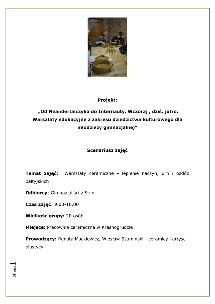 Projekt: „Od Neandertalczyka do Internauty. Wczoraj , dziś, jutro. Warsztaty edukacyjne z zakresu dziedzictwa kulturowego dla młodzieży gimnazjalnej” Scenariusz zajęć Temat zajęć: Warsztaty ceramiczne - lepienie naczyń, urn i ozdób bałtyjskich Odbiorcy: Gimnazjaliści z Sejn Czas zajęć: 9.00-16.00 Wielkość grupy: 20 osób Miejsce: Pracownia ceramiczna w Krasnogrudzie Prowadzący: Renata Mackiewicz, Wiesław Szumiński - ceramicy i artyści Strona 1 plastycy TREŚCI PROGRAMOWE: - zapoznanie z historią miejsca - sposoby produkcji ceramicznej stosowanej przez plemiona bałtyjskie - zastosowanie naczyń ceramicznych w codziennym życiu społeczności lokalnej - wytwórczość rzemiosła codziennego użytku oraz rzemiosła artystycznego - technologia wykonywania naczyń oraz ozdób ceramicznych - wyrób przedmiotów glinianych - zastosowanie urn pogrzebowych - wypał przedmiotów glinianych w tzw. piecach ziemnych CELE OGÓLNE: - zapoznanie z historią i archeologią miejsca - wskazanie kulturowych przyczynek do produkcji ceramiki w tym np. urn pogrzebowych – jako obyczajowego i użytkowego charakteru rzemiosła - prezentacja różnic między wytwórczością w pradziejach, a w czasach dzisiejszych. - ukazanie technologii i sposobów lepienia i zdobienia ceramiki, samodzielna próba wykonania naczynia glinianego EFEKTY WARSZTATU: - wiedza, na temat roli jaką pełnił warsztat garncarski - znajomość podziału ról kobiety i mężczyzny w społecznościach Strona 2 pradziejowych - umiejętność rozróżniania ceramiki wykonanej ręcznie od ceramiki toczonej na kole garncarskim. Wskazywanie różnic - znajomość technologii garncarskich stosowanych w pradziejach (domieszki schudzające dodawane do ceramiki w postaci np. piasku) - objaśnianie, czym była urna w pradziejach - umiejętność samodzielnego przygotowania glinę do zajęć - wykonywanie naczyń glinianych w tym urny, mis, kubków oraz ozdób - wykonywanie zdobień na wytworzonych przedmiotach METODY opis, pokaz, instruktaż, zajęcia praktyczne POMOCE I etap: lepienie naczyń, urn i ozdób z gliny: Glina, narzędzie drewniane do pracy z gliną w tym wałek, nożyki itp., drewniane podkładki pod urny, skrawki materiału na podkładki, worki do przykrycia wykonanych przedmiotów: II etap: wypalanie ceramiki: szpadel, suche drewno najlepiej olchowe, mech leśny (do przykrycia pieca po skończeniu wypału), zapałki PRZEBIEG ZAJĘĆ Cześć teoretyczna - wprowadzenie, ok 30 min. Omówienie materiału, z którego wykonane będą naczynia i ozdoby, zapoznanie uczestników z technologiami lepienia, wprowadzenie Strona 3 instruktażu wykonania itp. Część praktyczna Etap I - przygotowanie: Wykonywanie przez uczestników naczyń: urn i kubków glinianych oraz ozdób z gliny pod opieką plastyków zakończenie sprzątnięcie warsztatów, pracowni, zabezpieczenie podsumowanie wykonanych warsztatów i prac, omówienie efektów pozostawienie prac do wyschnięcia na ok. 1 miesiąc Etap II – wypalanie ceramiki Przygotowanie pieca ziemnego * Wypalanie naczyń w piecu ziemnych * Piec ziemny – zbudowany przez nas piec ziemny powstał na potrzeby warsztatu. Był to dół w ziemi o wymiarach 2x2 m i głębokości ok. 60 cm. W piecu umieściliśmy naczynia gliniane w taki sposób aby do siebie przylegały – dnem do góry. Następnie naczynia zostały przykryte drewnem (najlepiej olchowym). Rozpalony piec palił się kilka godzin. Po wypaleniu przykryliśmy tlący się piec mchem i pozostawiliśmy na ok 2 dni do ostygnięcia, aby po tym czasie móc wybrać z niego wypaloną ceramikę. Opracowała: Katarzyna Radziwiłk0 Projekt realizowany w ramach programu Akademia Orange. Materiał jest dostępny na licencji Creative Commons Uznanie autorstwa 3.0 Polska. Strona 4 Fundacja Pogranicze www.pogranicze.sejny.pl