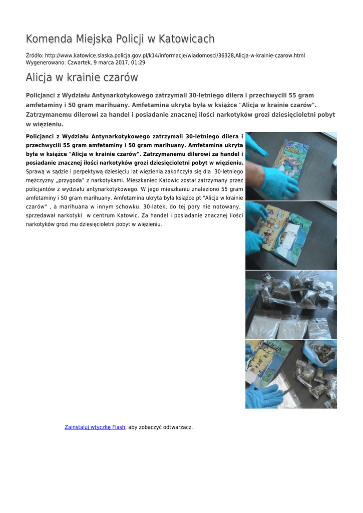 Komenda Miejska Policji w Katowicach Źródło: http://www.katowice.slaska.policja.gov.pl/k14/informacje/wiadomosci/36328,Alicja-w-krainie-czarow.html Wygenerowano: Czwartek, 9 marca 2017, 01:29 Alicja w krainie czarów Policjanci z Wydziału Antynarkotykowego zatrzymali 30-letniego dilera i przechwycili 55 gram amfetaminy i 50 gram marihuany. Amfetamina ukryta była w książce "Alicja w krainie czarów". Zatrzymanemu dilerowi za handel i posiadanie znacznej ilości narkotyków grozi dziesięcioletni pobyt w więzieniu. Policjanci z Wydziału Antynarkotykowego zatrzymali 30-letniego dilera i przechwycili 55 gram amfetaminy i 50 gram marihuany. Amfetamina ukryta była w książce "Alicja w krainie czarów". Zatrzymanemu dilerowi za handel i posiadanie znacznej ilości narkotyków grozi dziesięcioletni pobyt w więzieniu. Sprawą w sądzie i perpektywą dziesięciu lat więzienia zakończyła się dla 30-letniego mężczyzny „przygoda” z narkotykami. Mieszkaniec Katowic został zatrzymany przez policjantów z wydziału antynarkotykowego. W jego mieszkaniu znaleziono 55 gram amfetaminy i 50 gram marihuany. Amfetamina ukryta była książce pt "Alicja w krainie czarów" , a marihuana w innym schowku. 30-latek, do tej pory nie notowany, sprzedawał narkotyki w centrum Katowic. Za handel i posiadanie znacznej ilości narkotyków grozi mu dziesięcioletni pobyt w więzieniu. Zainstaluj wtyczkę Flash, aby zobaczyć odtwarzacz. pobierz film - 1.64 MB Ocena: 0/5 (0) Tweetnij