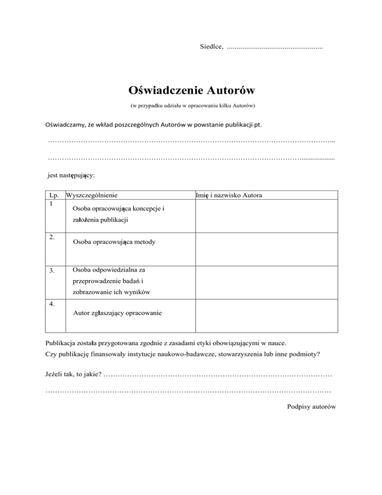 Siedlce, .................................................. Oświadczenie Autorów (w przypadku udziału w opracowaniu kilku Autorów) Oświadczamy, że wkład poszczególnych Autorów w powstanie publikacji pt. …………………………………………………………………………………………………………... ………………………………………………………………………………………………................... jest następujący: Lp. Wyszczególnienie 1 Osoba opracowująca koncepcje i Imię i nazwisko Autora założenia publikacji 2. 3. Osoba opracowująca metody Osoba odpowiedzialna za przeprowadzenie badań i zobrazowanie ich wyników 4. Autor zgłaszający opracowanie Publikacja została przygotowana zgodnie z zasadami etyki obowiązującymi w nauce. Czy publikację finansowały instytucje naukowo-badawcze, stowarzyszenia lub inne podmioty? Jeżeli tak, to jakie? …………………………………………………………………………………… ………………………………………………………………………………………………………… Podpisy autorów