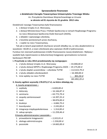 Sprawozdanie finansowe z działalności Zarządu Towarzystwa Uniwersytetu Trzeciego Wieku im. Prezydenta Stanisława Wojciechowskiego w Ursusie w okresie od 01 stycznia do 31 grudnia 2012 roku Działalność naszego Towarzystwa była finansowana: 1. z dotacji Urzędu m.st. Warszawy, 2. z dotacji Ministerstwa Pracy i Polityki Społecznej w ramach Rządowego Programu na rzecz Aktywizacji Społecznej Osób Starszych (ASOS), 3. z składek i wpisowego członków, 4. z kosztów poniesionych przez słuchaczy, 5. z wpłat na rzecz Towarzystwa, Tak jak w latach poprzednich słuchacze wnosili składkę raz, w roku akademickim w wysokości 60,00 zł, a nowi członkowie plus wpisowe 20,00 zł jednorazowo. Fundusz ten stanowił podstawowe źródło finansowania naszej działalności. Wpływy i wydatki były rejestrowane w dokumentacji księgowej i gromadzone na koncie bankowym PKO BP. I. Przychody w roku 2012 przedstawiały się następująco: 1. z tytułu dotacji Urzędu m.st. Warszawy – 33.000,00 zł 2. z tytułu dotacji MPiPS z Rządowego Programu ASOS – 19.175,00 zł 3. z tytułu dopłat uczestników – członków TUTW – 112.615,79 zł 4. z tytułu składek członkowskich – 16.300,00 zł 5. inne wpłaty na rzecz TUTW – 801,50 zł Razem 181.892,29 zł II. Koszty ogółem wynosiły 178.073,17 zł, na które składają się: A koszty programowe – 1. wykłady – 6.820,00 zł 2. lektoraty – 16.166,87 zł 3. seminaria – 63.772,79 zł 4. zespoły zainteresowań – 14.397,25 zł 5. teatr – 38.876,00 zł 6. biuletyn – 4.684,79 zł 7. koordynator – 2.245,00 zł 8. integracja międzypokoleniowa – 1.314,00 zł 9. zakup sprzętu – 11.259,46 zł B koszty administracyjne i pozostałe – 1. prowadzenie księgowości – 2,322,01 zł 2. obsługa administracyjna – 1.550,00 zł 3. pozostałe – 14.665,00 zł Strona 1 z 2 Analizując wyżej wymienione koszty stwierdza się, ze koszty programowe stanowią kwotę złotych – 159.536,16 co stanowi – 89,59 % ogółu kosztów, a koszty administracyjne i pozostałe stanowią kwotę złotych – 18.537,01, co stanowi – 10,41 % ogółu kosztów. Razem koszty stanowią kwotę złotych – 178.073,17 III. Finansowanie kosztów ogółem w kwocie złotych – 178.073,17 z funduszy: 1. z dotacji – kwota złotych 52.175,00 w tym z dotacji Urzędu m.st. Warszawy – kwota zł – 33.000,00 – co stanowi ≈ 19,00 % ogółu kosztów, w tym z dotacji MPiPS w ramach programu ASOS – kwota zł – 19.175,00 – co stanowi ≈ 11,00 % ogółu kosztów, 2. z własnych funduszy – kwota złotych 125.898,17 – co stanowi ≈ 70,00 % ogółu kosztów, w tym dopłaty członków TUTW – kwota zł 112.486,17 – co stanowi ≈ 63,00 % ogółu kosztów, w tym z własnych TUTW – kwota zł 13.412,00 – co stanowi ≈ 7,00 % ogółu kosztów. Dopłaty członków TUTW występowały w następujących pozycjach rodzajowych: lektoraty kwota złotych – 10.534,87 seminaria kwota złotych – 57.079,30 zespoły kwota złotych – 5.336,00 teatr kwota złotych – 38.876,00 pozostałe (wieczorki) kwota złotych – 660,00 Dotacje wykorzystano na pokrycie: kwoty złotych 159.536,16 kosztów programowych w wysokości kwoty złotych 44.274,00, co stanowi 84,84 % całej dotacji, kwoty złotych 18.537,00 kosztów administracyjnych i pozostałych w wysokości 7.901,00, co stanowi 15,16 % całej dotacji. IV. Środki pieniężne: – 1.245,75 gotówka w kasie w kwocie złotych stan konta bankowego w kwocie złotych – 18.042,32 Opracowali: Mirosław Materski, Weronika Zwierzyńska Strona 2 z 2