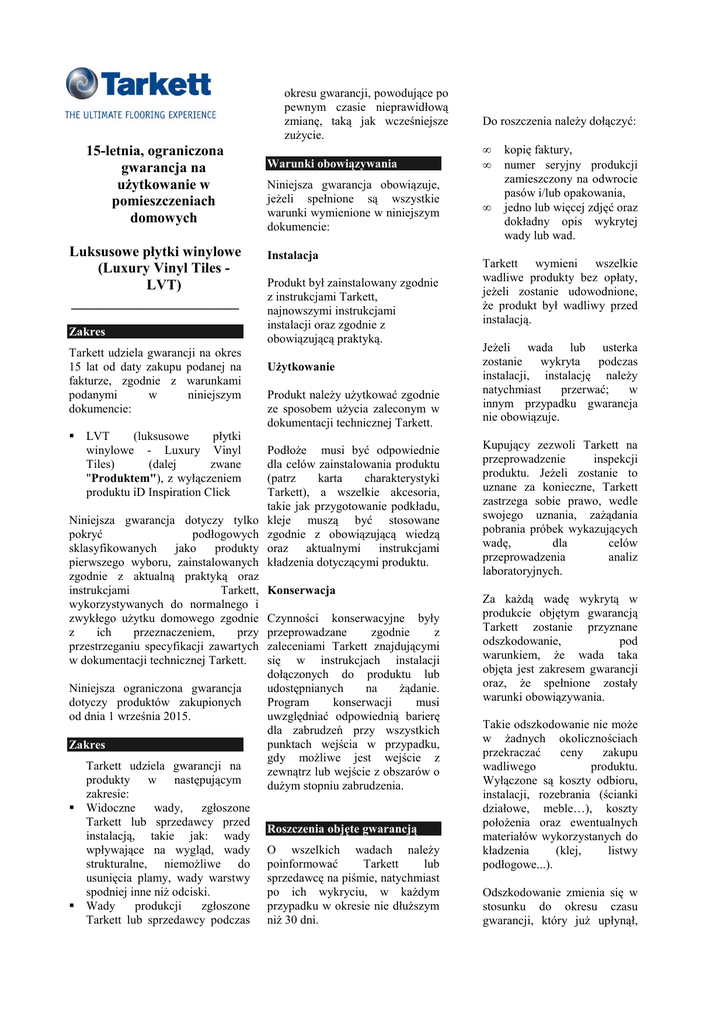 okresu gwarancji, powodujące po pewnym czasie nieprawidłową zmianę, taką jak wcześniejsze zużycie. 15-letnia, ograniczona gwarancja na użytkowanie w pomieszczeniach domowych Luksusowe płytki winylowe (Luxury Vinyl Tiles LVT) _______________________ Zakres Tarkett udziela gwarancji na okres 15 lat od daty zakupu podanej na fakturze, zgodnie z warunkami podanymi w niniejszym dokumencie: LVT (luksusowe płytki winylowe - Luxury Vinyl Tiles) (dalej zwane "Produktem"), z wyłączeniem produktu iD Inspiration Click Niniejsza gwarancja dotyczy tylko pokryć podłogowych sklasyfikowanych jako produkty pierwszego wyboru, zainstalowanych zgodnie z aktualną praktyką oraz instrukcjami Tarkett, wykorzystywanych do normalnego i zwykłego użytku domowego zgodnie z ich przeznaczeniem, przy przestrzeganiu specyfikacji zawartych w dokumentacji technicznej Tarkett. Niniejsza ograniczona gwarancja dotyczy produktów zakupionych od dnia 1 września 2015. Zakres Tarkett udziela gwarancji na produkty w następującym zakresie: Widoczne wady, zgłoszone Tarkett lub sprzedawcy przed instalacją, takie jak: wady wpływające na wygląd, wady strukturalne, niemożliwe do usunięcia plamy, wady warstwy spodniej inne niż odciski. Wady produkcji zgłoszone Tarkett lub sprzedawcy podczas Warunki obowiązywania Niniejsza gwarancja obowiązuje, jeżeli spełnione są wszystkie warunki wymienione w niniejszym dokumencie: Instalacja Produkt był zainstalowany zgodnie z instrukcjami Tarkett, najnowszymi instrukcjami instalacji oraz zgodnie z obowiązującą praktyką. Użytkowanie Produkt należy użytkować zgodnie ze sposobem użycia zaleconym w dokumentacji technicznej Tarkett. Podłoże musi być odpowiednie dla celów zainstalowania produktu (patrz karta charakterystyki Tarkett), a wszelkie akcesoria, takie jak przygotowanie podkładu, kleje muszą być stosowane zgodnie z obowiązującą wiedzą oraz aktualnymi instrukcjami kładzenia dotyczącymi produktu. Konserwacja Czynności konserwacyjne były przeprowadzane zgodnie z zaleceniami Tarkett znajdującymi się w instrukcjach instalacji dołączonych do produktu lub udostępnianych na żądanie. Program konserwacji musi uwzględniać odpowiednią barierę dla zabrudzeń przy wszystkich punktach wejścia w przypadku, gdy możliwe jest wejście z zewnątrz lub wejście z obszarów o dużym stopniu zabrudzenia. Roszczenia objęte gwarancją O wszelkich wadach należy poinformować Tarkett lub sprzedawcę na piśmie, natychmiast po ich wykryciu, w każdym przypadku w okresie nie dłuższym niż 30 dni. Do roszczenia należy dołączyć: • • • kopię faktury, numer seryjny produkcji zamieszczony na odwrocie pasów i/lub opakowania, jedno lub więcej zdjęć oraz dokładny opis wykrytej wady lub wad. Tarkett wymieni wszelkie wadliwe produkty bez opłaty, jeżeli zostanie udowodnione, że produkt był wadliwy przed instalacją. Jeżeli wada lub usterka zostanie wykryta podczas instalacji, instalację należy natychmiast przerwać; w innym przypadku gwarancja nie obowiązuje. Kupujący zezwoli Tarkett na przeprowadzenie inspekcji produktu. Jeżeli zostanie to uznane za konieczne, Tarkett zastrzega sobie prawo, wedle swojego uznania, zażądania pobrania próbek wykazujących wadę, dla celów przeprowadzenia analiz laboratoryjnych. Za każdą wadę wykrytą w produkcie objętym gwarancją Tarkett zostanie przyznane odszkodowanie, pod warunkiem, że wada taka objęta jest zakresem gwarancji oraz, że spełnione zostały warunki obowiązywania. Takie odszkodowanie nie może w żadnych okolicznościach przekraczać ceny zakupu wadliwego produktu. Wyłączone są koszty odbioru, instalacji, rozebrania (ścianki działowe, meble…), koszty położenia oraz ewentualnych materiałów wykorzystanych do kładzenia (klej, listwy podłogowe...). Odszkodowanie zmienia się w stosunku do okresu czasu gwarancji, który już upłynął, uwzględniając produktu: ≤ ≤ ≤ ≤ ≤ 2 lata 4 6 10 15 amortyzację 100% 80 60 40 20 Wyłączenia gwarancji Niniejsza gwarancja nie obowiązuje w następujących przypadkach: 1. Produkty używane, przecenione lub inne niestandardowe produkty o obniżonej jakości sprzedawane są w stanie "tak jak jest". 2. Wady spowodowane nieprawidłową instalacją, w sposób sprzeczny z przyjętą praktyką oraz aktualnymi, określonymi przez Tarkett instrukcjami kładzenia dotyczącymi Produktu. 3. Produkty, z którymi obchodzono się w niewłaściwy sposób, wykorzystywane dla celów innych, niż użytkowanie domowe, lub niewłaściwie przechowywane. 4. Niniejsza gwarancja jest nieważna, jeżeli wada powstała w wyniku pożaru, wypadku, włączając agresywny atak chemiczny, eksplozję, zanieczyszczenie, powódź, niskie temperatury (mróz), uderzenie pioruna, niedbalstwo, wandalizm lub brak mat stanowiących barierę przy wejściu, uszkodzenie podczas transportu, przechowywania lub obchodzenia się z produktem przed lub podczas instalacji. 5. Produkty przycięte lub położone, posiadające widoczną wadę. 6. Produkty, które były niewłaściwie konserwowane, w sposób sprzeczny z instrukcjami oraz zaleceniami konserwacji Tarkett. 7. Produkty, których stan pogorszył się w wyniku nierównego podkładu izolacyjnego. 8. Różnice koloru, połysku lub wytłoczenia występujące pomiędzy produktami sprzedanymi a zdjęciami lub próbkami. W przypadku umów zakupu różnice w produkcji, włączając zmianę koloru różnych partii produktów. 9. Szkody spowodowane wystąpieniem plam, miejsc przypalonych, przecięć, wyżłobień, przetarć, przypadkowych wgnieceń, utratą koloru spowodowaną warstwą spodnią dywanu, powierzchni pomalowanych, żółcenia spowodowanego produktami zewnętrznymi (asfalt, smoła...). 10. Wgłębienia spowodowane przez wysokie lub ostre obcasy, a także niezabezpieczone nogi stołów, krzeseł lub innych mebli. 11. Blaknięcie i/lub utrata koloru. 12. Niezastosowanie się do zalecanych poziomów higrometryczny