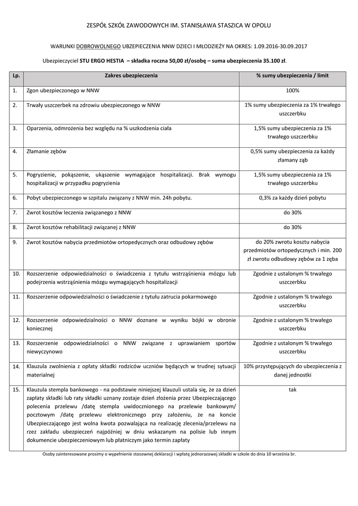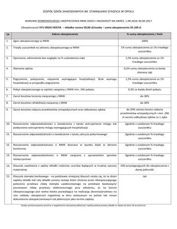 ZESPÓŁ SZKÓŁ ZAWODOWYCH IM. STANISŁAWA STASZICA W OPOLU WARUNKI DOBROWOLNEGO UBZEPIECZENIA NNW DZIECI I MŁODZIEŻY NA OKRES: 1.09.2016-30.09.2017 Ubezpieczyciel STU ERGO HESTIA – składka roczna 50,00 zł/osobę – suma ubezpieczenia 35.100 zł. Lp. Zakres ubezpieczenia % sumy ubezpieczenia / limit 1. Zgon ubezpieczonego w NNW 100% 2. Trwały uszczerbek na zdrowiu ubezpieczonego w NNW 3. Oparzenia, odmrożenia bez względu na % uszkodzenia ciała 4. Złamanie zębów 5. Pogryzienie, pokąszenie, ukąszenie wymagające hospitalizacji. Brak wymogu hospitalizacji w przypadku pogryzienia 6. Pobyt ubezpieczonego w szpitalu związany z NNW min. 24h pobytu. 7. Zwrot kosztów leczenia związanego z NNW do 30% 8. Zwrot kosztów rehabilitacji związanej z NNW do 30% 9. Zwrot kosztów nabycia przedmiotów ortopedycznych oraz odbudowy zębów 10. Rozszerzenie odpowiedzialności o świadczenia z tytułu wstrząśnienia mózgu lub podejrzenia wstrząśnienia mózgu wymagających hospitalizacji Zgodnie z ustalonym % trwałego uszczerbku 11. Rozszerzenie odpowiedzialności o świadczenie z tytułu zatrucia pokarmowego Zgodnie z ustalonym % trwałego uszczerbku 12. Rozszerzenie odpowiedzialności o NNW doznane w wyniku bójki w obronie koniecznej Zgodnie z ustalonym % trwałego uszczerbku 13. Rozszerzenie odpowiedzialności o NNW związane z uprawianiem sportów niewyczynowo Zgodnie z ustalonym % trwałego uszczerbku 14. Klauzula zwolnienia z opłaty składki rodziców uczniów będących w trudnej sytuacji materialnej 10% przystępujących do ubezpieczenia z danej jednostki 15. Klauzula stempla bankowego - na podstawie niniejszej klauzuli ustala się, że za dzień zapłaty składki lub raty składki uznany zostaje dzień złożenia przez Ubezpieczającego polecenia przelewu /datę stempla uwidocznionego na przelewie bankowym/ pocztowym /datę przelewu elektronicznego przy założeniu, że na koncie Ubezpieczającego jest wolna kwota pozwalająca na realizację zlecenia/przelewu na rzez zakładu ubezpieczeń najpóźniej w dniu wskazanym na polisie lub innym dokumencie ubezpieczeniowym lub płatniczym jako termin zapłaty tak 1% sumy ubezpieczenia za 1% trwałego uszczerbku 1,5% sumy ubezpieczenia za 1% trwałego uszczerbku 0,5% sumy ubezpieczenia za każdy złamany ząb 1,5% sumy ubezpieczenia za 1% trwałego uszczerbku 0,3% za każdy dzień pobytu do 20% zwrotu kosztu nabycia przedmiotów ortopedycznych i min. 200 zł zwrotu odbudowy zębów za 1 zęba Osoby zainteresowane prosimy o wypełnienie stosownej deklaracji i wpłatę jednorazowej składki w szkole do dnia 10 września br.
