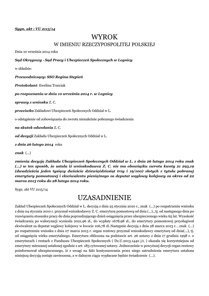 Sygn. akt : VU 2115/14 WYROK W IMIENIU RZECZYPOSPOLITEJ POLSKIEJ Dnia 10 września 2014 roku Sąd Okręgowy - Sąd Pracy i Ubezpieczeń Społecznych w Legnicy w składzie: Przewodniczący: SSO Regina Stępień Protokolant: Ewelina Trzeciak po rozpoznaniu w dniu 10 września 2014 r. w Legnicy sprawy z wniosku Z. C. przeciwko Zakładowi Ubezpieczeń Społecznych Oddział w L. o odstąpienie od zobowiązania do zwrotu nienależnie pobranego świadczenia na skutek odwołania Z. C. od decyzji Zakładu Ubezpieczeń Społecznych Oddział w L. z dnia 26 lutego 2014 roku znak (...) zmienia decyzję Zakładu Ubezpieczeń Społecznych Oddział w L. z dnia 26 lutego 2014 roku znak (...) w ten sposób, że ustala iż wnioskodawca Z. C. nie ma obowiązku zwrotu kwoty 21 293,19 (dwadzieścia jeden tysięcy dwieście dziewięćdziesiąt trzy i 19/100) złotych z tytułu pobranej emerytury pomostowej i ekwiwalentu pieniężnego za deputat węglowy kolejowy za okres od 22 marca 2013 roku do 28 lutego 2014 roku. Sygn. akt VU 2115/14 UZASADNIENIE Zakład Ubezpieczeń Społecznych Oddział w L. decyzją z dnia 25 stycznia 2010 r., znak (...) po rozpatrzeniu wniosku z dnia 04 stycznia 2010 r. przyznał wnioskodawcy Z. C. emeryturę pomostową od dnia (...)., tj. od następnego dnia po rozwiązaniu stosunku pracy do dnia poprzedzającego dzień osiągnięcia przez ubezpieczonego wieku 65 lat. Wysokość świadczenia po waloryzacji wyniosła 2021,96 zł., do wypłaty 1678,98 zł., do emerytury pomostowej przysługiwał ekwiwalent za deputat węglowy kolejowy w kwocie 106,78 zł..Następnie decyzją z dnia 28 marca 2013 r. , znak (...) po rozpatrzeniu wniosku z dnia 07 marca 2013 r. organ rentowy przyznał wnioskodawcy emeryturę od dnia(...), tj. od osiągnięcia wieku emerytalnego. Emerytura obliczona na podstawie art. 26 ustawy z dnia 17 grudnia 1998 r. o emeryturach i rentach z Funduszu Ubezpieczeń Społecznych ( Dz.U.2013.1440 j.t. ) okazała się korzystniejsza od emerytury mieszanej ustalonej zgodnie z art. 183 cytowanej ustawy. Jednocześnie w powyższej decyzji organ rentowy poinformował ubezpieczonego, iż z uwagi na fakt kontynuowania przez niego zatrudnienia emerytura ustalona niniejszą decyzją zostaje zawieszona, a w dalszym ciągu wypłacane będzie świadczenie (...). Decyzją z dnia 19 lutego 2014 r., znak (...), ZUS Oddział w L., powołując się na art. 16 pkt 1 ustawy z dnia 19 grudnia 2008 r. o emeryturach pomostowych (Dz.U.2008.237.1656 ze zm. ) odmówił skarżącemu prawa do emerytury pomostowej z uwagi na fakt nabycia przez niego, na mocy decyzji z dnia 28 marca 2013 r., prawa do emerytury od dnia 22 marca 2013 r. co spowodowało, iż z tym dniem ustało prawo do emerytury pomostowej. Niniejszą decyzją zmieniono równocześnie decyzję z dnia 28 marca 2013 r. w części dotyczącej kontynuowania wypłaty emerytury pomostowej. Konsekwencją powyższej decyzji była decyzja ZUS z dnia 26 lutego 2014 r., znak (...) zobowiązująca wnioskodawcę do zwrotu nienależnie pobranych świadczeń za okres od 22 marca 2013 r. do 28 lutego 2014 r. w łącznej kwocie 21 293, 19 zł. z tytułu ekwiwalentu pieniężnego za deputat węglowy kolejowy, emerytury pomostowej. Od powyższej decyzji ZUS z dnia 26 lutego 2014 r. wnioskodawca wniósł odwołanie wnosząc o jej zmianę i podnosząc, iż faktycznie informacja o ustaniu prawa do emerytury pomostowej powinna być już zamieszczona w decyzji z dnia 28 marca 2013 r., a nie w wydanej rok później decyzji z dnia 19 lutego 2014 r..Tym samym żądanie zwrotu wypłaconej emerytury pomostowej i ekwiwalentu za deputat węglowy kolejowy za okres od 22 marca 2013 r. do 28 lutego 2014 r., w ocenie skarżącego są bezpodstawne. W odpowiedzi organu rentowego na powyższe odwołanie wniósł on o oddalenie odwołania podnosząc, iż ubezpieczony zarówno w decyzji o przyznaniu emerytury pomostowej z dnia 25 stycznia 2010 r. jak i w decyzji o przyznaniu emerytury z dnia 28 marca 2013 r. został pouczony o treści art. 16 ustawy o emeryturach pomostowych oraz art. 138 ust.1, 2 i 3 ustawy o emeryturach i rentach z FUS i pomimo tego po przyznaniu prawa do emerytury powszechnej na podstawie ustawy emerytalnej nadal pobierał emeryturę pomostową. Sąd ustalił następujący stan faktyczny: Z. C., urodzony (...). Decyzją z dnia 25 stycznia 2010 r., znak (...) ZUS Oddział w L. przyznał wnioskodawcy Z. C. emeryturę pomostową od dnia 01 stycznia 2010 r..W części IV pkt 3 niniejszej decyzji znajdowało się pouczenie o okolicznościach powodujących ustanie prawa do emerytury pomostowej. W dniu 07 marca 2013 r. skarżący złożył do organu rentowego wniosek o emeryturę powszechną w którym w pkt III pkt 3 oświadczył, iż pobiera emeryturę pomostową, podając równocześnie numer sprawy (...). Decyzją z dnia 28 marca 2013 r. , znak (...) organ rentowy przyznał wnioskodawcy emeryturę od dnia (...), tj. od osiągnięcia wieku emerytalnego. Jednocześnie w powyższej decyzji organ rentowy poinformował ubezpieczonego, iż z uwagi na fakt kontynuowania przez niego zatrudnienia emerytura ustalona niniejszą decyzją zostaje zawieszona, a w dalszym ciągu wypłacane będzie świadczenie (...). W pouczeniu zawartym w niniejszej decyzji w pkt III zawarta została informacja o obowiązku zwrotu nienależnie pobranego świadczenia oraz wyjaśniono definicję nienależnie pobranego świadczenia. Dowód: akta ZUS - decyzja ZUS z dnia 25 stycznia 2010 r., k. 81-83; t. II akt ZUS – wniosek o emeryturę z dnia 07 marca 2013 r., k. 1-4; decyzja ZUS z dnia 28 marca 2013 r., k. 13-14. Decyzją z dnia 19 lutego 2014 r., znak (...), ZUS Oddział w L., powołując się na art. 16 pkt 1 ustawy z dnia 19 grudnia 2008 r. o emeryturach pomostowych (Dz.U.2008.237.1656 ze zm. ) odmówił skarżącemu prawa do emerytury pomostowej z uwagi na fakt nabycia przez niego, na mocy decyzji z dnia 28 marca 2013 r., prawa do emerytury powszechnej od dnia 22 marca 2013 r. co spowodow