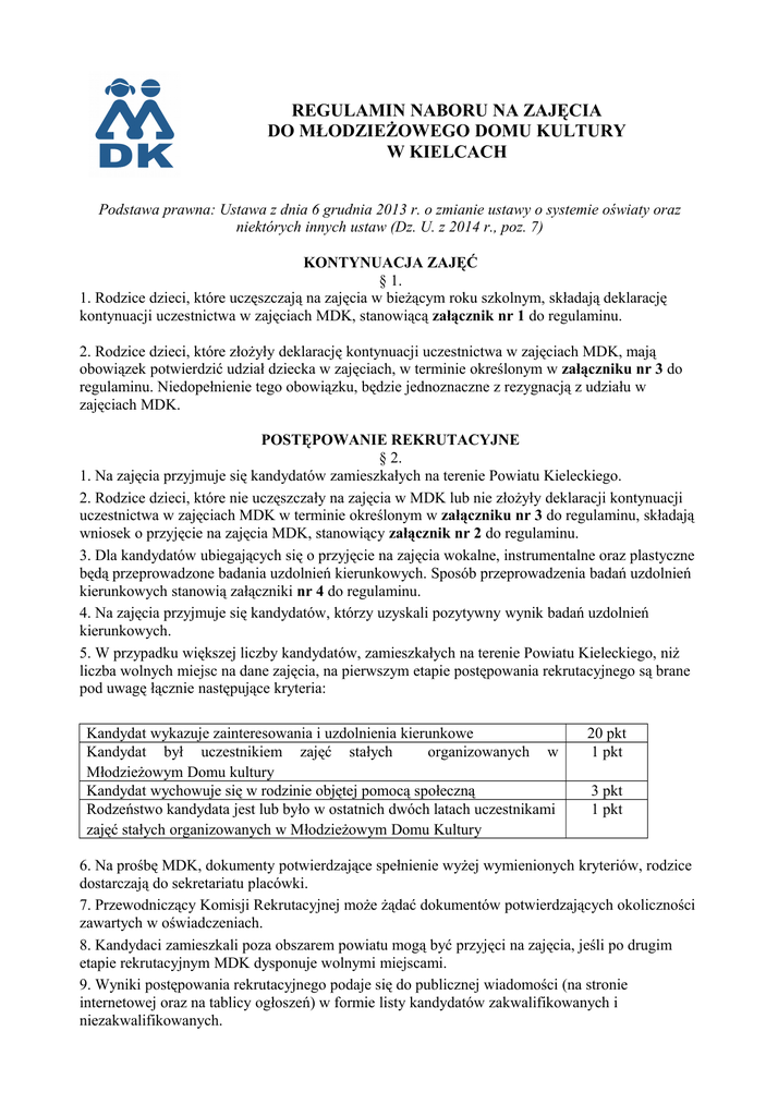 REGULAMIN NABORU NA ZAJĘCIA DO MŁODZIEŻOWEGO DOMU KULTURY W KIELCACH Podstawa prawna: Ustawa z dnia 6 grudnia 2013 r. o zmianie ustawy o systemie oświaty oraz niektórych innych ustaw (Dz. U. z 2014 r., poz. 7) KONTYNUACJA ZAJĘĆ § 1. 1. Rodzice dzieci, które uczęszczają na zajęcia w bieżącym roku szkolnym, składają deklarację kontynuacji uczestnictwa w zajęciach MDK, stanowiącą załącznik nr 1 do regulaminu. 2. Rodzice dzieci, które złożyły deklarację kontynuacji uczestnictwa w zajęciach MDK, mają obowiązek potwierdzić udział dziecka w zajęciach, w terminie określonym w załączniku nr 3 do regulaminu. Niedopełnienie tego obowiązku, będzie jednoznaczne z rezygnacją z udziału w zajęciach MDK. POSTĘPOWANIE REKRUTACYJNE § 2. 1. Na zajęcia przyjmuje się kandydatów zamieszkałych na terenie Powiatu Kieleckiego. 2. Rodzice dzieci, które nie uczęszczały na zajęcia w MDK lub nie złożyły deklaracji kontynuacji uczestnictwa w zajęciach MDK w terminie określonym w załączniku nr 3 do regulaminu, składają wniosek o przyjęcie na zajęcia MDK, stanowiący załącznik nr 2 do regulaminu. 3. Dla kandydatów ubiegających się o przyjęcie na zajęcia wokalne, instrumentalne oraz plastyczne będą przeprowadzone badania uzdolnień kierunkowych. Sposób przeprowadzenia badań uzdolnień kierunkowych stanowią załączniki nr 4 do regulaminu. 4. Na zajęcia przyjmuje się kandydatów, którzy uzyskali pozytywny wynik badań uzdolnień kierunkowych. 5. W przypadku większej liczby kandydatów, zamieszkałych na terenie Powiatu Kieleckiego, niż liczba wolnych miejsc na dane zajęcia, na pierwszym etapie postępowania rekrutacyjnego są brane pod uwagę łącznie następujące kryteria: Kandydat wykazuje zainteresowania i uzdolnienia kierunkowe Kandydat był uczestnikiem zajęć stałych organizowanych w Młodzieżowym Domu kultury Kandydat wychowuje się w rodzinie objętej pomocą społeczną Rodzeństwo kandydata jest lub było w ostatnich dwóch latach uczestnikami zajęć stałych organizowanych w Młodzieżowym Domu Kultury 20 pkt 1 pkt 3 pkt 1 pkt 6. Na prośbę MDK, dokumenty potwierdzające spełnienie wyżej wymienionych kryteriów, rodzice dostarczają do sekretariatu placówki. 7. Przewodniczący Komisji Rekrutacyjnej może żądać dokumentów potwierdzających okoliczności zawartych w oświadczeniach. 8. Kandydaci zamieszkali poza obszarem powiatu mogą być przyjęci na zajęcia, jeśli po drugim etapie rekrutacyjnym MDK dysponuje wolnymi miejscami. 9. Wyniki postępowania rekrutacyjnego podaje się do publicznej wiadomości (na stronie internetowej oraz na tablicy ogłoszeń) w formie listy kandydatów zakwalifikowanych i niezakwalifikowanych. 10. Rodzice dzieci zakwalifikowanych, mają obowiązek potwierdzić udział dziecka w zajęciach w terminie określonym w załączniku nr 3 do regulaminu. Niedopełnienie tego obowiązku, będzie jednoznaczne z rezygnacją z udziału w zajęciach MDK. POSTĘPOWANIE REKRUTACYJNE UZUPEŁNIAJĄCE §3. 1. Jeżeli w wyniku postępowania rekrutacyjnego pozostaną wolne miejsca na określone zajęcia, będzie przeprowadzone postępowanie rekrutacyjne uzupełniające. 2. W trybie postępowania rekrutacyjnego uzupełniającego w terminie określonym w załączniku nr 3 do regulaminu, rodzice dzieci składają wniosek o przyjęcie na zajęcia w PMDK - stanowiący załącznik nr 2 do regulaminu. 3. Wyniki postępowania rekrutacyjnego uzupełniającego podaje się do publicznej wiadomości (na stronie internetowej) w formie listy kandydatów zakwalifikowanych i niezakwalifikowanych 4. Rodzice dzieci zakwalifikowanych, mają obowiązek potwierdzić udział dziecka w zajęciach w terminie określonym w załączniku nr 3 do regulaminu. Niedopełnienie tego obowiązku będzie jednoznaczne z rezygnacją z udziału w zajęciach MDK. POSTĘPOWANIE REKRUTACYJNE W CIĄGU ROKU SZKOLNEGO § 5. 1. W przypadku wolnych miejsc, nabór na zajęcia prowadzony jest przez cały rok szkolny, a informacja o wolnych miejscach publikowana jest na stronie internetowej MDK. 2. Rodzice dzieci składają wniosek o przyjęcie na zajęcia w MDK. KOMISJA REKRUTACYJNA § 6. 1. Postępowanie rekrutacyjne przeprowadza komisja rekrutacyjna powołana przez dyrektora. 2. Do zadań komisji należy: a) ustalenie wyników postępowania rekrutacyjnego i podanie do publicznej wiadomości listy kandydatów zakwalifikowanych i niezakwalifikowanych; b) sporządzenie protokołu postępowania rekrutacyjnego. 3. Komisja rekrutacyjna przyjmuje kandydata, jeżeli w wyniku postępowania rekrutacyjnego kandydat został zakwalifikowany oraz złożył wymagane dokumenty. TRYB ODWOŁAWCZY § 7. 1.W terminie 7 dni od dnia podania do publicznej wiadomości listy kandydatów przyjętych i nieprzyjętych rodzic kandydata może wystąpić do komisji rekrutacyjnej z wnioskiem o sporządzenie uzasadnienia odmowy przyjęcia kandydata. 2.Uzasadnienie sporządza się w terminie 5 dni od dnia wystąpienia przez rodzica kandydata z wnioskiem, o którym mowa w ust. 1. Uzasadnienie zawiera przyczyny odmowy przyjęcia, w tym najniższą liczbę punktów, która uprawniała do przyjęcia, oraz liczbę punktów, którą kandydat uzyskał w postępowaniu rekrutacyjnym DANE OSOBOWE § 11. 1.Dane osobowe dziecka do celów rekrutacji w tym informacji dotyczących jego stanu zdrowia oraz w związku z podejmowanymi działaniami wynikającymi z organizacji pracy Młodzieżowego Domu Kultury zgodnie z ustawą z dnia 29 sierpnia 1997 r. o ochronie danych osobowych (Dz. U. z 2002 r. nr 101 poz. 926 z późn. zm.) i Polityką Bezpieczeństwa Informacji Młodzieżowego Domu Kultury w Kielcach 2. Nieograniczone czasowo przetwarzanie danych osobowych w zakresie wizerunku dziecka (z imieniem i nazwiskiem) w postaci fotografii cyfrowej i materiałów audiowizualnych wyłącznie na potrzeby promocji MDK, prowadzonej za pośrednictwem strony internetowej, Facebooka i banerów reklamowych zgodnie 