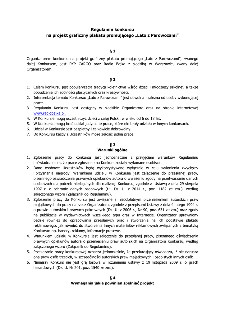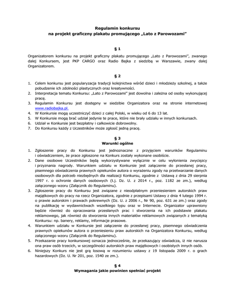 Regulamin konkursu na projekt graficzny plakatu promującego „Lato z Parowozami” §1 Organizatorem konkursu na projekt graficzny plakatu promującego „Lato z Parowozami”, zwanego dalej Konkursem, jest PKP CARGO oraz Radio Bajka z siedzibą w Warszawie, zwany dalej Organizatorem. §2 1. Celem konkursu jest popularyzacja tradycji kolejnictwa wśród dzieci i młodzieży szkolnej, a także pobudzenie ich zdolności plastycznych oraz kreatywności. 2. Interpretacja tematu Konkursu: „Lato z Parowozami” jest dowolna i zależna od osoby wykonującej pracę. 3. Regulamin Konkursu jest dostępny w siedzibie Organizatora oraz na stronie internetowej www.radiobajka.pl. 4. W Konkursie mogą uczestniczyć dzieci z całej Polski, w wieku od 6 do 13 lat. 5. W Konkursie mogą brać udział jedynie te prace, które nie brały udziału w innych konkursach. 6. Udział w Konkursie jest bezpłatny i całkowicie dobrowolny. 7. Do Konkursu każdy z Uczestników może zgłosić jedną pracę. §3 Warunki ogólne 1. Zgłoszenie pracy do Konkursu jest jednoznaczne z przyjęciem warunków Regulaminu i oświadczeniem, że prace zgłoszone na Konkurs zostały wykonane osobiście. 2. Dane osobowe Uczestników będą wykorzystywane wyłącznie w celu wyłonienia zwycięzcy i przyznania nagrody. Warunkiem udziału w Konkursie jest załączenie do przesłanej pracy, pisemnego oświadczenia prawnych opiekunów autora o wyrażeniu zgody na przetwarzanie danych osobowych dla potrzeb niezbędnych dla realizacji Konkursu, zgodnie z Ustawą z dnia 29 sierpnia 1997 r. o ochronie danych osobowych (t.j. Dz. U. z 2014 r., poz. 1182 ze zm.), według załączonego wzoru (Załącznik do Regulaminu). 3. Zgłoszenie pracy do Konkursu jest związane z nieodpłatnym przeniesieniem autorskich praw majątkowych do pracy na rzecz Organizatora, zgodnie z przepisami Ustawy z dnia 4 lutego 1994 r. o prawie autorskim i prawach pokrewnych (Dz. U. z 2006 r., Nr 90, poz. 631 ze zm.) oraz zgody na publikację w wydawnictwach wszelkiego typu oraz w Internecie. Organizator uprawniony będzie również do opracowania przesłanych prac i stworzenia na ich podstawie plakatu reklamowego, jak również do stworzenia innych materiałów reklamowych związanych z tematyką Konkursu: np. banery, reklamy, informacje prasowe. 4. Warunkiem udziału w Konkursie jest załączenie do przesłanej pracy, pisemnego oświadczenia prawnych opiekunów autora o przeniesieniu praw autorskich na Organizatora Konkursu, według załączonego wzoru (Załącznik do Regulaminu). 5. Przekazanie pracy konkursowej oznacza jednocześnie, że przekazujący oświadcza, iż nie narusza ona praw osób trzecich, w szczególności autorskich praw majątkowych i osobistych innych osób. 6. Niniejszy Konkurs nie jest grą losową w rozumieniu ustawy z 19 listopada 2009 r. o grach hazardowych (Dz. U. Nr 201, poz. 1540 ze zm.). §4 Wymagania jakie powinien spełniać projekt 1. Uczestnik może wykonać pracę związaną z tematem Konkursu, wybraną przez siebie techniką plastyczną, w formacie minimum A4, maksimum A3. Konkurs nie obejmuje prac przestrzennych. 2. Zgłoszenie prac następuje poprzez przesłanie zdjęć wykonanych prac w postaci plików graficznych JPG na adres e-mail: [email protected], w tytule e-maila prosimy napisać: Konkurs na plakat – „Lato z Parowozami”. Do wiadomości e-mail Uczestnik Konkursu załącza (w formacie JPG, PDF) wypełniony i podpisany formularz, stanowiący Załącznik do Regulaminu. 3. W konkursie będą rozpatrywane tylko i wyłącznie prace, które zostały wysłane, wraz z wypełnionym i podpisanych formularzem, na w/w adres e-mail do dnia 26 maja 2015 r. godz. 10.00 włącznie. 4. Prace konkursowe należy przesłać w formacie plików JPG. Rozmiar e-maila nie może przekroczyć 5 MB. 5. Każde zgłoszenie przesłane na Konkurs będzie potwierdzone krótką wiadomością elektroniczną. Osoby, które nie otrzymają potwierdzenia w ciągu 3 dni roboczych od dnia przesłania pracy, proszone są o kontakt z Organizatorem. Niepotwierdzone zgłoszenia nie będą rozpatrywane w Konkursie. 6. W treści wiadomości należy podać adres poczty elektronicznej, na który przesłana ma zostać wiadomość potwierdzająca zgłoszenie oraz imię, nazwisko, adres i telefon kontaktowy opiekuna prawnego autora. 7. Konkurs zostanie rozstrzygnięty na zasadzie anonimowości. Członkom Komisji Konkursowej zostaną zaprezentowane prace. Każdemu zgłoszeniu zostanie nadany numer porządkowy, a po ostatecznej decyzji Komisji Konkursowej zostanie ujawnione nazwisko autora zwycięskiej pracy. 8. Autorzy nagrodzonych prac zobowiązani są do ich przesłania (oryginał pracy), wraz z wypełnionym i podpisanym formularzem, stanowiącym Załącznik do Regulaminu (oryginał formularza), drogą pocztową na adres: Clear Communication Group, ul. Aleja Niepodległości 159/21, 02-555 Warszawa. Przesłanie pracy oraz formularza jest warunkiem wydania nagrody. §5 Kryteria oceny 1. Przesłane prace zostaną poddane ocenie przez Komisję Konkursową, z przedstawicieli Organizatora oraz grafika współpracującego z Organizatorem. 2. Każdy z członków Komisji Konkursowej dysponuje jednym głosem. 3. Prace oceniane będą pod względem artystycznym oraz merytorycznym. 4. Komisja Konkursowa dokona wyboru trzech najlepszych prac. 5. Decyzje Komisji są ostateczne i nie przysługuje od nich odwołanie. składającą się §6 Nagroda 1. Za nagrodzony projekt zostanie przyznana nagroda w postaci klocków LEGO o równowartości 600 PLN złotych brutto (słownie: sześćset złotych) oraz gadżetów firmowych PKP CARGO. 2. Nagroda konkursowa zostanie wysłana do zwycięzcy konkursu w terminie do 14 dni od ogłoszenia rozwiązania konkursu. §7 Postanowienia końcowe 1. Najciekawsze prace zgłoszone na Konkurs mogą zostać opublikowane na stronach internetowych związanych z Organizatorem oraz w mediach społecznościowych. 2. Organizator zastrzega sobie prawo zmian postan