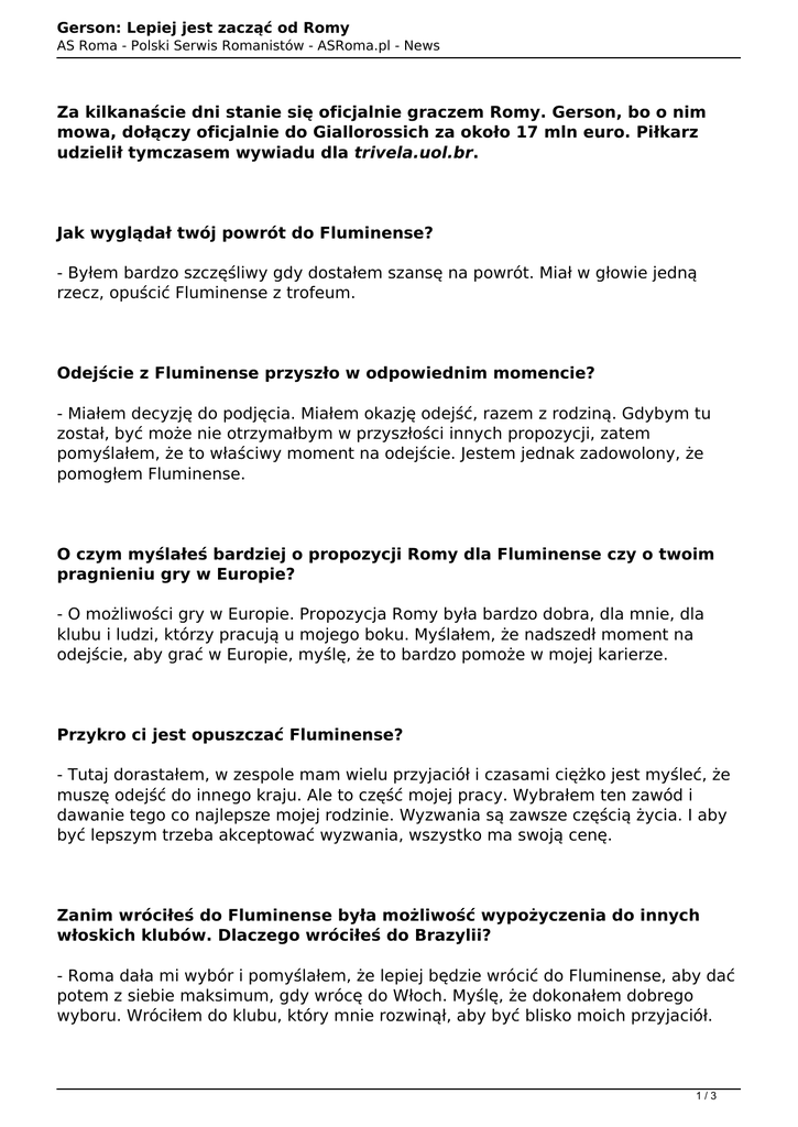 Gerson: Lepiej jest zacząć od Romy AS Roma - Polski Serwis Romanistów - ASRoma.pl - News Za kilkanaście dni stanie się oficjalnie graczem Romy. Gerson, bo o nim mowa, dołączy oficjalnie do Giallorossich za około 17 mln euro. Piłkarz udzielił tymczasem wywiadu dla trivela.uol.br. Jak wyglądał twój powrót do Fluminense? - Byłem bardzo szczęśliwy gdy dostałem szansę na powrót. Miał w głowie jedną rzecz, opuścić Fluminense z trofeum. Odejście z Fluminense przyszło w odpowiednim momencie? - Miałem decyzję do podjęcia. Miałem okazję odejść, razem z rodziną. Gdybym tu został, być może nie otrzymałbym w przyszłości innych propozycji, zatem pomyślałem, że to właściwy moment na odejście. Jestem jednak zadowolony, że pomogłem Fluminense. O czym myślałeś bardziej o propozycji Romy dla Fluminense czy o twoim pragnieniu gry w Europie? - O możliwości gry w Europie. Propozycja Romy była bardzo dobra, dla mnie, dla klubu i ludzi, którzy pracują u mojego boku. Myślałem, że nadszedł moment na odejście, aby grać w Europie, myślę, że to bardzo pomoże w mojej karierze. Przykro ci jest opuszczać Fluminense? - Tutaj dorastałem, w zespole mam wielu przyjaciół i czasami ciężko jest myśleć, że muszę odejść do innego kraju. Ale to część mojej pracy. Wybrałem ten zawód i dawanie tego co najlepsze mojej rodzinie. Wyzwania są zawsze częścią życia. I aby być lepszym trzeba akceptować wyzwania, wszystko ma swoją cenę. Zanim wróciłeś do Fluminense była możliwość wypożyczenia do innych włoskich klubów. Dlaczego wróciłeś do Brazylii? - Roma dała mi wybór i pomyślałem, że lepiej będzie wrócić do Fluminense, aby dać potem z siebie maksimum, gdy wrócę do Włoch. Myślę, że dokonałem dobrego wyboru. Wróciłem do klubu, który mnie rozwinął, aby być blisko moich przyjaciół. 1/3 Gerson: Lepiej jest zacząć od Romy AS Roma - Polski Serwis Romanistów - ASRoma.pl - News Spodziewasz się gry, gdy wrócisz do Romy? - Mam nadzieję udowodnić moją wartość, chcę ciężko pracować na treningach. I gdy będę miał szansę, chcę z niej skorzystać i pokazać to, co potrafię. Znasz już zespół? - Trenowałem z drużyną przez miesiąc, oglądałem też kilka meczów. Znam wszystkich graczy i się zaaklimatyzowałem. Uczysz się włoskiego? - Tak, staram się uczyć popularniejszych zwrotów, również aby wiedzieć co się dzieje i rozumieć co mówi trener. Gdy przybędę do Rzymu nie będzie problemów. Spotkałeś się z Tottim. - Jest świetną osoba, w Rzymie jest jak Bóg. Jest też skromnym i spokojnym gościem, świetną osobą. Totti przedłużył kontrakt o kolejny sezon, co czujesz na myśl gry u jego boku w Lidze Mistrzów? - Gra w Europie i w najważniejszych rozgrywkach na świcie jest marzeniem każdego gracza, jeśli grasz w nich u boku światowego idola, wszystko staje się jeszcze bardziej niesamowite. Gra u jego boku będzie świetnym doświadczeniem. Który z graczy zrobił na tobie największe wrażenia na treningach? - De Rossi i Maicon, którego znałem z widzenia. Miałem okazję z nim trenować i być blisko niego. 2/3 Gerson: Lepiej jest zacząć od Romy AS Roma - Polski Serwis Romanistów - ASRoma.pl - News Jak żyjesz w oczekiwaniu na ewentualne powołanie na Igrzyska Olimpijskie? - Starsi ode mnie trenują ciężko, aby być gotowymi. Ten kto pojedzie zagra u boku Neymara, co motywuje do jeszcze większej pracy. Jeśli nie zostanę powołany, będę pracował jeszcze więcej, aby pewnego dnia udać się na Igrzyska Olimpijskie lub Mundial. Miałeś porozumienie z Barceloną, zanim przeszedłem do Romy. Co się wydarzyło? - Prezydent Fluminense miał porozumienie z Barcelona, która miała prawo do kupna. Potem pomyślał, że dla klubu lepszy będzie transfer do Romy. Również ja i moja rodzina pomyśleliśmy, że lepiej zacząć w Romie, aby potem pójść do innych klubów. Nie żałujesz? Mógłbyś grać z Neymarem, Suarezem i Messim... - Nie, w ogóle nie żałuję. Będę zakładał koszulkę Romy, wielkiego klubu, który gra w jednej z najlepszych lig na świecie. Autor: abruzzi 3/3 Powered by TCPDF (www.tcpdf.org)
