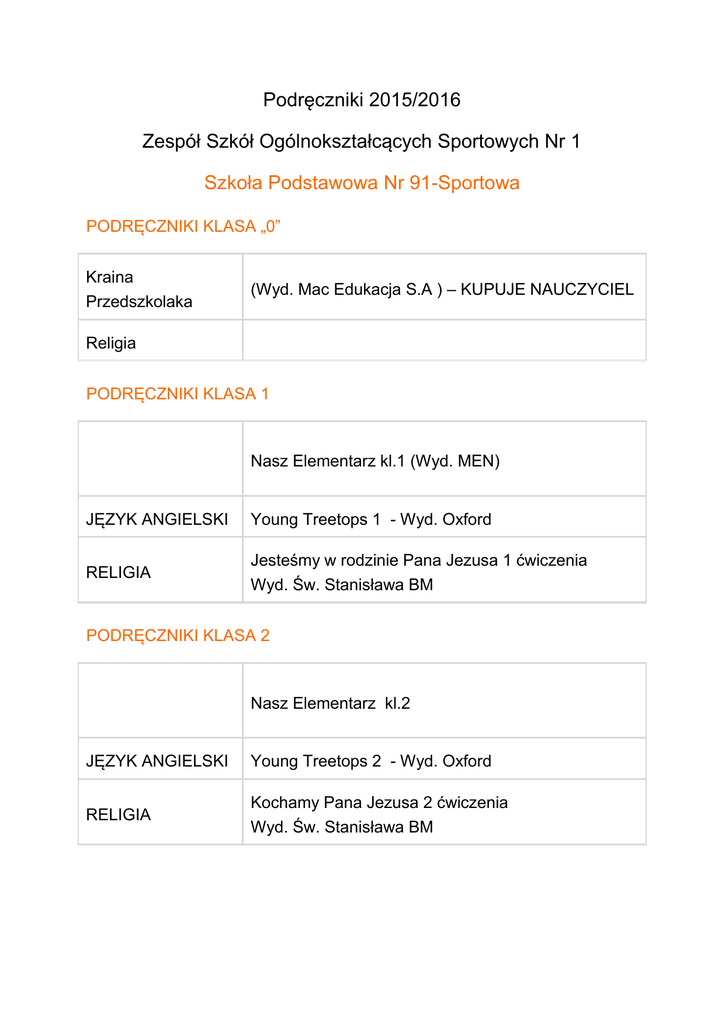 Podręczniki 2015/2016 Zespół Szkół Ogólnokształcących Sportowych Nr 1 Szkoła Podstawowa Nr 91-Sportowa PODRĘCZNIKI KLASA „0” Kraina Przedszkolaka (Wyd. Mac Edukacja S.A ) – KUPUJE NAUCZYCIEL Religia PODRĘCZNIKI KLASA 1 Nasz Elementarz kl.1 (Wyd. MEN) JĘZYK ANGIELSKI Young Treetops 1 - Wyd. Oxford RELIGIA Jesteśmy w rodzinie Pana Jezusa 1 ćwiczenia Wyd. Św. Stanisława BM PODRĘCZNIKI KLASA 2 Nasz Elementarz kl.2 JĘZYK ANGIELSKI Young Treetops 2 - Wyd. Oxford RELIGIA Kochamy Pana Jezusa 2 ćwiczenia Wyd. Św. Stanisława BM PODRĘCZNIKI KLASA 3 Elementarz XXI wieku klasa 3 Box Ewa Hryszkiewicz, Barbara Stępień Wyd. Nowa Era JĘZYK ANGIELSKI English Quest 3 - Wyd. Macmillan RELIGIA Przyjmujemy Pana Jezusa 3. Religia Podręcznik pod red. T. Panuś Przyjmujemy Pana Jezusa 3 Zeszyt ucznia Wyd. Św. Stanisława BM PODRĘCZNIKI KLASA 4 JĘZYK POLSKI E.Horwath, A. Żegleń – Słowa z uśmiechem. Literatura i kultura. cz.1 i 2 E. Horwath, A. Żegleń –Słowa z uśmiechem. Nauka o języku i ortografia cz.1 i 2 (Wyd.WSiP ) MATEMATYKA M. Braun, A. Mańkowska, M. Paszyńska. Matematyka z kluczem – (Wyd. Nowa Era ) PRZYRODA M. Marko-Worłowska,F. Szlajfer, J.Stawarz Tajemnice przyrody. ( Wyd. Nowa Era ) HISTORIA My i historia Historia i społeczeństwo 4 Podręcznik Olszewska Bogumiła, Surdyk-Fertsch Wiesława (Wyd. Nowa Era , PWN) PLASTYKA J. Lukas, K. Onak – Do dzieła. Podręcznik kl. 4-6. (Wyd. Nowa Era ) ZAJĘCIA TECHNICZNE Bez podręcznika ZAJĘCIA KOMPUTEROWE Informatyka Europejczyka Wyd. Helion MUZYKA M. Gromek, G. Kilbach – I gra muzyka. ( Wyd. Nowa Era ) JĘZYK ANGIELSKI T. Thompson, D. Todd –Today - Podręcznik + ćwiczenia ( Wyd. Pearson ) RELIGIA Słuchamy Pana Boga. – (Wyd. Św. Stanisława BM, Kraków ) PODRĘCZNIKI KLASA 5 JĘZYK POLSKI E.Horwath, A. Żegleń – Słowa z uśmiechem. Literatura i kultura. cz.1 i 2 E. Horwath, A. Żegleń –Słowa z uśmiechem. Nauka o języku i ortografia cz.1 i 2 (Wyd.WSiP ) MATEMATYKA M. Braun, A. Mańkowska, M. Paszyńska. Matematyka z kluczem – Podręcznik + ćwiczenia (Wyd. Nowa Era ) PRZYRODA J.Ślosarczyk,R. Kozik, F. Szlajfer - Tajemnice przyrody – Podręcznik + ćwiczenia 1, 2 – nowa podstawa programowa (Wyd. Nowa Era) HISTORIA B. Olszewska,W. Surdyk-Feresch – My i historia. Historia i społeczeństwo . Pod (Wyd.Pwn, Nowa Era) PLASTYKA Kontynuacja podręcznika z klasy 4 J. Lukas, K. Onak – Do dzieła. Podręcznik kl. 4-6. (Wyd. Nowa Era ) ZAJĘCIA TECHNICZNE U. Białka - Technika klasa 4-6. Część 2 – techniczna (Wyd. Operon). ZAJĘCIA KOMPUTEROWE Zajęcia komputerowe - G. Koba - Kontynuacja podręcznika. (Wyd. Migra) JĘZYK ANGIELSKI I. Hearn, J. Wildman – Discover English 2 Podręcznik + ćwiczenia ( Wyd. Pearson ) MUZYKA M. Gromek, G. Kilbach – I gra muzyka. ( Wyd. Nowa Era ) RELIGIA Wierzymy w Pana Boga. – (Wyd. Św. Stanisława BM, Kraków ) PODRĘCZNIKI - KLASA 6 JĘZYK POLSKI Słowa z uśmiechem Horwath Ewa, Żagleń Anita Słowa z uśmiechem 6 Nauka o języku, Ortografia cz. 1 Podręcznik z ćwiczeniami Horwath Ewa, Żagleń Anita Słowa z uśmiechem 6 Nauka o języku, Ortografia cz. 2 Podręcznik z ćwiczeniami Horwath Ewa, Żagleń Anita (Wyd. WSiP) MATEMATYKA Matematyka z kluczem 6 Podręcznik Braun Marcin, Mańkowska Agnieszka, Paszyńska Małgorza Matematyka z kluczem 6 zeszyt ćwiczeń część 1, 2 Braun Marcin, Mańkowska Agnieszka, Paszyńska Małgorzata (Wyd. Nowa Era) PRZYRODA Tajemnice przyrody - Joanna Stawarz, Feliks Szlajfer, Hanna Kowalczyk (Wyd. Nowa Era) HISTORIA Wczoraj i dziś 6 Historia i społeczeństwo Podręcznik Wojciechowski Grzegorz (Wyd. Nowa Era) ZAJĘCIA KOMPUTEROWE Zajęcia komputerowe G.Hermanowska, W. Hermanowski – Podręcznik z serii „Odkrywamy na nowo”(Wyd. Operon ) ZAJĘCIA TECHNICZNE Kontynuacja podręczników z klasy 5 U. Białka Technika klasa 4-6. Część 2 – techniczna (Wyd. Operon). JĘZYK ANGIELSKI Discover English 3 książka ucznia Wildman Jayne Discover English 3 Zeszyt ćwiczeń z płytą CD Hearn Izabella (Wyd. Pearson Education Limit) PLASTYKA Kontynuacja podręcznika z klasy 5 J. Lukas, K. Onak – Do dzieła. Podręcznik kl. 4-6. (Wyd. Nowa Era ) MUZYKA M. Gromek, G. Kilbach – I gra muzyka. ( Wyd. Nowa Era ) RELIGIA W Kościele umacniamy wiarę. Redakcja: ks. Tadeusz Panuś, ks. Andrzej Kielian, Adam Berski (Wyd. Św. Stanisława BM)