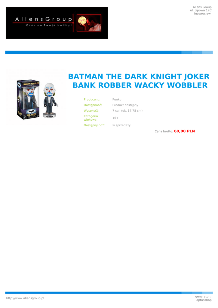 Aliens Group ul. Lipowa 17C Inowrocław BATMAN THE DARK KNIGHT JOKER BANK ROBBER WACKY WOBBLER Producent: Funko Dostępność: Produkt dostępny Wysokość: 7 cali (ok. 17,78 cm) Kategoria wiekowa: 16+ Dostępny od*: w sprzedaży Cena brutto: http://www.aliensgroup.pl 60,00 PLN generator: aptusshop