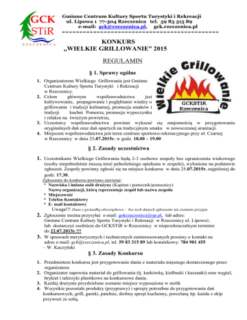 Gminne Centrum Kultury Sportu Turystyki i Rekreacji ul. Lipowa 1 77-304 Rzeczenica tel. 59 83 315 89 e-mail: [email protected], gck.rzeczenica.pl ============================================= KONKURS „WIELKIE GRILLOWANIE” 2015 REGULAMIN § 1. Sprawy ogólne 1. Organizatorem Wielkiego Grillowania jest Gminne Centrum Kultury Sportu Turystyki i Rekreacji w Rzeczenicy. 2. Celem głównym współzawodnictwa jest kultywowanie, propagowanie i pogłębianie wiedzy o grillowaniu i tradycji kulinarnej, promocja smaków i tradycji kuchni Pomorza, promocja wypoczynku i relaksu na świeżym powietrzu, 3. Uczestnicy współzawodnictwa powinni wykazać się znajomością w przygotowaniu oryginalnych dań oraz dań opartych na tradycyjnym smaku w nowoczesnej aranżacji. 4. Miejscem współzawodnictwa jest teren centrum sportowo-rekreacyjnego przy ul. Czarnej w Rzeczenicy w dniu 25.07.2015r. w godz. 18.00 – 19.00 § 2. Zasady uczestnictwa 1. Uczestnikami Wielkiego Grillowania będą 2-3 osobowe zespoły bez ograniczenia wiekowego (osoby niepełnoletnie muszą mieć pełnoletniego opiekuna w zespole), wyłonione na podstawie zgłoszeń. Zespoły powinny zgłosić się na miejsce konkursu w dniu 25.07.2015r. najpóźniej do godz. 17.30. Zgłoszenie do konkursu powinno zawierać: * Nazwiska i imiona osób drużyny (Kapitan i pomocnik/pomocnicy) Nazwę organizacji, którą reprezentuje zespół lub nazwa zespołu * Miejscowość * Telefon Kontaktowy * E- mail kontaktowy Uwaga!!! Dane z gwiazdką obowiązkowe - bez tych danych zgłoszenie nie zostanie przyjęte 2. Zgłoszenie można przysyłać e-mail: [email protected], lub adres: Gminne Centrum Kultury Sportu Turystyki i Rekreacji w Rzeczenicy ul. Lipowa1, lub dostarczyć osobiście do GCKSTiR w Rzeczenicy w nieprzekraczalnym terminie do 22.07.2015r.!!! 3. W sprawach merytorycznych i technicznych zainteresowanych prosimy o kontakt na adres e-mail: [email protected], tel. 59 83 315 89 lub komórkowy: 784 901 455 – W. Kaczyński § 3. Zasady Konkursu 1. Przedmiotem konkursu jest przygotowanie dania z materiału mięsnego dostarczonego przez organizatora 2. Organizator zapewnia materiał do grillowania (tj. karkówkę, kiełbaski i kaszanki) oraz węgiel, brykiet i talerzyki plastikowe na konkursowe dania. 3. Każdej drużynie przydzielone zostanie miejsce wyposażone w stolik 4. Wszystkie pozostałe produkty (przyprawy) i sprzęty potrzebne do przygotowania dań konkursowych, grill, garnki, patelnie, drobny sprzęt kuchenny, porcelanę itp. każda z ekip przywozi ze sobą. Ekipy startują w dowolnym ubraniu kucharskim ( bluza, zapaska, czapka dowolna). Ekipy będą wpuszczane na stanowiska według wylosowanej kolejności.; Na przygotowanie potraw uczestnicy mają 60 minut. Każda ze startujących ekip przygotowuje po 3 porcje dań konkursowych ( 2 podzielone na 5 części dla tzw. jury degustacyjnego, 1 danie do ekspozycji). 9. Bezwzględnie zabrania się podawania do oceny Jury potraw nie wykonanych na miejscu i podczas wyznaczonego czasu Wielkiego Grillowania!!! Nie zastosowanie się do tego przepisu będzie oznaczało dyskwalifikację zespołu. 5. 6. 7. 8. § 4. Postanowienia końcowe 1. Nad prawidłowością punktacji czuwać będzie JURY DEGUSTACYJNE KONKURSU (3-5 osób) powołane przez organizatora konkursu. 2. Każdy zespół otrzyma swój numer identyfikacyjny , którym będzie oznaczał przygotowane przez siebie potrawy. Jury degustacyjne nie będzie znało autora potrawy a jedynie numer jej wykonawcy. 3. Jury przyzna: I, II, i III miejsce na podstawie łącznej ilości punktów. 4. Za zajęcie I, II i III miejsca drużyna otrzyma nagrodę rzeczową 5. Nagrodą specjalną za I miejsce w Wielkim Grillowaniu jest pamiątkowy certyfikat: Mistrz Wielkiego Grillowania Rzeczenica 2015. 6. Każda ekipa uczestnicząca w Wielkim Grillowaniu otrzyma drobne upominki rzeczowe 7. Organizator konkursu zastrzega sobie prawo do publikacji danych osobowych uczestników konkursu, nazw, przepisów oraz wykorzystywanie zdjęć wykonanych podczas konkursu w tym zdjęć osób i potraw. 8. Wyniki konkursu zostaną ogłoszone podczas trwania imprezy „Dni Rzeczenicy” 9. Osoby nietrzeźwe i nieletnie bez opiekuna prawnego nie zostaną dopuszczone do konkursu. 10. Przygotowane podczas konkursu potrawy należą do organizatora. 11. Tryb postępowania w sprawach nieuregulowanych niniejszym regulaminem ustala Organizator. 12. Organizator zastrzega sobie prawo do dokonywania wszelkich zmian w niniejszym Regulaminie.