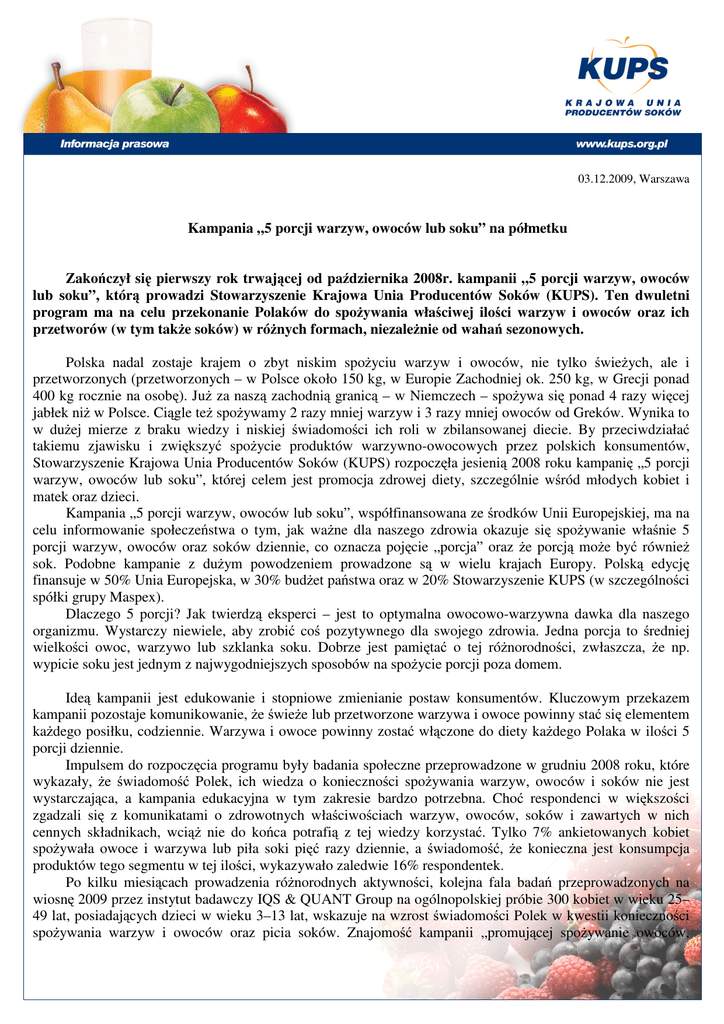 03.12.2009, Warszawa Kampania „5 porcji warzyw, owoców lub soku” na półmetku Zakończył się pierwszy rok trwającej od października 2008r. kampanii „5 porcji warzyw, owoców lub soku”, którą prowadzi Stowarzyszenie Krajowa Unia Producentów Soków (KUPS). Ten dwuletni program ma na celu przekonanie Polaków do spożywania właściwej ilości warzyw i owoców oraz ich przetworów (w tym także soków) w różnych formach, niezależnie od wahań sezonowych. Polska nadal zostaje krajem o zbyt niskim spożyciu warzyw i owoców, nie tylko świeżych, ale i przetworzonych (przetworzonych – w Polsce około 150 kg, w Europie Zachodniej ok. 250 kg, w Grecji ponad 400 kg rocznie na osobę). Już za naszą zachodnią granicą – w Niemczech – spożywa się ponad 4 razy więcej jabłek niż w Polsce. Ciągle też spożywamy 2 razy mniej warzyw i 3 razy mniej owoców od Greków. Wynika to w dużej mierze z braku wiedzy i niskiej świadomości ich roli w zbilansowanej diecie. By przeciwdziałać takiemu zjawisku i zwiększyć spożycie produktów warzywno-owocowych przez polskich konsumentów, Stowarzyszenie Krajowa Unia Producentów Soków (KUPS) rozpoczęła jesienią 2008 roku kampanię „5 porcji warzyw, owoców lub soku”, której celem jest promocja zdrowej diety, szczególnie wśród młodych kobiet i matek oraz dzieci. Kampania „5 porcji warzyw, owoców lub soku”, współfinansowana ze środków Unii Europejskiej, ma na celu informowanie społeczeństwa o tym, jak ważne dla naszego zdrowia okazuje się spożywanie właśnie 5 porcji warzyw, owoców oraz soków dziennie, co oznacza pojęcie „porcja” oraz że porcją może być również sok. Podobne kampanie z dużym powodzeniem prowadzone są w wielu krajach Europy. Polską edycję finansuje w 50% Unia Europejska, w 30% budżet państwa oraz w 20% Stowarzyszenie KUPS (w szczególności spółki grupy Maspex). Dlaczego 5 porcji? Jak twierdzą eksperci – jest to optymalna owocowo-warzywna dawka dla naszego organizmu. Wystarczy niewiele, aby zrobić coś pozytywnego dla swojego zdrowia. Jedna porcja to średniej wielkości owoc, warzywo lub szklanka soku. Dobrze jest pamiętać o tej różnorodności, zwłaszcza, że np. wypicie soku jest jednym z najwygodniejszych sposobów na spożycie porcji poza domem. Ideą kampanii jest edukowanie i stopniowe zmienianie postaw konsumentów. Kluczowym przekazem kampanii pozostaje komunikowanie, że świeże lub przetworzone warzywa i owoce powinny stać się elementem każdego posiłku, codziennie. Warzywa i owoce powinny zostać włączone do diety każdego Polaka w ilości 5 porcji dziennie. Impulsem do rozpoczęcia programu były badania społeczne przeprowadzone w grudniu 2008 roku, które wykazały, że świadomość Polek, ich wiedza o konieczności spożywania warzyw, owoców i soków nie jest wystarczająca, a kampania edukacyjna w tym zakresie bardzo potrzebna. Choć respondenci w większości zgadzali się z komunikatami o zdrowotnych właściwościach warzyw, owoców, soków i zawartych w nich cennych składnikach, wciąż nie do końca potrafią z tej wiedzy korzystać. Tylko 7% ankietowanych kobiet spożywała owoce i warzywa lub piła soki pięć razy dziennie, a świadomość, że konieczna jest konsumpcja produktów tego segmentu w tej ilości, wykazywało zaledwie 16% respondentek. Po kilku miesiącach prowadzenia różnorodnych aktywności, kolejna fala badań przeprowadzonych na wiosnę 2009 przez instytut badawczy IQS & QUANT Group na ogólnopolskiej próbie 300 kobiet w wieku 25– 49 lat, posiadających dzieci w wieku 3–13 lat, wskazuje na wzrost świadomości Polek w kwestii konieczności spożywania warzyw i owoców oraz picia soków. Znajomość kampanii „promującej spożywanie owoców, warzyw lub soku” deklaruje 41% badanych kobiet, podczas gdy w badaniu przeprowadzonym w grudniu 2008 było to zaledwie 27%. Do sukcesów kampanii zaliczyć można także wyraźny wzrost deklaracji spożywania soków przez dzieci w porównaniu z pomiarem z grudnia 2008: z 19% do 30%. Co istotne, występuje również większa świadomość, że możliwie jest zastępowanie surowych warzyw i owoców, gdy nie ma ich pod ręką. Bez wątpienia coraz częściej zdajemy sobie sprawę z wygody takiej formy serwowania zdrowej żywności, jaką dają nam właśnie soki. Doskonale pokazuje to przykład matek dających je dzieciom do szkoły jako formę owocu – ich liczba wzrosła (z 7% do 15%). Kampania „5 porcji warzyw, owoców lub soku” jest już na półmetku, gdyż jej realizację przewidziano do jesieni 2010 roku. Przez miniony rok, Stowarzyszenia KUPS zorganizowało w jej ramach wiele różnorodnych działań, starając się dotrzeć do Polek i ich dzieci ze swym prozdrowotnym przekazem. Bezpośrednio do konsumentek zwracano się poprzez reklamę telewizyjną, prasową oraz internetową. Reklamy te, stworzone z myślą o tym, by zainteresować swą formą zarówno dorosłych, jak i dzieci, emitowane były w dwóch falach – na wiosnę i jesienią. Reklamy przedstawiły konsumentom bohaterów naszej kampanii – Załogę 5. Jest to grupa złożona owoców, warzyw i soku, która dzielnie pomaga mamom i dzieciom poprawić nawyki żywieniowe. Załoga 5 oraz logo kampanii stały się rozpoznawalnymi symbolami kampanii, jak również samego jej prozdrowotnego przekazu. Specjalnie dla matek z dziećmi, KUPS wraz z programem „5 porcji warzyw, owoców lub soku”, włączył się w organizację dnia dziecka w parku im. gen. Sowińskiego w Warszawie. Rodzice dostawali tam ulotki informacyjne, dzieci balony i kolorowanki. Zorganizowane były warzywno-owocowe konkursy z nagrodami, pokazy tańca i zabawy dla najmłodszych prowadzone przez najprawdziwszą Załogę 5. Wraz z początkiem roku szkolnego, Stowarzyszenie KUPS zainicjowało konkurs dla uczniów szkół podstawowych pod nazwą „Konkurs, który owocuje nagrodami”. Uczniowie mają w ramach konkursu tworzyć p