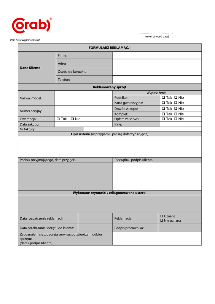 ………………………….….. (miejscowość, data) Pola białe wypełnia Klient. FORMULARZ REKLAMACJI Firma: Dane Klienta Adres: Osoba do kontaktu: Telefon: Reklamowany sprzęt Pudełko: Karta gwarancyjna: Nazwa, model: Numer seryjny: Gwarancja: Data zakupu: Nr faktury Tak Nie Wyposażenie: Tak Nie Tak Nie Dowód zakupu: Tak Nie Komplet: Opłata za serwis: Inne: Tak Nie Tak Nie Opis usterki (w przypadku proszę dołączyć zdjęcia) Podpis przyjmującego, data przyjęcia Pieczątka i podpis Klienta Wykonane czynności / zdiagnozowane usterki Data rozpatrzenia reklamacji: Reklamacja: Data przekazania sprzętu do klienta: Podpis pracownika: Zapoznałem się z decyzją serwisu, potwierdzam odbiór sprzętu: (data i podpis Klienta) Uznana Nie uznana