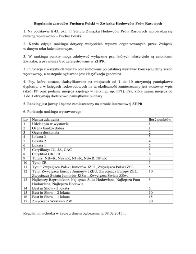 Regulamin zawodów Pucharu Polski w Związku Hodowców Psów Rasowych 1. Na podstawie § 43, pkt. 11 Statutu Związku Hodowców Psów Rasowych wprowadza się ranking wystawowy – Puchar Polski. 2. Każda edycja rankingu dotyczy wszystkich wystaw organizowanych przez Związek w danym roku kalendarzowym. 3. W rankingu punkty mogą zdobywać wyłącznie psy, których właściciele są członkami Związku, a psy muszą być zarejestrowane w ZHPR. 3. Punktacja z wszystkich wystaw jest sumowana po ostatniej wystawie kończącej dany sezon wystawowy, a następnie ogłaszana jest klasyfikacja generalna. 4. Psy, które zostaną skalsyfikowane na miejscach od 1 do 10 otrzymują pamiątkowe dyplomy, a w księgach rodowodowych na tą okoliczność zamieszczany jest stosowny wpis (skrót PP oraz podanie miejsca zajętego w rankingu np. PP1). Psy, które zajmą miejsca od 1 do 3 otrzymają dodatkowo pamiątkowe puchary. 5. Ranking jest jawny i będzie zamieszczony na stronie internetowej ZHPR. 6. Punktacja rankingu wystawowego Lp 1 2 3 4 5 6 7 8 9 10 11 12 13 14 15 16 17 Nazwa zdarzenia Udział psa w wystawie Ocena bardzo dobra Ocena doskonała Lokata 3 Lokata 2 Lokata 1 Ceryfikaty: JU, JA, CAC Ceryfikat UKCIB Tutuły: NBwR, NSzwR, NJwR, NSwR, NPwR Tytuł ZR Tytuł: Zwycięzca Polski Juniorów JZPL, Zwycięzca Polski ZPL Tytuł Zwycięzca Europy Juniorów JZEU, Zwycięzca Europy ZEU, Zwycięzca Świata Juniorów JZŚw., Zwycięzca Świata ZŚw. Najlepszy Reproduktor, Najlepsza Suka Hodowlana, Najlepsza Para Hodowlana, Najlepsza Hodowla Best in Show - 3 lokata Best in Show – 2 lokata Best in Show – 1 lokata Zwycięzca Wystawy ZW Regulamin wchodzi w życie z dniem ogłoszenia tj. 08.02.2015 r. Ilość punktów 1 1 2 3 4 5 5 8 3 3 5 10 5 5 10 15 20