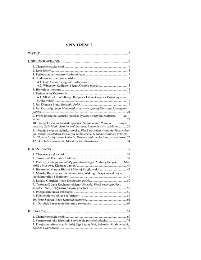 SPIS TREŚCI WSTĘP................................................................................................. 5 I. ŚREDNIOWIECZE .......................................................................... 6 1. Charakterystyka epoki ........................................................................... 6 2. Rola łaciny ............................................................................................. 8 3. Periodyzacja literatury średniowiecza ................................................... 9 4. Średniowieczna proza polska................................................................ 9 4.1. Gall Anonim i jego Kronika polska ............................................ 10 4.2. Wincenty Kadłubek i jego Kronika polska ................................. 13 5. Historia a literatura .............................................................................. 15 6. Uniwersytet Krakowski ....................................................................... 16 6.1. Młodzież z Wielkiego Księstwa Litewskiego na Uniwersytecie Krakowskim ....................................................................................... 16 7. Jan Długosz i jego Roczniki Polski ...................................................... 19 8. Jan Ostroróg i jego Memoriał w sprawie uporządkowania Rzeczypospolitej ....................................................................................................... 21 9. Proza kościelna łacińsko-polska: żywoty świętych, psałterze, kazania......................................................................................................... 22 10. Poezja kościelna łacińsko-polska: Gaude mater Polonia, Bogurodzica, Żale Matki Boskiej pod krzyżem, Legenda o św. Aleksym.......... 24 11. Poezja świecka łacińsko-polska: Pieśń o zabiciu Andrzeja Tęczyńskiego, Rozmowa Mistrza Polikarpa ze Śmiercią, O zachowaniu się przy stole, Chytrze bydlą z pany kmiecie, Dusza z ciała wyleciała, listy miłosne 27 12. Dorobek i znaczenie literatury średniowiecza .................................. 31 II. RENESANS .................................................................................. 37 1. Charakterystyka epoki ......................................................................... 37 2. Twórczość Biernata z Lublina ............................................................. 39 3. Pisarze „Złotego wieku“ Zygmuntowskiego: Andrzej Krzycki, Mikołaj z Husowa, Klemens Janicki ............................................................ 40 4. Historycy: Marcin Bielski i Maciej Stryjkowski ................................. 45 5. Mikołaj Rej – ojciec piśmiennictwa polskiego. Język narodowy – językiem religii i literatury ...................................................................... 49 6. Łukasz Górnicki i jego Dworzanin polski............................................ 52 7. Twórczość Jana Kochanowskiego: Fraszki, Pieśń świętojańska o sobótce, Treny, Odprawa posłów greckich.............................................. 53 8. Poezja schyłkowa renesansu ................................................................ 57 9. Piśmiennictwo okresu reformacji ...................................................... 59 10. Piotr Skarga i jego Kazania sejmowe................................................. 61 11. Dorobek i znaczenie literatury renesansu .......................................... 64 III. BAROK........................................................................................ 67 1. Charakterystyka epoki ......................................................................... 67 2. Sarmatyzm jako ideologia i styl życia polskiej szlachty...................... 71 3. Poezja metafizyczna: Mikołaj Sęp Szarzyński, Sebastian Grabowiecki, Kasper Twardowski ................................................................................. 72 4. Poezja ,,światowych rozkoszy“: Hieronim Morsztyn, Szymon Zimorowic ................................................................................. 77 5. Nurt dworski w poezji baroku: marynizm Jana Andrzeja Morsztyna, Daniel Naborowski .................................................................................. 80 6. Pamiętnikarstwo .................................................................................. 87 7. Pamiętniki Jana Chryzostoma Paska jako dokument świadomości XVII-wiecznego szlachcica ..................................................................... 88 8. Realia podróżnicze w pamiętnikach Jana Chryzostoma Paska i Jakuba Łosia ............................................................................................ 90 9. Maciej Kazimierz Sarbiewski – poeta łacińskojęzyczny i teoretyk poetyki ..................................................................................................... 91 10. Wacław Potocki i jego Wojna chocimska .......................................... 95 11. Dorobek i znaczenie literatury baroku ............................................... 98
