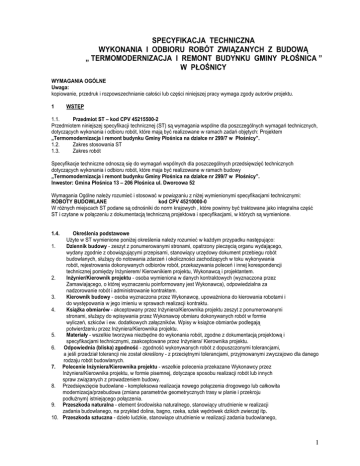 SPECYFIKACJA TECHNICZNA WYKONANIA I ODBIORU ROBÓT ZWIĄZANYCH Z BUDOWĄ „ TERMOMODERNIZACJA I REMONT BUDYNKU GMINY PŁOŚNICA ” W PŁOŚNICY WYMAGANIA OGÓLNE Uwaga: kopiowanie, przedruk i rozpowszechnianie całości lub części niniejszej pracy wymaga zgody autorów projektu. 1 WSTĘP 1.1. Przedmiot ST – kod CPV 45215500-2 Przedmiotem niniejszej specyfikacji technicznej (ST) są wymagania wspólne dla poszczególnych wymagań technicznych, dotyczących wykonania i odbioru robót, które mają być realizowane w ramach zadań objętych: Projektem „Termomodernizacja i remont budynku Gminy Płośnica na działce nr 299/7 w Płośnicy”. 1.2. Zakres stosowania ST 1.3. Zakres robót Specyfikacje techniczne odnoszą się do wymagań wspólnych dla poszczególnych przedsięwzięć technicznych dotyczących wykonania i odbioru robót, które maja być realizowane w ramach budowy „Termomodernizacja i remont budynku Gminy Płośnica na działce nr 299/7 w Płośnicy”. Inwestor: Gmina Płośnica 13 – 206 Płośnica ul. Dworcowa 52 Wymagania Ogólne naleŜy rozumieć i stosować w powiązaniu z niŜej wymienionymi specyfikacjami technicznymi: ROBOTY BUDOWLANE kod CPV 45210000-0 W róŜnych miejscach ST podane są odnośniki do norm krajowych , które powinny być traktowane jako integralna część ST i czytane w połączeniu z dokumentacją techniczną projektowa i specyfikacjami, w których są wymienione. 1.4. Określenia podstawowe UŜyte w ST wymienione poniŜej określenia naleŜy rozumieć w kaŜdym przypadku następująco: 1. Dziennik budowy - zeszyt z ponumerowanymi stronami, opatrzony pieczęcią organu wydającego, wydany zgodnie z obowiązującymi przepisami, stanowiący urzędowy dokument przebiegu robót budowlanych, słuŜący do notowania zdarzeń i okoliczności zachodzących w toku wykonywania robót, rejestrowania dokonywanych odbiorów robót, przekazywania poleceń i innej korespondencji technicznej pomiędzy InŜynierem/ Kierownikiem projektu, Wykonawcą i projektantem. 2. InŜynier/Kierownik projektu - osoba wymieniona w danych kontraktowych (wyznaczona przez Zamawiającego, o której wyznaczeniu poinformowany jest Wykonawca), odpowiedzialna za nadzorowanie robót i administrowanie kontraktem. 3. Kierownik budowy - osoba wyznaczona przez Wykonawcę, upowaŜniona do kierowania robotami i do występowania w jego imieniu w sprawach realizacji kontraktu. 4. KsiąŜka obmiarów - akceptowany przez InŜyniera/Kierownika projektu zeszyt z ponumerowanymi stronami, słuŜący do wpisywania przez Wykonawcę obmiaru dokonywanych robót w formie wyliczeń, szkiców i ew. dodatkowych załączników. Wpisy w ksiąŜce obmiarów podlegają potwierdzeniu przez InŜyniera/Kierownika projektu. 5. Materiały - wszelkie tworzywa niezbędne do wykonania robót, zgodne z dokumentacją projektową i specyfikacjami technicznymi, zaakceptowane przez InŜyniera/ Kierownika projektu. 6. Odpowiednia (bliska) zgodność - zgodność wykonywanych robót z dopuszczonymi tolerancjami, a jeśli przedział tolerancji nie został określony - z przeciętnymi tolerancjami, przyjmowanymi zwyczajowo dla danego rodzaju robót budowlanych. 7. Polecenie InŜyniera/Kierownika projektu - wszelkie polecenia przekazane Wykonawcy przez InŜyniera/Kierownika projektu, w formie pisemnej, dotyczące sposobu realizacji robót lub innych spraw związanych z prowadzeniem budowy. 8. Przedsięwzięcie budowlane - kompleksowa realizacja nowego połączenia drogowego lub całkowita modernizacja/przebudowa (zmiana parametrów geometrycznych trasy w planie i przekroju podłuŜnym) istniejącego połączenia. 9. Przeszkoda naturalna - element środowiska naturalnego, stanowiący utrudnienie w realizacji zadania budowlanego, na przykład dolina, bagno, rzeka, szlak wędrówek dzikich zwierząt itp. 10. Przeszkoda sztuczna - dzieło ludzkie, stanowiące utrudnienie w realizacji zadania budowlanego, 1 na przykład droga, kolej, rurociąg, kanał, ciąg pieszy lub rowerowy itp. 11. Przetargowa dokumentacja projektowa - część dokumentacji projektowej, która wskazuje lokalizację, charakterystykę i wymiary obiektu będącego przedmiotem robót. 12. Kosztorys nakładczy - wykaz robót z podaniem ich ilości (przedmiarem) w kolejności technologicznej ich wykonania. 13. Teren budowy - teren udostępniony przez Zamawiającego dla wykonania na nim robót oraz inne miejsca wymienione w kontrakcie jako tworzące część terenu budowy. 14. Zadanie budowlane - część przedsięwzięcia budowlanego, stanowiąca odrębną całość konstrukcyjną lub technologiczną, zdolną do samodzielnego pełnienia funkcji technicznouŜytkowych. Zadanie moŜe polegać na wykonywaniu robót związanych z budową, modernizacją/ przebudową, utrzymaniem oraz ochroną budowli drogowej lub jej elementu. 15. Gdziekolwiek w opracowaniu pojawia się skrót ST oznacza to specyfikację techniczną wykonania i odbioru robót, jako element inwestorskiej dokumentacji projektowej, określoną Rozporządzeniem Ministra Spraw Wewnętrznych i Administracji z dn. 26 lutego 1999r w sprawie metod i podstaw sporządzania kosztorysu inwestorskiego (Dz.U. nr 26 poz. 235 z późniejszymi zmianami. 16. Gdziekolwiek w opracowaniu pojawia się określenie prawo budowlane oznacza to Ustawę z dnia 07 lipca 1994r ze zmianami z dn. 27 marca 2003r (Dz.U. nr 80 poz. 718 z dn. 10 maja 2003r). 17. Gdziekolwiek w opracowaniu pojawia się określenie warunki techniczne oznacza to rozporządzenie Ministra Infrastruktury z dn. 12 kwietnia 2002r w sprawie warunków technicznych, jakim powinny odpowiadać budynki i ich usytuowanie. (Dz.U. nr 75 poz. 690 s dn. 15 czerwca 2002r z późniejszymi zmianami). 18. Gdziekolwiek w opracowaniu pojawia się określenie WTWiOR oznacza to Warunki techniczne wykonania i odbioru robót budowlano-montaŜowych, wyd. ARKADY, W-wa 1990 Gdziekolwiek w tekście niniejszego opracowania pojawia się określenie norma oznacza to stosownie określenie