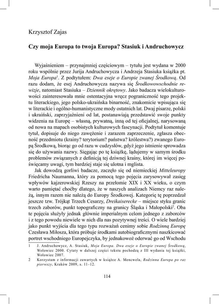 Krzysztof Zajas Czy moja Europa to twoja Europa? Stasiuk i Andruchowycz Wyjaśnieniem – przynajmniej częściowym – tytułu jest wydana w 2000 roku wspólnie przez Jurija Andruchowycza i Andrzeja Stasiuka książka pt. Moja Europa. Z podtytułem: Dwa eseje o Europie zwanej Środkową. Od razu dodam, że esej Andruchowycza nazywa się Środkowowschodnie rewizje, natomiast Stasiuka – Dziennik okrętowy. Jako badacza wielokulturowości zainteresowała mnie ostentacyjna wręcz pograniczność tego projektu literackiego, jego polsko-ukraińska binarność, znakomicie wpisująca się w literackie i ogólno-humanistyczne mody ostatnich lat. Dwaj pisarze, polski i ukraiński, zaprzyjaźnieni od lat, postanawiają przedstawić swoje punkty widzenia na Europę – własną, prywatną, inną od tej oficjalnej, narysowaną od nowa na mapach osobistych kulturowych fascynacji. Podtytuł komentuje tytuł, dopisuje do niego zawężenie i zarazem zaprzeczenie, zgłasza obecność przedmiotu (krainy? terytorium? państwa? królestwa?) zwanego Europą Środkową, biorąc go od razu w cudzysłów, gdyż jego istnienie sprowadza się do używania nazwy. Sięgając po tę książkę, lądujemy w samym środku problemów związanych z definicją tej dziwnej krainy, której im więcej poświęcamy uwagi, tym bardziej staje się ulotna i mglista. Jak dowodzą gorliwi badacze, zaczęło się od niemieckiej Mitteleuropy Friedricha Naumanna, który za pomocą tego pojęcia zarysowywał zasięg wpływów kajzerowskiej Rzeszy na przełomie XIX i XX wieku, o czym warto pamiętać choćby dlatego, że w naszych analizach Niemcy raz należą, innym razem nie należą do Europy Środkowej. Kategorię tę poprzedzał jeszcze tzw. Trójkąt Trzech Cesarzy, Dreikaiserecke – miejsce styku granic trzech zaborów, punkt topograficzny na granicy Śląska i Małopolski. Oba te pojęcia służyły jednak głównie imperialnym celom jednego z zaborców i z tego powodu niewiele w nich dla nas pozytywnej treści. O wiele bardziej jako punkt wyjścia dla tego typu rozważań cenimy sobie Rodzinną Europę Czesława Miłosza, która próbuje środkami autobiograficznymi naszkicować portret wschodniego Europejczyka, by jednakowoż oderwać go od Wschodu J. Andruchowycz, A. Stasiuk, Moja Europa. Dwa eseje o Europie zwanej Środkową, Wołowiec 2000. Cytaty w dalszej części tekstu pochodzą z III wydania tej książki, Wołowiec 2007. Korzystam z informacji zawartych w książce A. Mencwela, Rodzinna Europa po raz pierwszy, Kraków 2009, s. 11–12. 114 i wpisać w krąg kultury zachodniej. Jak autor przyznaje we wstępie, „pierwszym ziarnem była chęć, żeby przybliżyć Europę Europejczykom”, czyli przypomnieć Zachodowi, że tam, na litewskich kresach dawnej Rzeczpospolitej, skąd autor pochodzi, też jest, a przynajmniej była Europa. Natychmiast jednak zaznacza inność tamtej europejskości, chwiejne istnienie, efemeryczność i wykraczanie poza zachodnie kryteria: Postanowiłem więc napisać książkę o Europejczyku wschodnim, urodzonym mniej więcej wtedy, kiedy tłumy Paryża i Londynu wiwatowały na cześć pierwszych lotników; o człowieku, który mniej niż ktokolwiek mieści się w stereotypowych pojęciach niemieckiego porządku i rosyjskiej âme slave. Takie przedsięwzięcie jest niewdzięczne, bo skłonność do ogólnych, choć nie sprawdzonych idei jest w nas mocno ugruntowana. Nie tylko czytelnik, ale i sam autor, starając się zobiektywizować cechy krajów i narodów, waha się pomiędzy uproszczeniem i wielostronnością prawdy. W tym krótkim fragmencie mamy kilka ciekawych punktów. Po pierwsze, Europejczyk jest wschodni, ale ulokowany pomiędzy tym, co niemieckie, a tym, co rosyjskie. Po drugie, zarówno od niemieckości, jak i od rosyjskości jest on zasadniczo różny. Po trzecie, znajduje się on w dosyć nieokreślonej przestrzeni, a samo uchwycenie przedmiotu opisu stanowi zadanie „niewdzięczne”, ponieważ prawda jest „wielostronna”, a skłonność do uproszczeń przeszkadza w precyzyjnym nazwaniu. Miłosz określił całą Europę „rodzinną”, zdaje sobie jednak sprawę z jej faktycznej rozdzielności. Pisze na Zachodzie, we Francji i Szwajcarii, gdzie czuje się zarazem tubylcem i cudzoziemcem, wyłaniającym się z „mglistych obszarów”. Zmaga się z widmem, bytem na poły fikcyjnym, którego każdy kształt jest chwilowy i słabo widoczny. Europa nie tyle jest rodzinna, ile powinna być, co – logicznie rzecz biorąc – musiałoby się wiązać z faktyczną likwidacją Europy Środkowej jako krainy odrębnej. A przecież książka Miłosza właśnie usiłuje ją powołać bądź przywrócić do istnienia. O perypetiach z ustaleniem bezdyskusyjnych granic środkowoeuropejskiej krainy niech zaświadczy jeden przykład z Miłosza, z rozdziału mówiącego o podróży na Zachód w 1931 roku. Otóż pierwszymi zachodnio Cz. Miłosz, Rodzinna Europa, Warszawa 1990, s. 6. Tamże, s. 7. Rodzinna Europa jest także poszukiwaniem własnej tożsamości, na co wskazuje dobitnie angielski tytuł dzieła: Native realm: a search for self-definition. Autodefinicja w założeniu ma być skutkiem dookreślenia terytorium. Najważniejsze jest jednak to, że Europejczyk Środkowy nie ma tożsamości, a tylko podejmuje próby jej poszukiwań. 115