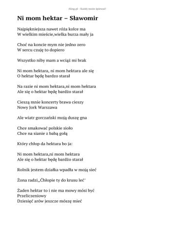 iSing.pl - Każdy może śpiewać! Ni mom hektar – Sławomir Najpiękniejsza nawet róża kolce ma W wielkim mieście,wielka burza mały ja Choć na koncie mym nie jedno zero W sercu czuję to dopiero Wszystko niby mam a wciąż mi brak Ni mom hektara, ni mom hektara ale się O hektar będę bardzo starał Na razie ni mom hektara,ni mom hektara Ale się o hektar będę bardżo starał Cieszą mnie koncerty brawa cieszy Nowy Jork Warszawa Ale wiatr gorczański moją duszę gna Chce smakować polskie sioło Chce na sianie z babą gołą Który chłop da hektara bo ja: Ni mom hektara,ni mom hektara Ale się o hektar będę bardżo starał Rolnik jestem działka wpadła w moją sieć Żona radzi,,Ćhłopie ty do krusu leć" Żaden hektar to i nie ma mowy mósi być Przeliczeniowy Dziesięć arów jeszcze mószę mieć Ni mom hektara,ni mom hektara Ale się o hektar będę bardżo starał Ni mom hektara,ni mom hektara Ale się o hektar będę bardżo starał Z przeliczeniem hektar przepad no cześć I do kogo tera zażalenie wnieść Biegnę rano do kościoła i do Boga głośno Wołam A modlitwy mej wypływa taka treść: Cześ tu Sławomir Panie Boże dziękuję ci za siły za to Że jestem urodziwy za golfa trójkę A Adam miał cały Eden do dyspozycji A ja!? Ni mom hektara ni mom hektara ale się O hektar będę bardżo starał Ni mom hektara ale się o hetar będę Bardżo starał Ni mom hektara ni mom hektara ale się O hektar będę bardżo starał Ni mom hektara ni mom hektara ale się O hektar będę bardżo starał Słowa: brak danych Muzyka: brak danych Rok wydania: brak danych Płyta: brak danych