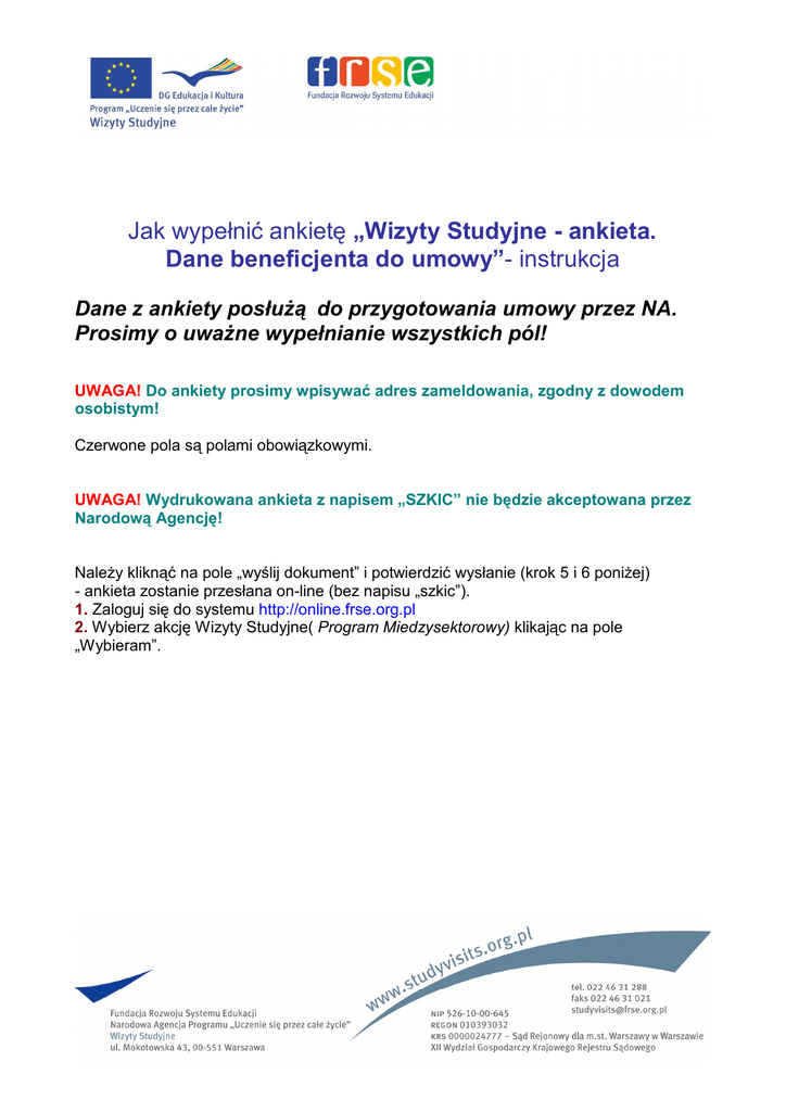 Jak wypełnić ankietę „Wizyty Studyjne - ankieta. Dane beneficjenta do umowy”- instrukcja Dane z ankiety posłuŜą do przygotowania umowy przez NA. Prosimy o uwaŜne wypełnianie wszystkich pól! UWAGA! Do ankiety prosimy wpisywać adres zameldowania, zgodny z dowodem osobistym! Czerwone pola są polami obowiązkowymi. UWAGA! Wydrukowana ankieta z napisem „SZKIC” nie będzie akceptowana przez Narodową Agencję! NaleŜy kliknąć na pole „wyślij dokument” i potwierdzić wysłanie (krok 5 i 6 poniŜej) - ankieta zostanie przesłana on-line (bez napisu „szkic”). 1. Zaloguj się do systemu http://online.frse.org.pl 2. Wybierz akcję Wizyty Studyjne( Program Miedzysektorowy) klikając na pole „Wybieram”. 3. Przejdź do zakładki „Wnioski”. 4. Wybierz i wypełnij ankietę „Wizyty Studyjne-ankieta. Dane beneficjenta do umowy” klikając na pole „Wypełnij”. Ankieta składa się z dwóch zakładek: Dane Adresowe Beneficjenta oraz Dane Bankowe Beneficjenta Nr projektu- prosimy wpisać numer indywidualny wniosku (podany w piśmie informującym przesłanym przez NA) Hasło weryfikacyjne - 9 znaków (liter i/lub cyfr). Hasło zostanie wysłane przez NA wraz z pismem informującym o uzyskaniu dofinansowania bądź w przypadku wcześniejszych wyjazdów na kurs drogą elektroniczną na podany w formularzu wniosku adres e-mail. Imię i nazwisko Ulica i nr domu, Kod pocztowy, Miejscowość - prosimy wpisać dane zgodne z dowodem osobistym NIP- prosimy podać Numer Identyfikacji Podatkowej (bez kresek) PESEL- prosimy podać nr PESEL Waluta rachunku- prosimy zaznaczyć czy rachunek, na który zostanie przekazane dofinansowanie jest kontem złotówkowym czy walutowym (EUR). JeŜeli została wybrana opcja „EUR”, naleŜy wypełnić pole „SWIFT”. Kod SWIFT jest to 8 literowy kod, który ułatwia realizację przelewów międzynarodowych. Posiadacz rachunku- prosimy podać imię i nazwisko właściciela konta. JeŜeli Beneficjent jest współwłaścicielem konta, naleŜy podać wszystkich współwłaścicieli, w kolejności w jakiej pojawiają się oni w oficjalnej nazwie rachunku. Nazwa banku- prosimy podać pełną nazwę banku. Numer rachunku- (XX XXXX XXXX XXXX XXXX XXXX XXXX)- prosimy wpisać pełny numer rachunku, na który zostanie przekazane dofinansowanie (w podanym formacie). 5. Po wypełnieniu wszystkich obowiązkowych rubryk, naleŜy kliknąć pole „Wyślij dokument”. 6. Potwierdź opcję wysyłania dokumentu klikając na pole „Tak, wyślij dokument”ankieta zostanie przesłana on-line. 7. Kliknij na „Drukuj” w celu wydrukowania dokumentu. Podpisz czytelnie, następnie wyślij wraz z kserokopią dowodu osobistego potwierdzoną za zgodność z oryginałem na adres FRSE (napis „zgodne z oryginałem”, data oraz czytelny podpis na kserokopii dowodu osobistego są wymagane): Fundacja Rozwoju Systemu Edukacji Narodowa Agencja Programu „Uczenie się przez całe śycie” Wizyty Studyjne Ul. Mokotowska 43, 00-551 Warszawa