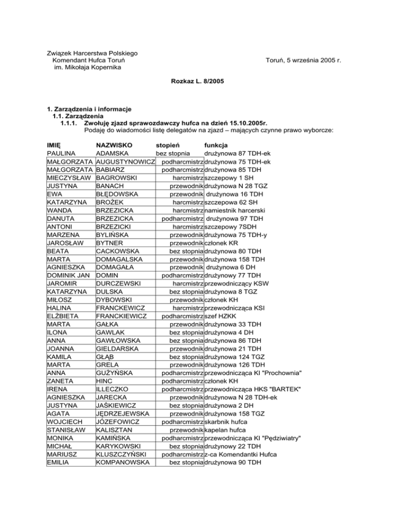 Związek Harcerstwa Polskiego Komendant Hufca Toruń im. Mikołaja Kopernika Toruń, 5 września 2005 r. Rozkaz L. 8/2005 1. Zarządzenia i informacje 1.1. Zarządzenia 1.1.1. Zwołuję zjazd sprawozdawczy hufca na dzień 15.10.2005r. Podaję do wiadomości listę delegatów na zjazd – mających czynne prawo wyborcze: IMIĘ PAULINA MAŁGORZATA MAŁGORZATA MIECZYSŁAW JUSTYNA EWA KATARZYNA WANDA DANUTA ANTONI MARZENA JAROSŁAW BEATA MARTA AGNIESZKA DOMINIK JAN JAROMIR KATARZYNA MIŁOSZ HALINA ELŻBIETA MARTA ILONA ANNA JOANNA KAMILA MARTA ANNA ZANETA IRENA AGNIESZKA JUSTYNA AGATA WOJCIECH STANISŁAW MONIKA MICHAŁ MARIUSZ EMILIA NAZWISKO stopień funkcja ADAMSKA bez stopnia drużynowa 87 TDH-ek AUGUSTYNOWICZ podharcmistrz drużynowa 75 TDH-ek BABIARZ podharcmistrz drużynowa 85 TDH BAGROWSKI harcmistrz szczepowy 1 SH BANACH przewodnik drużynowa N 28 TGZ BŁĘDOWSKA przewodnik drużynowa 16 TDH BROŻEK harcmistrz szczepowa 62 SH BRZEZICKA harcmistrz namiestnik harcerski BRZEZICKA podharcmistrz drużynowa 97 TDH BRZEZICKI harcmistrz szczepowy 7SDH BYLIŃSKA przewodnik drużynowa 75 TDH-y BYTNER przewodnik członek KR CACKOWSKA bez stopnia drużynowa 80 TDH DOMAGALSKA przewodnik drużynowa 158 TDH DOMAGAŁA przewodnik drużynowa 6 DH DOMIN podharcmistrz drużynowy 77 TDH DURCZEWSKI harcmistrz przewodniczący KSW DULSKA bez stopnia drużynowa 8 TGZ DYBOWSKI przewodnik członek KH FRANCKEWICZ harcmistrz przewodnicząca KSI FRANCKIEWICZ podharcmistrz szef HZKK GAŁKA przewodnik drużynowa 33 TDH GAWLAK bez stopnia drużynowa 4 DH GAWŁOWSKA bez stopnia drużynowa 86 TDH GIELDARSKA przewodnik drużynowa 21 TDH GŁĄB bez stopnia drużynowa 124 TGZ GRELA przewodnik drużynowa 126 TDH GUŻYŃSKA podharcmistrz przewodnicząca KI "Prochownia" HINC podharcmistrz członek KH ILLECZKO podharcmistrz przewodnicząca HKS "BARTEK" JARECKA przewodnik drużynowa N 28 TDH-ek JAŚKIEWICZ bez stopnia drużynowa 2 DH JĘDRZEJEWSKA przewodnik drużynowa 158 TGZ JÓZEFOWICZ podharcmistrz skarbnik hufca KALISZTAN przewodnik kapelan hufca KAMIŃSKA podharcmistrz przewodnicząca KI "Pędziwiatry" KARYKOWSKI bez stopnia drużynowy 22 TDH KLUSZCZYŃSKI podharcmistrz z-ca Komendantki Hufca KOMPANOWSKA bez stopnia drużynowa 90 TDH WOJCIECH LESZEK ANNA PAULINA KOSIŃSKI KOWALSKI KRAJNIK KRYSIAK DARIA URSZULA WOJCIECH LIDIA PIOTR BARTOSZ KUCHARSKA KULIK KUNA LACH LEWALSKI LEWANDOWSKI JOANNA EWELINA BŁAŻEJ KINGA MARIUSZ JOANNA ALEKSANDRA DAWID BARTOSZ MICHAŁ LUCYNA MAŁGORZATA EWA ARKADIUSZ ŁUKASZ ŁUKASZ KRYSTYNA ANNA ALEKSANDRA SZYMON PIOTR AGNIESZKA GRZEGORZ MICHAŁ KAROLINA HANNA MARCIN AGNIESZKA KAMILA ALEKSANDRA TOMASZ KRZYSZTOF ANNA MICHALINA MACIEJ JOANNA MONIKA PAULINA ADAM LIPIŃSKA MACIEJEWSKA MAJEWSKI MARULEWSKA MATUSIAK MATYASIK MIKOŁAJCZAK MROCZKOWSKI MYSZKOWSKI NODZYŃSKI OSIŃSKA OSIŃSKA PALUDA PAPROCKI PIERZCHALSKI RACŁAWSKI RĘBACZ ROMANOWSKA RONOWSKA RUTKOWSKI RYCZKOWSKI RYDLEWSKA SAGAN SALA SPASIUK STACHOWSKA SZTYGOWSKI SZUMOTALSKA TRAWIŃSKA TRĘDEWICZ ULASZEWSKI WALIŃSKI WĘGLEWSKA WSZELAKI ZAJĄC ZAKRZEWSKA ZDANOWICZ ZIELIŃSKA ZIÓŁKOWSKI przewodnik przewodniczący KI "Pokolenie Kolumbów" przewodnik drużynowy 23 TDH bez stopnia drużynowa 124 TDH-ek "Aqua Immortales" bez stopnia drużynowa 88 TDH otwarta próba pwd. drużynowa 83 TDH harcmistrz przewodnicząca KR harcmistrz drużynowy 99 TDH harcmistrz Komendantka Hufca podharcmistrz szczepowy 81 bez stopnia drużynowy 88 TDW otwarta próba pwd. drużynowa 15 TDH przewodnik drużynowa 124 TDH-ek przewodnik członek KH przewodnik drużynowa 158 TDW przewodnik przewodniczący KKI "Wicek" podharcmistrz członek KH bez stopnia drużynowa 88 TDSH bez stopnia drużynowy 26 TDH podharcmistrz drużynowy 124 TDW przewodnik przew. KSW przy 7 SH przewodnik drużynowa 27 TDH przewodnik drużynowa 18 TDH-ek podharcmistrz drużynowa 56 TDH przewodnik kwatermistrz hufca podharcmistrz członek KR bez stopnia drużynowy 17 TDH podharcmistrz przewodnicząca KI "Granatowa 10" przewodnik przewodnicząca KI "Rozewie" przewodnik drużynowa 81 TDH przewodnik drużynowy 87 TDH-y bez stopnia drużynowy 124 TDH-y przewodnik drużynowa 50 TDW przewodnik szef HKR bez stopnia drużynowy 5 DH przewodnik przewodnicząca KSW przy 15 TDH podharcmistrz drużynowa 84 DH przewodnik drużynowy 127 TDH bez stopnia drużynowa 7 SGZ przewodnik drużynowa 93 TDH bez stopnia drużynowa 51 TGZ przewodnik szczepowy 24 SH bez stopnia drużynowy 20 TDH przewodnik szczepowa 25 SH przewodnik członek KR podharcmistrz drużynowy 98 TODH HDP bez stopnia drużynowa 19 TDH-ek przewodnik drużynowa 50 TGZ bez stopnia drużynowa 35 TDH przewodnik drużynowy N 28 TDH -y Informuję, że bierne prawo wyborcze mają wszyscy instruktorzy ZHP z przydziałem służbowym do Hufca ZHP Toruń z zaliczoną służbą instruktorską za poprzedni rok. Od listy delegatów na zbiórkę wyborczą można odwoływać się w ciągu 7 dni do Komendanta Hufca (pkt. 34 rodział V Ordynacji Wyborczej ZHP). 1.2. Informacje 1.2.1. Informuję, że w dniach 7-14.09.2005r. w godzinach 1300 – 1500 w sali kominkowej „Domu Harcerza” odbędzie się wystawa dh. Zbyszka Cieszyńskiego. 1.2.2. Informuję, że w dniu 09.09.2005r. o godzinie 1700 w sali Mieszczańskiej odbędą się obchody 66-tej rocznicy aresztowania bł. Ks. W. Frelichowskiego 1.2.3. Informuję, że we wrześniu biuro komendy hufca czynne będzie w następujących godzinach: Pon. – 1400 - 1900 Wt. – 1400 - 1900 Śr. – 1400 - 1700 Czw. – 1100 - 1400 Pt. – 1100 - 1400 2. Hufiec 2.1 Zwolnienia w komendzie hufca 2.2 Mianowania w komendzie hufca 2.3 Powołanie i rozwiązanie sztabów, komisji, komend kursów 3. Drużyny 3.1. Nadanie imion, nazw, sztandarów 3.2. Zmiany organizacyjne 3.3. Zwolnienia i mianowania drużynowych 4. Kręgi 4.1. Rozwiązania i powołania kręgów 4.2. Zwolnienia i mianowania w kręgach 4.2.1. Zwalniam z funkcji przewodniczącej SKI – pwd. Annę Frąckowską 4.2.2. Mianuję na funkcje przewodniczącej SKI – pwd. Luc