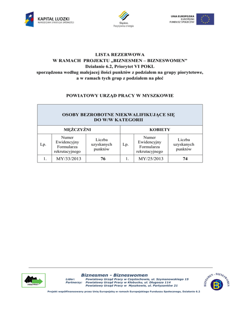 LISTA REZERWOWA W RAMACH PROJEKTU „BIZNESMEN – BIZNESWOMEN” Działanie 6.2, Priorytet VI POKL sporządzona według malejacej ilości punktów z podziałem na grupy piorytetowe, a w ramach tych grup z podziałem na płeć POWIATOWY URZĄD PRACY W MYSZKOWIE OSOBY BEZROBOTNE NIEKWALIFIKUJĄCE SIĘ DO W/W KATEGORII MĘŻCZYŹNI Lp. Numer Ewidencyjny Formularza rekrutacyjnego 1. MY/33/2013 KOBIETY Liczba uzyskanych punktów 76 Lp. Numer Ewidencyjny Formularza rekrutacyjnego 1. MY/25/2013 Liczba uzyskanych punktów 74 Biznesmen - Bizneswomen Lider: Partnerzy: Powiatowy Urząd Pracy w Częstochowie, ul. Szymanowskiego 15 Powiatowy Urząd Pracy w Kłobucku, ul. Długosza 114 Powiatowy Urząd Pracy w Myszkowie, ul. Partyzantów 21 Projekt współfinansowany przez Unię Europejską w ramach Europejskiego Funduszu Społecznego, Działanie 6.2