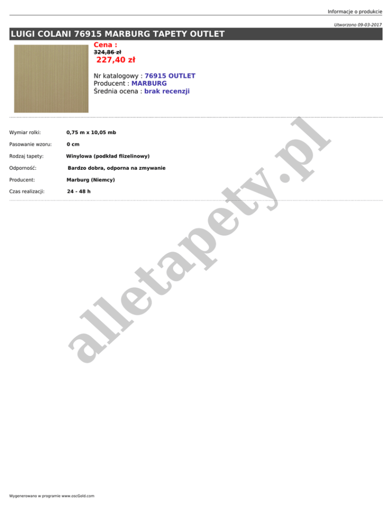Informacje o produkcie Utworzono 09-03-2017 LUIGI COLANI 76915 MARBURG TAPETY OUTLET Cena : 324,86 zł 227,40 zł 0,75 m x 10,05 mb Pasowanie wzoru: 0 cm Rodzaj tapety: Winylowa (podkład flizelinowy) Odporność: Bardzo dobra, odporna na zmywanie Producent: Marburg (Niemcy) Czas realizacji: 24 - 48 h al le ta pe ty Wymiar rolki: .p l Nr katalogowy : 76915 OUTLET Producent : MARBURG Średnia ocena : brak recenzji Wygenerowano w programie www.oscGold.com