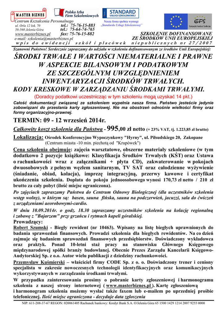 Centrum Kształcenia Personalnego ul. Orla 12 lok. 70 58-560 Jelenia Góra tel.: 75-76-15-883 tel.: 75-64-74-765 fax: 75-76-15-882 Nasza firma spełnia wymogi „Standardu Usługi Szkoleniowej” www.masterbiznes.pl e-mail: [email protected] wpis do ewidencji szkół i placówek SZKOLENIE DOFINANSOWANE ZE ŚRODKÓW UNII EUROPEJSKIEJ niepublicznych nr 27/2007 Szanowni Państwo! Serdecznie zapraszamy do udziału w szkoleniu dofinansowanym ze środków Unii Europejskiej: ŚRODKI TRWAŁE I WARTOŚCI NIEMATERIALNE I PRAWNE W ASPEKCIE BILANSOWYM I PODATKOWYM ZE SZCZEGÓLNYM UWZGLĘDNIENIEM INWENTARYZACJI ŚRODKÓW TRWAŁYCH. KODY KRESKOWE W ZARZĄDZANIU ŚRODKAMI TRWAŁYMI. (Doradcy podatkowi uczestnicząc w tym szkoleniu mogą uzyskać 14 pkt.) Całość dokumentacji związanej ze szkoleniem wypełnia nasza firma. Państwo jesteście jedynie zobowiązani do przesłania karty zgłoszeniowej. Nie ma obostrzeń odnośnie wielkości firmy oraz formy organizacyjno-prawnej. TERMIN: 09 - 12 wrzesień 2014r. Całkowity koszt szkolenia dla Państwa - 995,00 zł netto (+ 23% VAT, tj. 1.223,85 zł brutto) Lokalizacja: Ośrodek Konferencyjno Wypoczynkowy "Hyrny", ul. Piłsudskiego 20, Zakopane (Centrum miasta -10 min. piechotą od "Krupówek") Cena szkolenia obejmuje: zajęcia warsztatowe, obszerne materiały szkoleniowe (w tym dodatkowo 2 pozycje książkowe: Klasyfikacja Środków Trwałych (KŚT) oraz Ustawa o rachunkowości wraz z załącznikami + płyta CD), zakwaterowanie w pokojach dwuosobowych z pełnym węzłem sanitarnym, TV SAT oraz całodzienne wyżywienie (śniadanie, obiad, kolacja), imprezę integracyjną, przerwy kawowe i certyfikat ukończenia szkolenia. Dopłata do pokoju jednoosobowego wynosi 170,73 zł netto / 210 zł brutto za cały pobyt (ilość miejsc ograniczona). Po zajęciach zapraszamy Państwa do Centrum Odnowy Biologicznej (dla uczestników szkolenia wstęp wolny), w którym są: basen, sauna fińska, sauna na podczerwień, jacuzzi, sala do ćwiczeń z urządzeniami aeorobowymi-cardio. W dniu 10.09.2014r. o godz. 18.30 zapraszamy uczestników szkolenia na kolację regionalną i zabawę z "Bajarzem" przy grzańcu i rytmach kapeli góralskiej. Prowadzący: Robert Szumski - Biegły rewident (nr 10463). Wpisany na listę biegłych uprawnionych do badania sprawozdań finansowych. Prowadzi szkolenia dla biegłych rewidentów. Na co dzień zajmuje się badaniem sprawozdań finansowych przedsiębiorstw. Doświadczony wykładowca oraz praktyk. Ponad 10-letni staż pracy na stanowisku Głównego Księgowego międzynarodowej spółki branży budowlanej. Obecnie Prezes Zarządu Kancelarii KsięgowoAudytorskiej Sp. z o.o. Autor wielu publikacji z dziedziny rachunkowości. Przemysław Kuśmierski – właściciel firmy CODE Sp. z o. o. Doświadczony trener i ceniony specjalista w zakresie nowoczesnych technologii identyfikacyjnych oraz komunikacyjnych wykorzystywanych w zarządzaniu środkami trwałymi. W przypadku zainteresowania prosimy o pobranie karty zgłoszeniowej i harmonogramu szkolenia z naszej strony internetowej ( www.masterbiznes.pl ). Kartę zgłoszeniową i harmonogram szkolenia możemy wysłać także faxem lub e-mailem po uprzedniej prośbie telefonicznej. Ilość miejsc ograniczona - decyduje data zgłoszenia NIP: 611-208-37-67 REGON: 020061405 Rachunek bankowy: Kredyt Bank S.A. O/Jelenia Góra 65 1500 1429 1214 2007 9255 0000 Centrum Kształcenia Personalnego ul. Orla 12 lok. 70 58-560 Jelenia Góra tel.: 75-76-15-883 tel.: 75-64-74-765 fax: 75-76-15-882 Nasza firma spełnia wymogi „Standardu Usługi Szkoleniowej” www.masterbiznes.pl e-mail: [email protected] wpis do ewidencji 1 szkół i placówek SZKOLENIE DOFINANSOWANE ZE ŚRODKÓW UNII EUROPEJSKIEJ niepublicznych nr 27/2007 PROGRAM SZKOLENIA I. Środki trwałe. 1.Definicja środka trwałego oraz podobieństwa i różnice między pojęciami środków trwałych w prawie bilansowym i podatkowym – regulacje prawne, interpretacja i zastosowanie. 2. Ustalenie wartości początkowej oraz przyjęcie środka trwałego do eksploatacji: a) z zakupu, w tym z importu (wartość celna, opłaty, różnice kursowe, odsetki, zakup na raty), b) przez wytworzenie we własnym zakresie, c) w wyniku ulepszenia, modernizacji, rozbudowy (różnice w pojęciach ulepszenia i remontu oraz naprawy środków trwałych, części składowe i peryferyjne jako składniki kosztów eksploatacji środków trwałych). 3. Inne formy przyjęcia środka trwałego: a)leasing finansowy i operacyjny, najem, dzierżawa, przewłaszczenie, użyczenie (najkorzystniejsze zasady rozliczeń podatkowych), b) środki trwałe nabyte nieodpłatnie (zwrot wydatków na nabycie – zasady rozliczeń podatkowych). 4. Inwestycje w obcych środkach trwałych. 5. Likwidacja środków trwałych. 6. Sprzedaż i nieodpłatne przekazanie środków trwałych-zasady ustalania Kup przy sprzedaży. 7. Obrót środkami trwałymi w rozumieniu Ustawy o VAT (eksport, import, leasing finansowy i operacyjny, itp.) 8.Ewidencja środków trwałych. II. Wartości niematerialne i prawne. 1. Definicja wartości niematerialnych i prawnych, w tym ulepszenia. 2. Szczególne rodzaje wartości niematerialnych i prawnych – np. licencje, know-how, royality. 3. Ewidencja wartości niematerialnych i prawnych. 4. Wycena wartości niematerialnych i prawnych na dzień pozyskania i na dzień bilansowy. III. Amortyzacja środków trwałych oraz wartości niematerialnych i prawnych. 1. Ogólne pojęcie amortyzacji i umorzenia. 2. Amortyzacja bilansowa oraz podatkowa jako koszt uzyskania przychodów. 3. Metody naliczania i ustalania amortyzacji, w tym stawki indywidualne, podwyższone i obniżone - metoda liniowa, metoda degresywna i degresywno-liniowa, metoda progresywna, metoda proporcjonalna. 4. Dopuszczalność poszczególnych metod amortyzacji a przepisy podatkowe. Amortyzacja samochodów. 5. Zasady dokonywania odpisów amortyzacyjnych i ich wpływ na optymalizację obciążeń podatkowych. 6. Amor