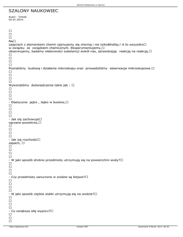 Szkoła Podstawowa w Łęknicy SZALONY NAUKOWIEC Autor: Tomek 02.01.2014. Na zajęciach z elementami chemii zajmujemy się chemią i nie tylko…! A to wszystko w związku ze związkiem chemicznym. Eksperymentujemy, obserwujemy, badamy właściwości substancji wokół nas, sprawdzając reakcję na reakcję. Poznaliśmy budowę i działanie mikroskopu oraz prowadziliśmy obserwacje mikroskopowe. Wykonaliśmy doświadczenia takie jak : - Elastyczne jajko , Jajko w butelce, - Jak się zachowuje ogrzane powietrze, - Jak się rozchodzi zapach, - W jaki sposób drobne przedmioty utrzymują się na powierzchni wody? - Czy przedmioty zanurzone w wodzie są lżejsze? - W jaki sposób ciężkie statki utrzymują się na wodzie? - Co zwiększa siłę wyporu? http://spleknica.info Kreator PDF Utworzono 9 March, 2017, 00:30 Szkoła Podstawowa w Łęknicy - Jak woda naciska na ścianki naczynia? - Czy ciśnienie wody zależy od głębokości? - Czy można zmniejszyć objętość powietrza? Ale to nie koniec naszych doświadczeń GALERIA ZDJĘĆ http://spleknica.info Kreator PDF Utworzono 9 March, 2017, 00:30