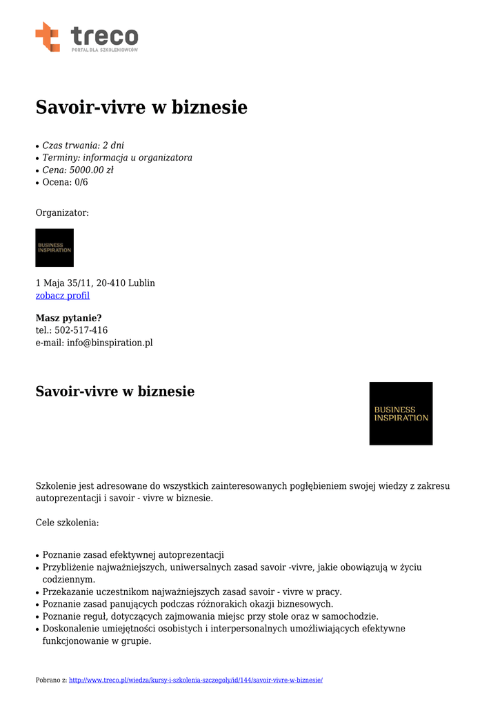 Savoir-vivre w biznesie ● ● ● ● Czas trwania: 2 dni Terminy: informacja u organizatora Cena: 5000.00 zł Ocena: 0/6 Organizator: 1 Maja 35/11, 20-410 Lublin zobacz profil Masz pytanie? tel.: 502-517-416 e-mail: [email protected] Savoir-vivre w biznesie Szkolenie jest adresowane do wszystkich zainteresowanych pogłębieniem swojej wiedzy z zakresu autoprezentacji i savoir - vivre w biznesie. Cele szkolenia: ● ● ● ● ● ● Poznanie zasad efektywnej autoprezentacji Przybliżenie najważniejszych, uniwersalnych zasad savoir -vivre, jakie obowiązują w życiu codziennym. Przekazanie uczestnikom najważniejszych zasad savoir - vivre w pracy. Poznanie zasad panujących podczas różnorakich okazji biznesowych. Poznanie reguł, dotyczących zajmowania miejsc przy stole oraz w samochodzie. Doskonalenie umiejętności osobistych i interpersonalnych umożliwiających efektywne funkcjonowanie w grupie. Pobrano z: http://www.treco.pl/wiedza/kursy-i-szkolenia-szczegoly/id/144/savoir-vivre-w-biznesie/ ● Przybliżenie najważniejszych aspektów z zakresu mowy ciała. Omówienie zasad dotyczących profesjonalnego stroju w biznesie. Program 1. 2. 3. 4. 5. 6. 7. 8. 9. 10. 11. 12. 13. 14. 15. 16. 17. 18. Pojęcie i istota filozofii savoir – vivre. Wizerunek w biznesie– autoprezentacja. Kreowanie image’u własnej osoby w kontekście wykonywanego zawodu i obowiązków. Uświadomienie dotychczasowych nawyków sprzyjających korzystnej autoprezentacji oraz obszarów wymagających poprawy. Umiejętność doboru optymalnych rozwiązań w celu poprawy własnego wyglądu. Ubiór w biznesie - czyli "Jak cię widzą, tak cię piszą". Uświadomienie istoty mowy ciała – zachowania niewerbalne. Gadżety w trakcie spotkań. Umiejętność usunięcia niekorzystnych gestów. Właściwe przygotowanie i publiczne prezentowanie wypowiedzi. Umiejętność radzenia sobie z tremą. Powitanie – zasady podawania ręki. Przedstawianie gości/ współpracowników/ klientów. Spotkania i przyjęcia. Kolacje i bankiety – zachowania przy stole. Prowadzenie rozmów biznesowych podczas wspólnych posiłków. Wyjazdy służbowe, przyjmowanie delegacji. Wpadki i gafy. Prowadzący Patrycja Korpacka – psycholog, trener biznesu, certyfikowany coach. Absolwentka studiów podyplomowych „Trener Biznesu” oraz „Zarządzanie Zasobami Ludzkimi” na Uniwersytecie Jagiellońskim w Krakowie. Posiada liczne certyfikaty potwierdzające jej ciągły rozwój w kierunku trenerstwa, coachingu oraz umiejętności interpersonalnych. Uczestniczka „Akademii Profesjonalnego Coachingu” organizowanego w Lublinie przez Europejski Instytut Psychologii Biznesu. Dotychczas współtworzyła liczne projekty szkoleniowe. Zajmowała się także organizacją, rekrutacją i promocją, realizując różne projekty zarówno komercyjne jak i współfinansowane ze środków UE. Kierując powyższymi przedsięwzięciami odpowiadała za stronę finansową, organizacyjną oraz merytoryczną. Jednocześnie pracowała jako trener freelancer współpracując z licznymi firmami szkoleniowymi w Polsce. Jest również wykładowcą w Wyższej Szkole Przedsiębiorczości i Administracji w Lublinie, prowadząca zajęcia dla słuchaczy studiów podyplomowych „Trener Biznesu”. Jej zajęcia cechuje niezwykłe zaangażowanie w ich prowadzenie. Są motywacyjne, dynamiczne, a zarazem merytoryczne. Zajmuje się współpracą z różnymi przedsiębiorstwami, gdzie do jej głównych zadań należy budowanie lub/i wspieranie rozwoju działów szkoleń. Współpracowała z takimi firmami jak: T – mobile, Capital Service, Żywiec Sprzedaż I Dystrybucja, Mary Kay Ash, Cersanit, Jysk, BP, Urząd Marszałkowski W Lublinie, Urząd Miasta Jasło, Slawex Hurtownia Farmaceutyczna, Super –Pharm, PMB S.A., Nexa, Top S.A. Tektura, TÜV Akademia Pobrano z: http://www.treco.pl/wiedza/kursy-i-szkolenia-szczegoly/id/144/savoir-vivre-w-biznesie/ Polska, Academy Q, Cersanit, Wajnert Meble, Rekpol Śląskie Centrum Florystyczne, Hager – Polo, Vidi Centrum Rozwoju Kadr i wiele innych. Specjalizuje się w tematach dotyczących: psychologii sprzedaży, zarządzania zasobami ludzkimi, umiejętności menedżerskich, komunikacji interpersonalnej, budowania samodoskonalącej się organizacji, asertywności, automotywacji i inteligencji emocjonalnej w biznesie, radzenia sobie ze stresem, kreatywności, zarządzania sobą w czasie, umiejętności trenerskich oraz profesjonalnej prezentacji. Jej dewizą życiową jest wytrwałość i pozytywne myślenie, co odzwierciedla jej ulubiony cytat „Wielu życiowych rozbitków to ludzie, którzy nie zdawali sobie sprawy, jak bliscy są sukcesu, kiedy się poddali.” -Thomas Edison. Taka postawa pozwala jej nieustannie dążyć do celu, realizować swoje marzenia, a wszelkie niepowodzenia traktować jak kolejne wartościowe doświadczenia, z których można się wiele nauczyć i które dzieją się tylko po to, aby nam pomagać. Terminy informacje u organizatora Miejsce cała Polska Cena 5.000 zł za 2 dni szkoleniowe Kontakt Karolina Dec [email protected] 502 517 416 Informacje dodatkowe www.binspiration.pl Pobrano z: http://www.treco.pl/wiedza/kursy-i-szkolenia-szczegoly/id/144/savoir-vivre-w-biznesie/