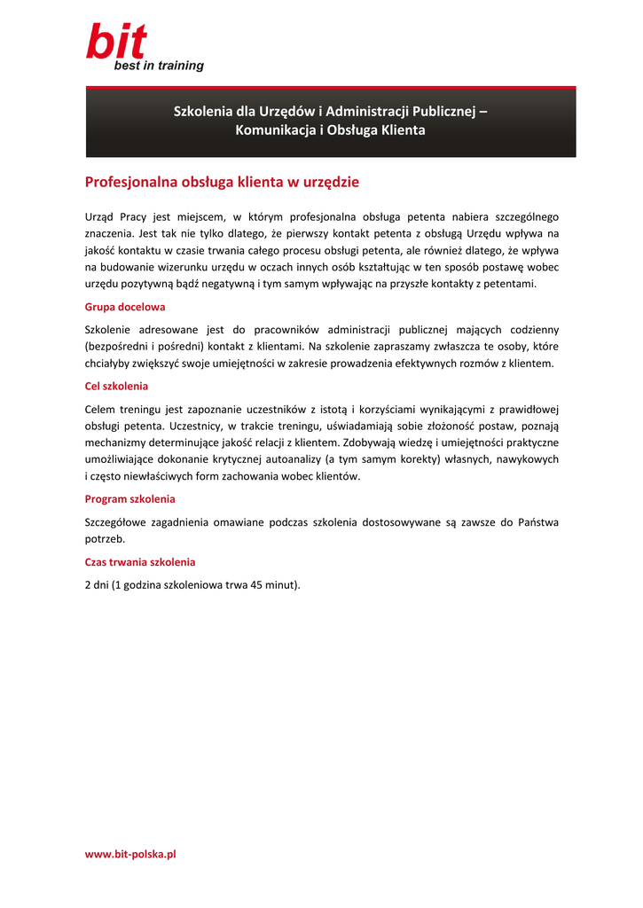 Szkolenia dla Urzędów i Administracji Publicznej – Komunikacja i Obsługa Klienta Profesjonalna obsługa klienta w urzędzie Urząd Pracy jest miejscem, w którym profesjonalna obsługa petenta nabiera szczególnego znaczenia. Jest tak nie tylko dlatego, że pierwszy kontakt petenta z obsługą Urzędu wpływa na jakośd kontaktu w czasie trwania całego procesu obsługi petenta, ale również dlatego, że wpływa na budowanie wizerunku urzędu w oczach innych osób kształtując w ten sposób postawę wobec urzędu pozytywną bądź negatywną i tym samym wpływając na przyszłe kontakty z petentami. Grupa docelowa Szkolenie adresowane jest do pracowników administracji publicznej mających codzienny (bezpośredni i pośredni) kontakt z klientami. Na szkolenie zapraszamy zwłaszcza te osoby, które chciałyby zwiększyd swoje umiejętności w zakresie prowadzenia efektywnych rozmów z klientem. Cel szkolenia Celem treningu jest zapoznanie uczestników z istotą i korzyściami wynikającymi z prawidłowej obsługi petenta. Uczestnicy, w trakcie treningu, uświadamiają sobie złożonośd postaw, poznają mechanizmy determinujące jakośd relacji z klientem. Zdobywają wiedzę i umiejętności praktyczne umożliwiające dokonanie krytycznej autoanalizy (a tym samym korekty) własnych, nawykowych i często niewłaściwych form zachowania wobec klientów. Program szkolenia Szczegółowe zagadnienia omawiane podczas szkolenia dostosowywane są zawsze do Paostwa potrzeb. Czas trwania szkolenia 2 dni (1 godzina szkoleniowa trwa 45 minut). www.bit-polska.pl